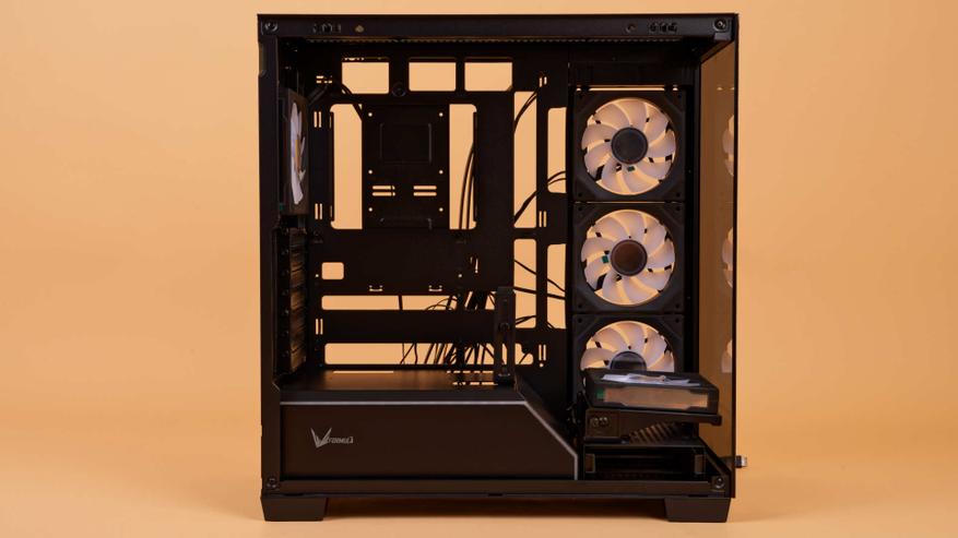 Чтобы в полной мере оценить внутреннее пространство корпуса Crystal Z8G Floe, лучше всего снять все съёмные панели. Внутри кожух блока питания условно делит корпус на две зоны: основную — для ключевых компонентов, и скрытую камеру — для проводов и самого блока питания. Над кожухом блока питания находится посадочное место под материнскую плату типоразмера вплоть до E-ATX, включая модели со скрытым подводом кабелей. Это ещё один весомый плюс для аккуратного монтажа и красивой сборки. Расстояние от верхней стенки до материнской платы составляет 45 мм, поэтому материнские платы с широкими радиаторами зоны VRM могут помешать установке СЖО. Что касается охлаждения процессора, владелец Crystal Z8G Floe, то максимальная высота башенного кулера не должна превышать 182 мм. Дополнительное место для установки системы жидкостного охлаждения предусмотрено с правой стороны от материнской платы при условии снятия предустановленных трех 120-мм реверсивных вентиляторов.
