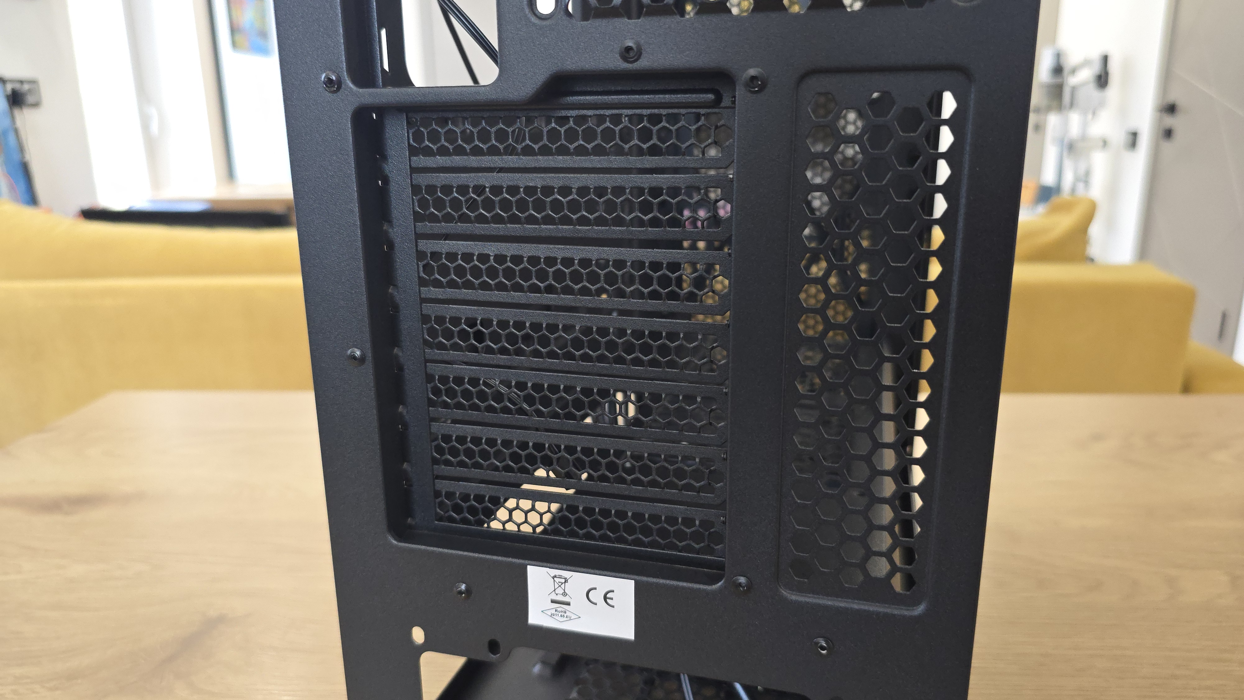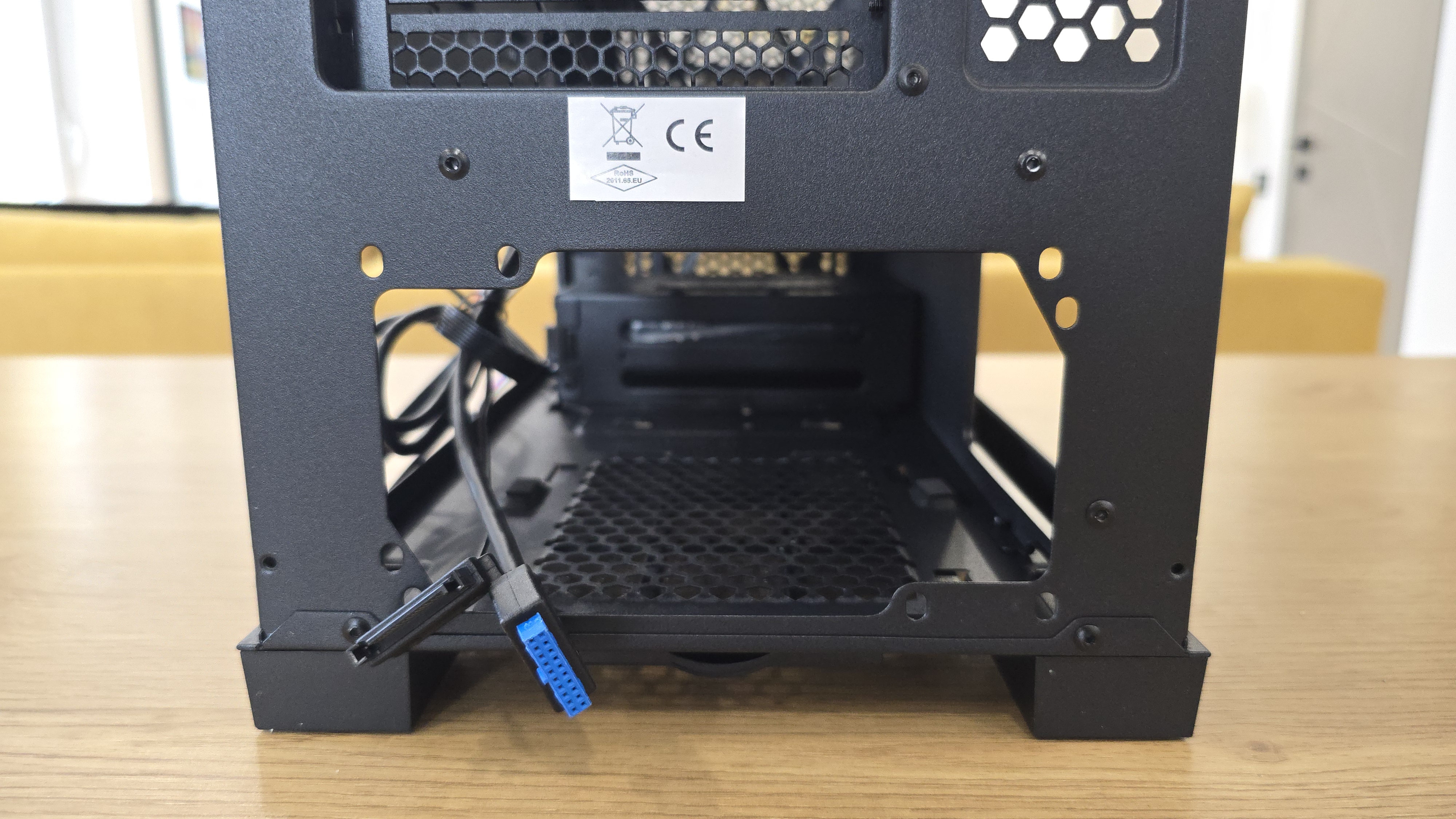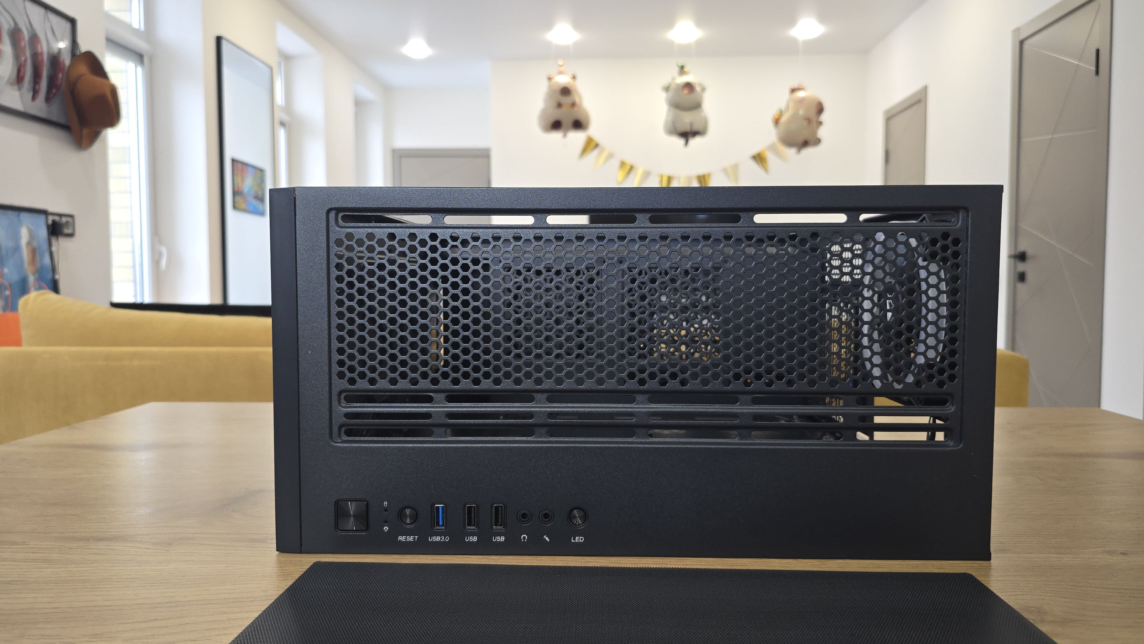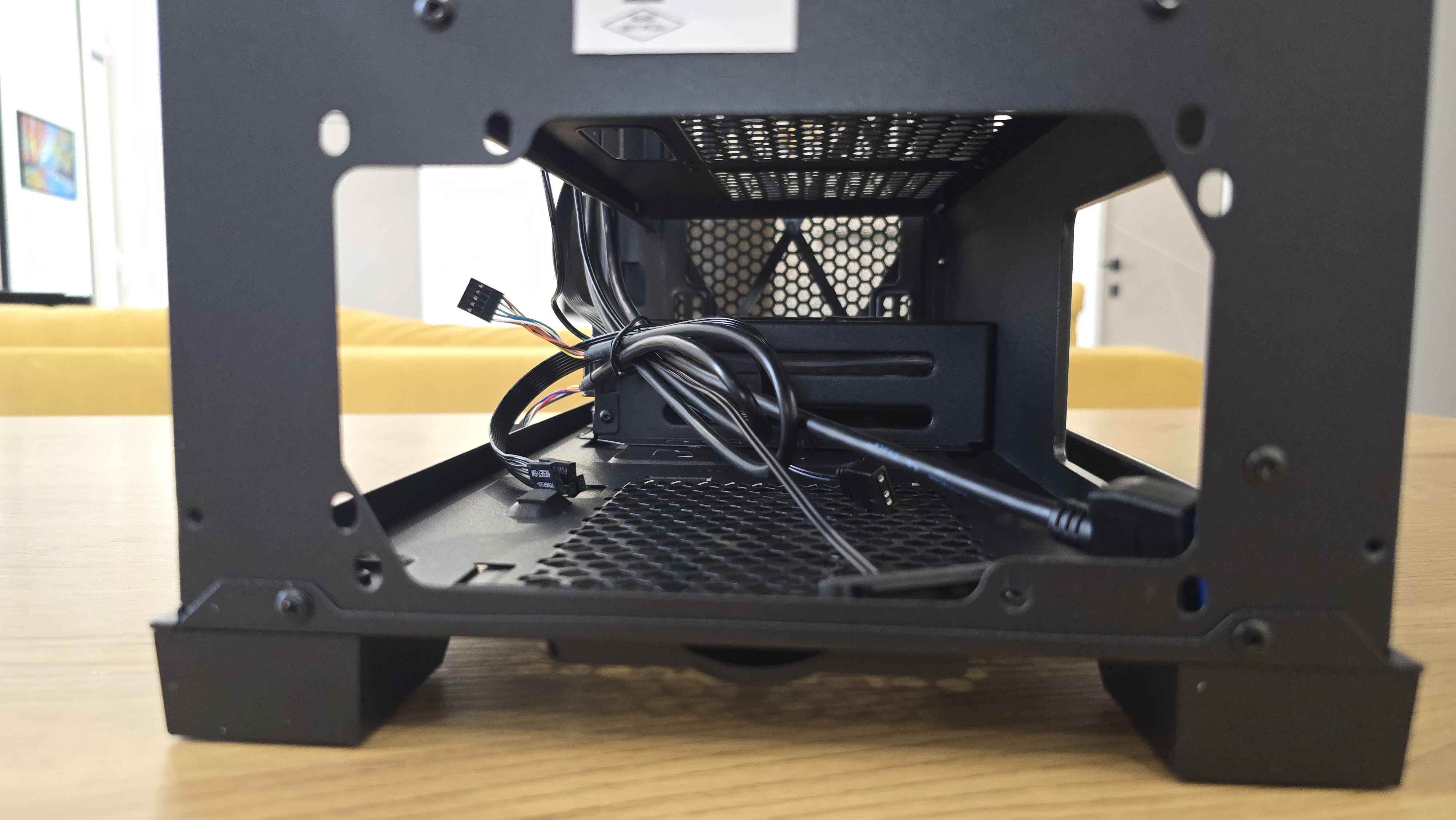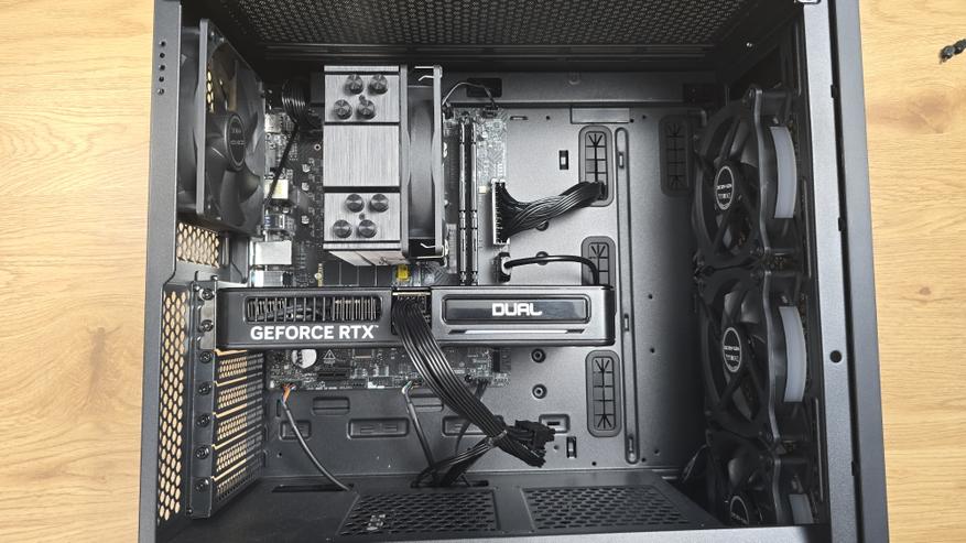 При такой конфигурации хорошо видно, как корпус распределяет внутренний объем. Материнская плата формата micro-ATX занимает центральную часть монтажной панели, но вокруг нее остается заметный запас пространства. Правая часть корпуса, между платой и фронтальной стенкой, остается практически свободной. Здесь проходят кабельные вводы, через которые подведено питание и интерфейсные провода. Даже после подключения кабелей эта зона не выглядит перегруженной и сохраняет аккуратную геометрию.