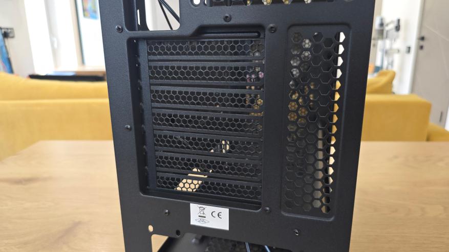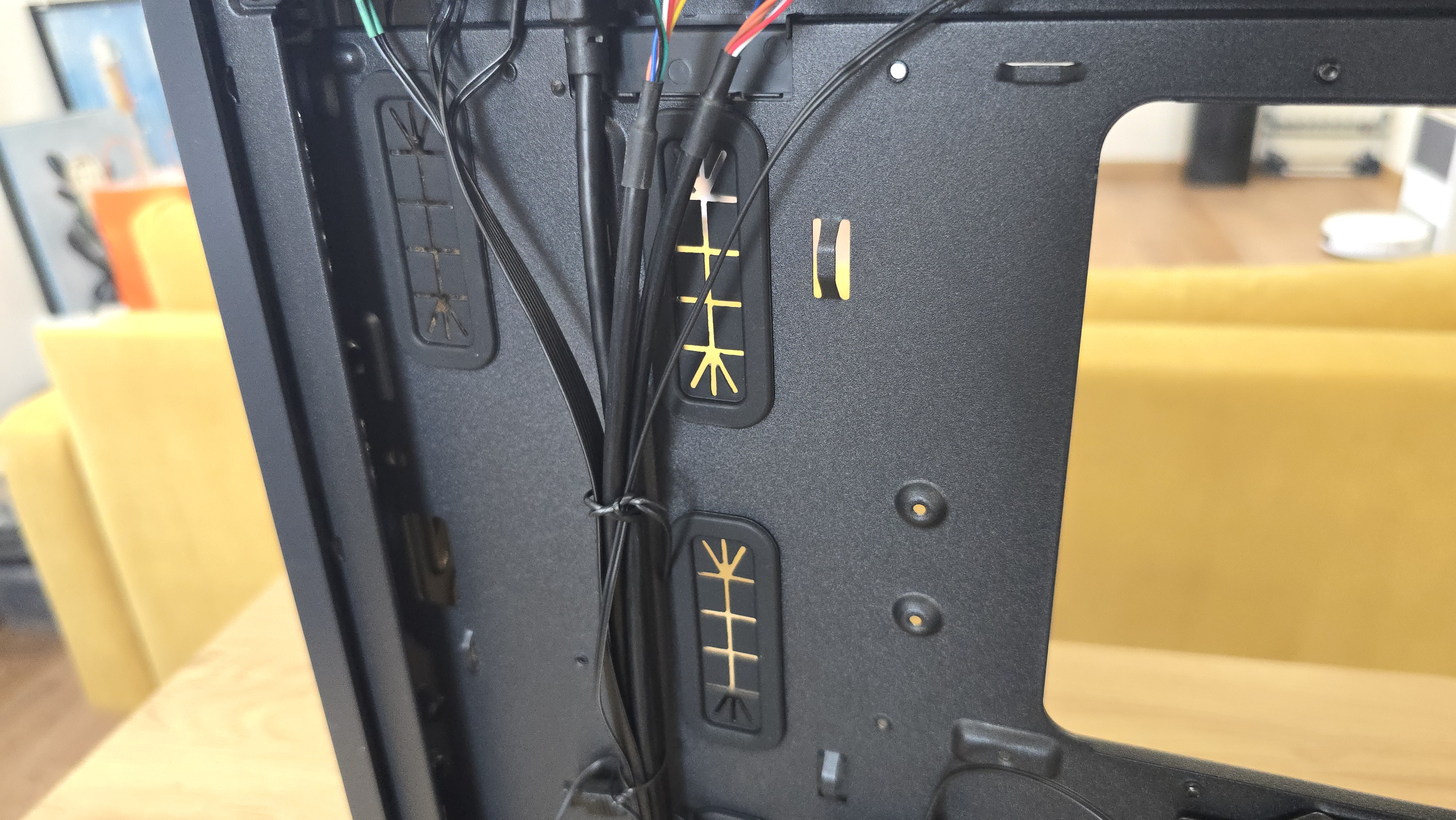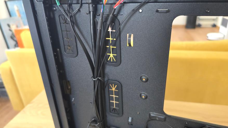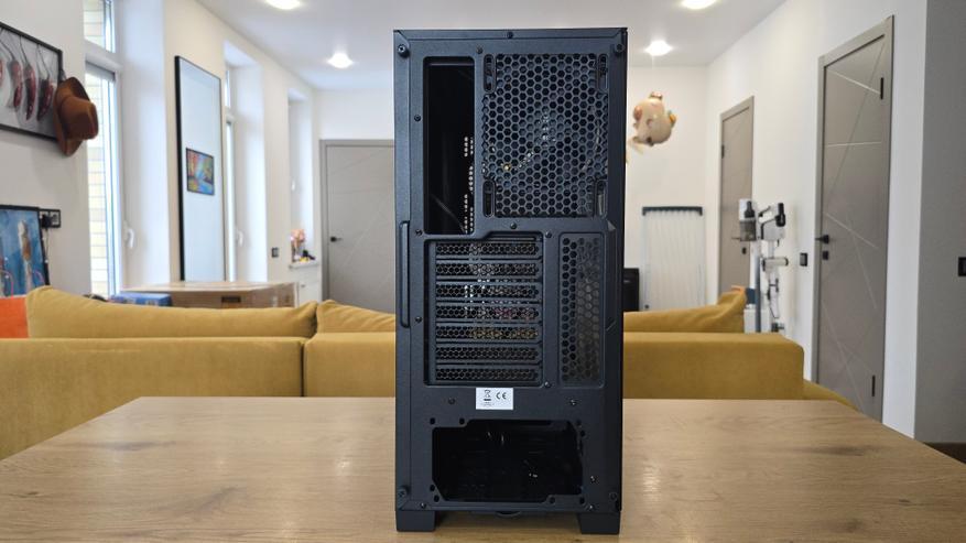Отдельно стоит отметить пространство за монтажной панелью. Даже при установленном блоке питания и подключенных кабелях здесь остается достаточно места, чтобы аккуратно уложить проводку. За счет этого внутренняя часть корпуса выглядит аккуратно и не перегружена проводами.