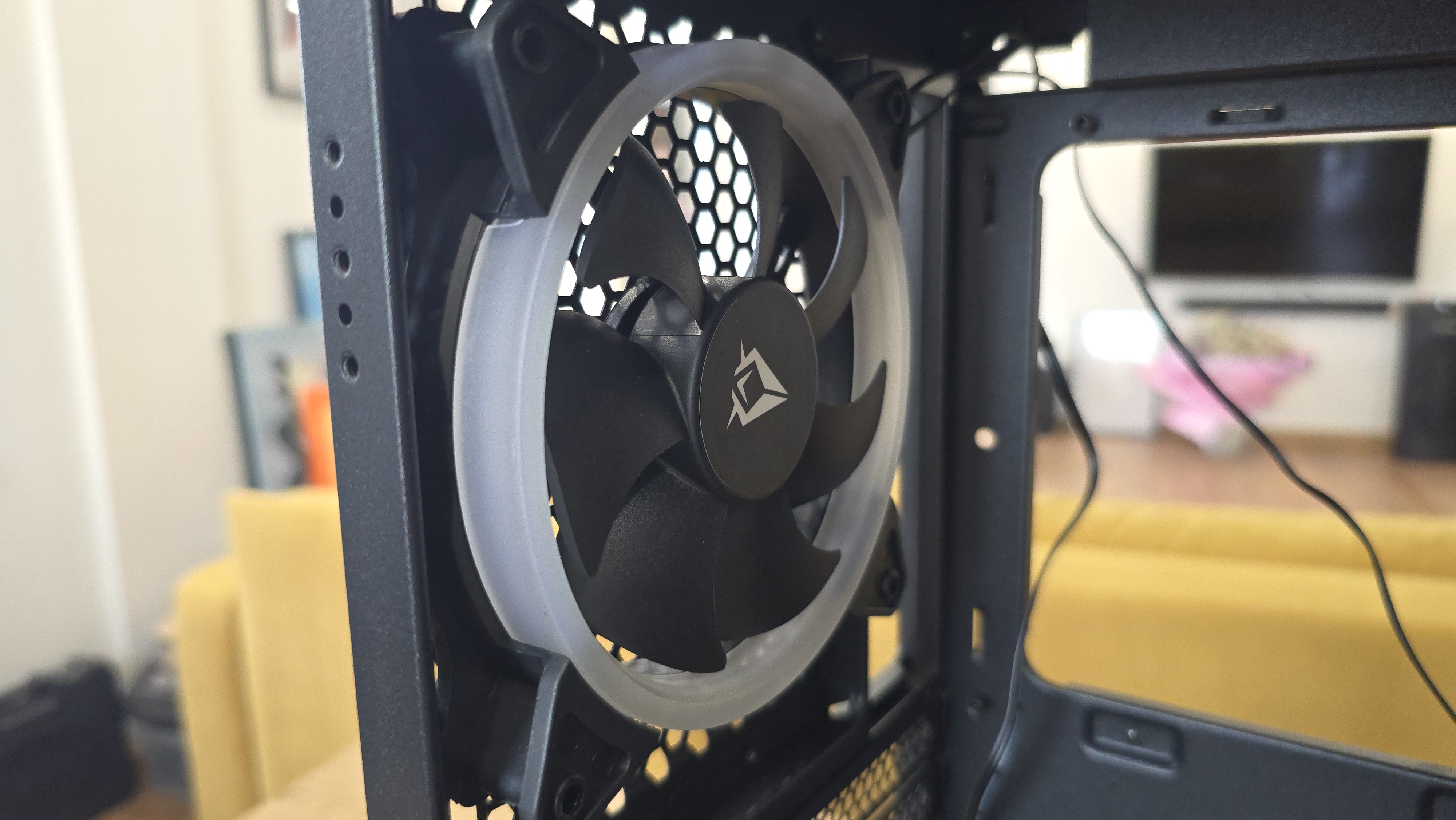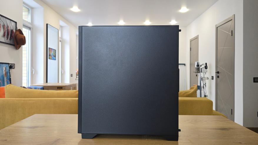 Левая боковая панель выполнена из закаленного стекла. Она съемная, крепится винтами и установлена в металлическую рамку, что добавляет жесткости. Через стекло открывается доступ к основной рабочей зоне. Здесь видна классическая компоновка: материнская плата устанавливается в стандартной ориентации, над ней — верхняя зона вентиляции, спереди — пространство под фронтальные вентиляторы или радиатор, сзади — посадочное место под 120 мм вентилятор, один из которых установлен с ARGB-подсветкой. Максимальная длина видеокарты достигает 360 мм, высота процессорного кулера — до 165 мм. Пространство внутри не перегружено, поэтому видеокарта и башенный кулер размещаются без конфликтов по геометрии.