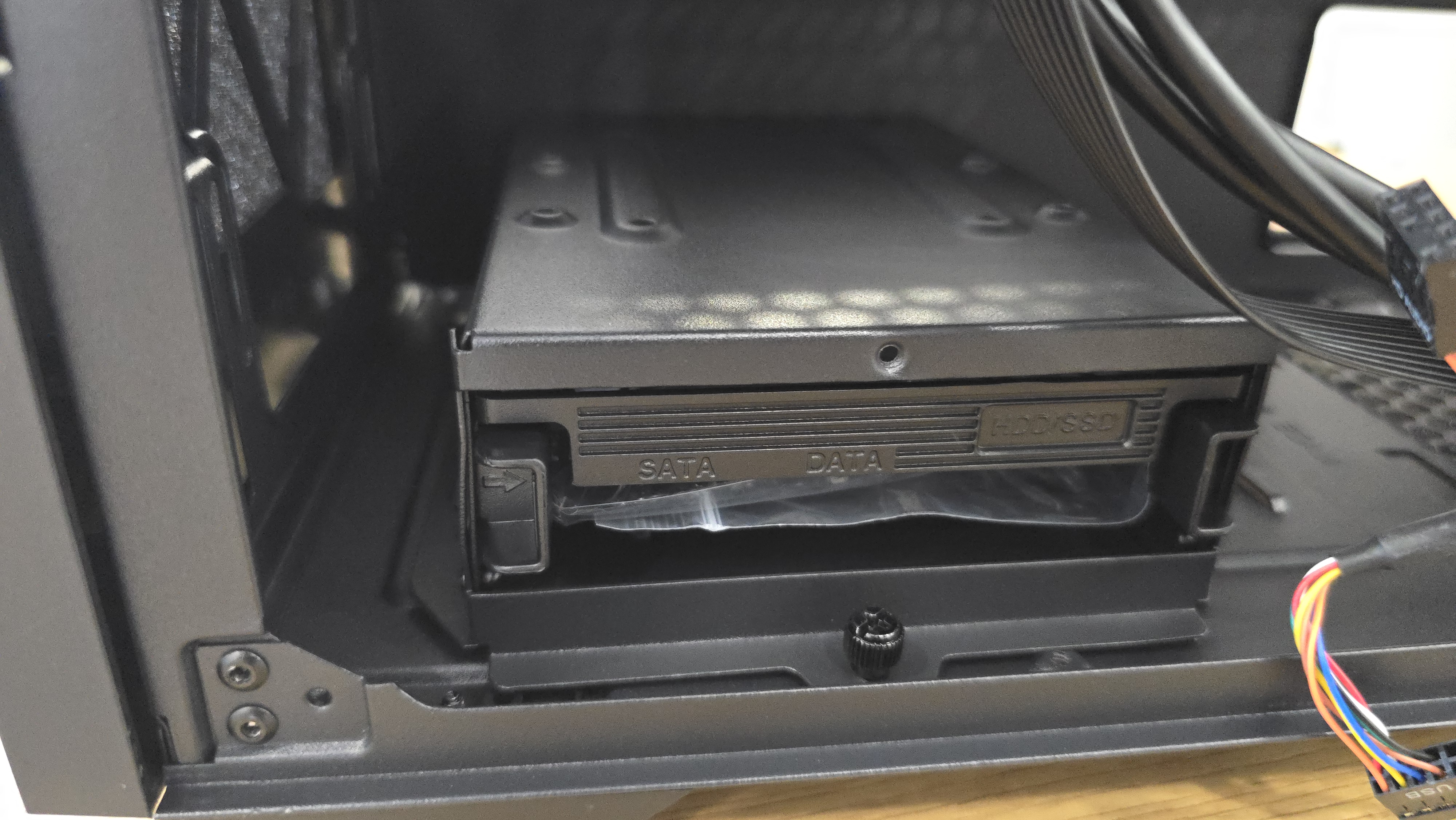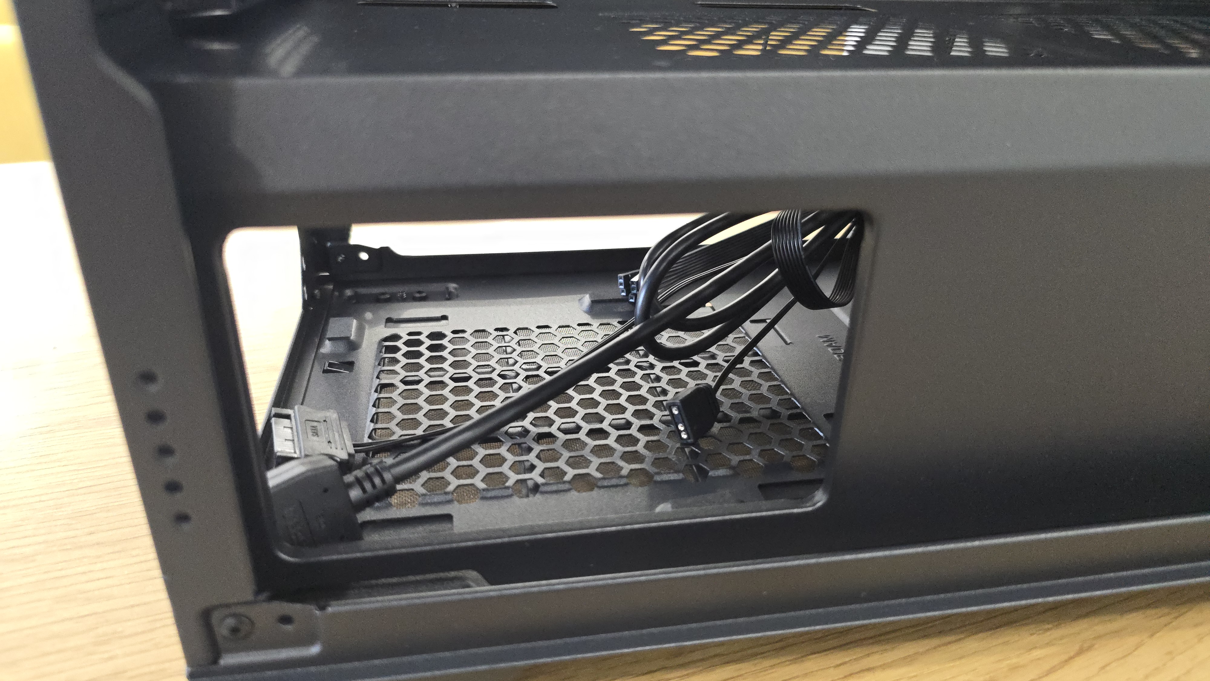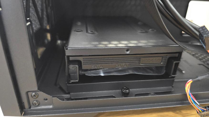 Нижняя часть отделена кожухом блока питания. Блок устанавливается снизу, забор воздуха осуществляется через стальной фильтр в основании корпуса. Также здесь расположена зона для накопителей. Корзина поддерживает установку 3.5-дюймового жесткого диска либо 2.5-дюймового SSD, дополнительно предусмотрено универсальное крепление такого же типа. Таким образом можно разместить до двух 3.5-дюймовых устройств.