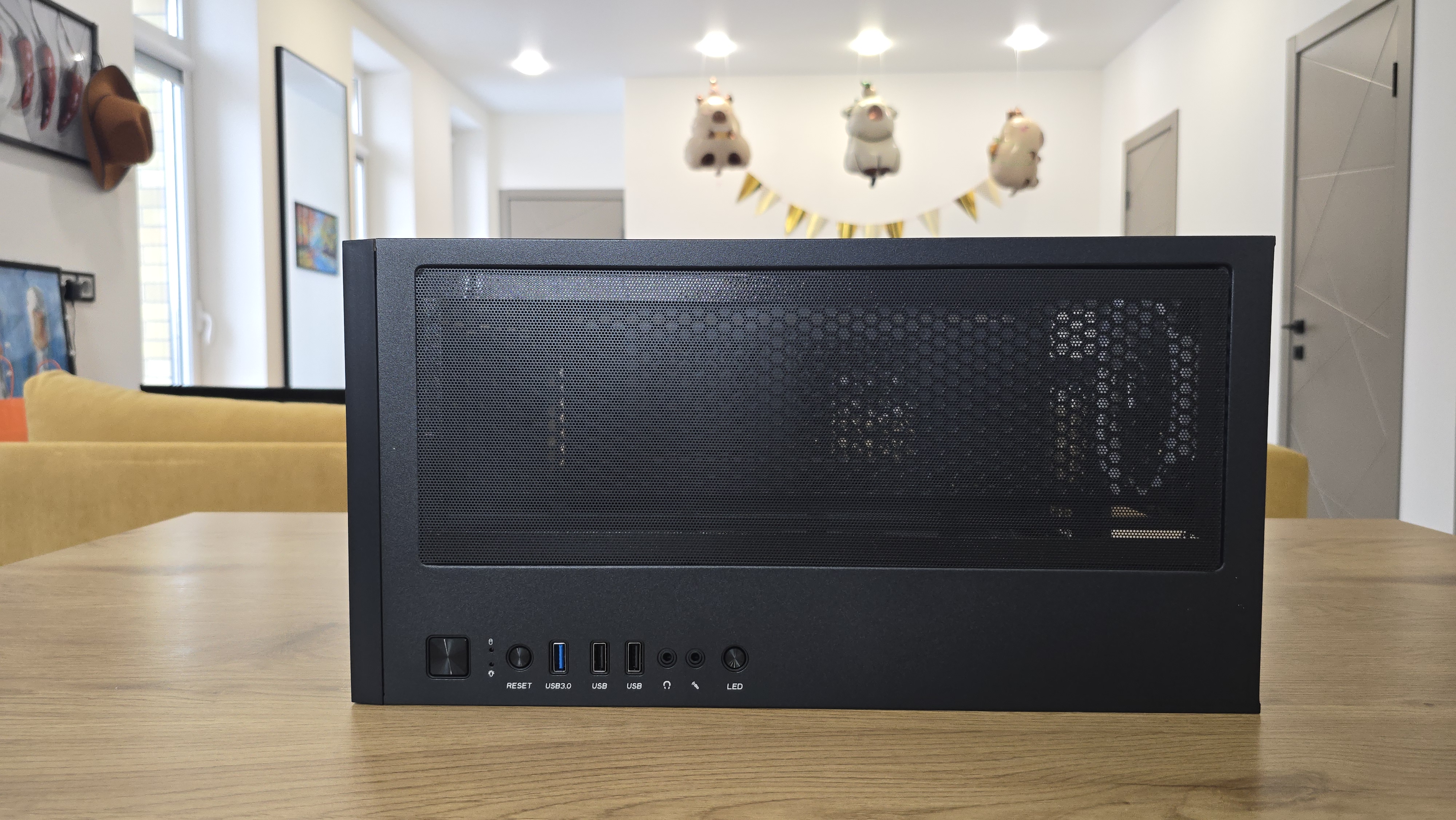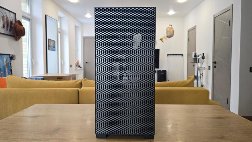 Передняя панель представляет собой сплошную металлическую сетку с шестигранной перфорацией по всей площади. За ней размещена полноценная монтажная рамка под три вентилятора 120 мм либо три 140 мм. При необходимости сюда же устанавливается радиатор длиной до 360 мм. Фасад не перекрыт глухими вставками, поэтому забор воздуха происходит по всей высоте корпуса. Это сразу задает характер модели — она рассчитана на активный поток, а не на декоративную подсветку за стеклом.