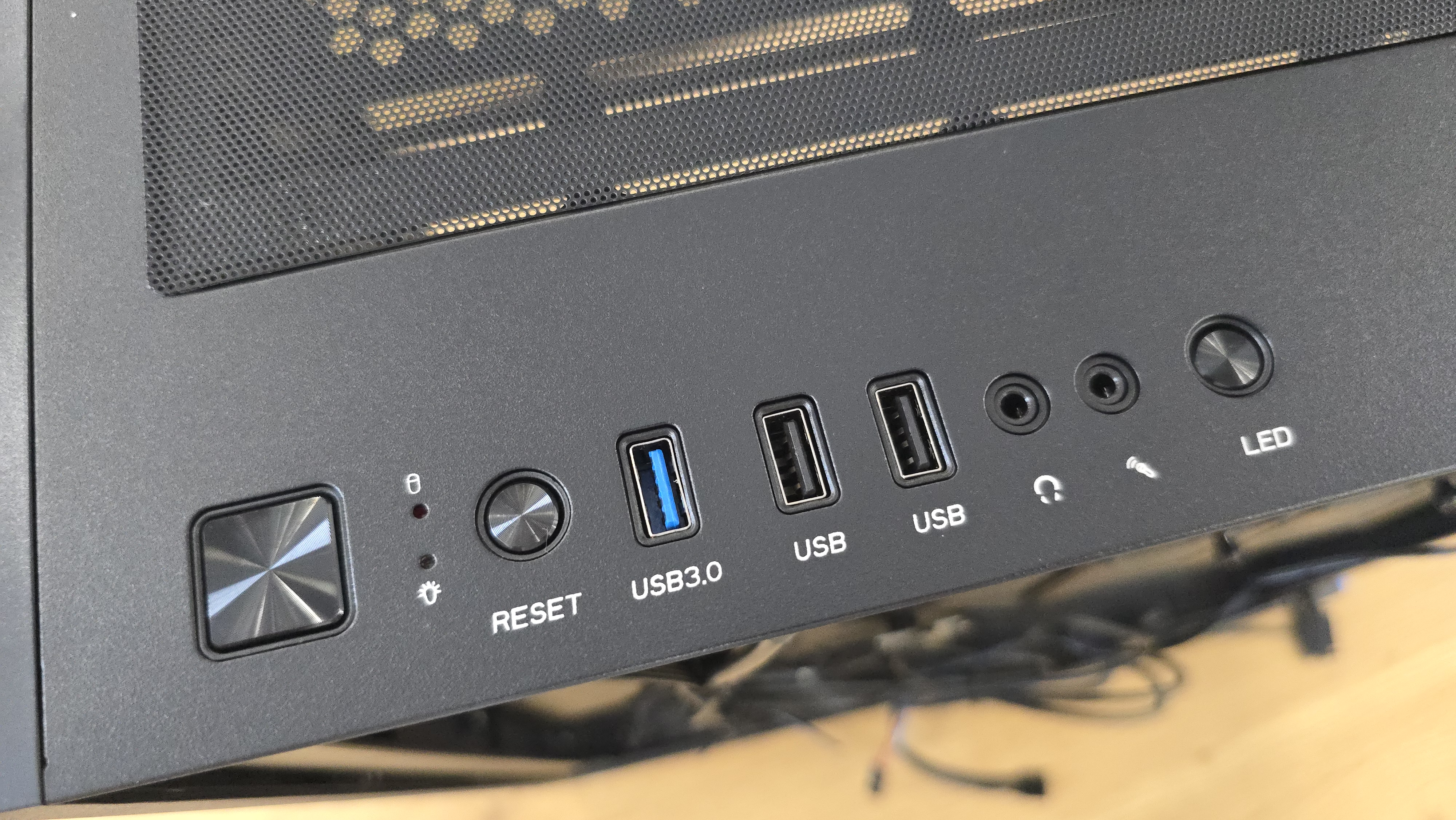 Ближе к переднему краю верхней панели размещен блок элементов управления и разъемов ввода-вывода. В этой зоне сосредоточены органы управления системой и интерфейсы подключения периферии: кнопка включения питания, клавиша перезагрузки, отдельный переключатель режимов подсветки, аудиоразъемы для гарнитуры, а также порты USB различных стандартов — два Type-A версии 2.0 и один порт стандарта USB 3.0.