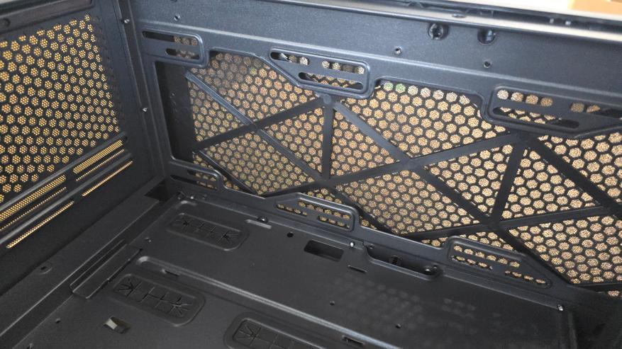 Верхняя часть корпуса закрыта съемной пылезащитной панелью с магнитным креплением. Фильтр легко снимается, поэтому доступ к вентиляционной зоне не требует инструмента. Под этой панелью находится монтажная площадка системы охлаждения. Здесь предусмотрены крепления для трех вентиляторов диаметром 120 мм либо для двух моделей формата 140 мм. При необходимости в этой области можно установить радиатор системы жидкостного охлаждения длиной до 240 мм. Монтаж выполняется из внутренней стороны шасси.