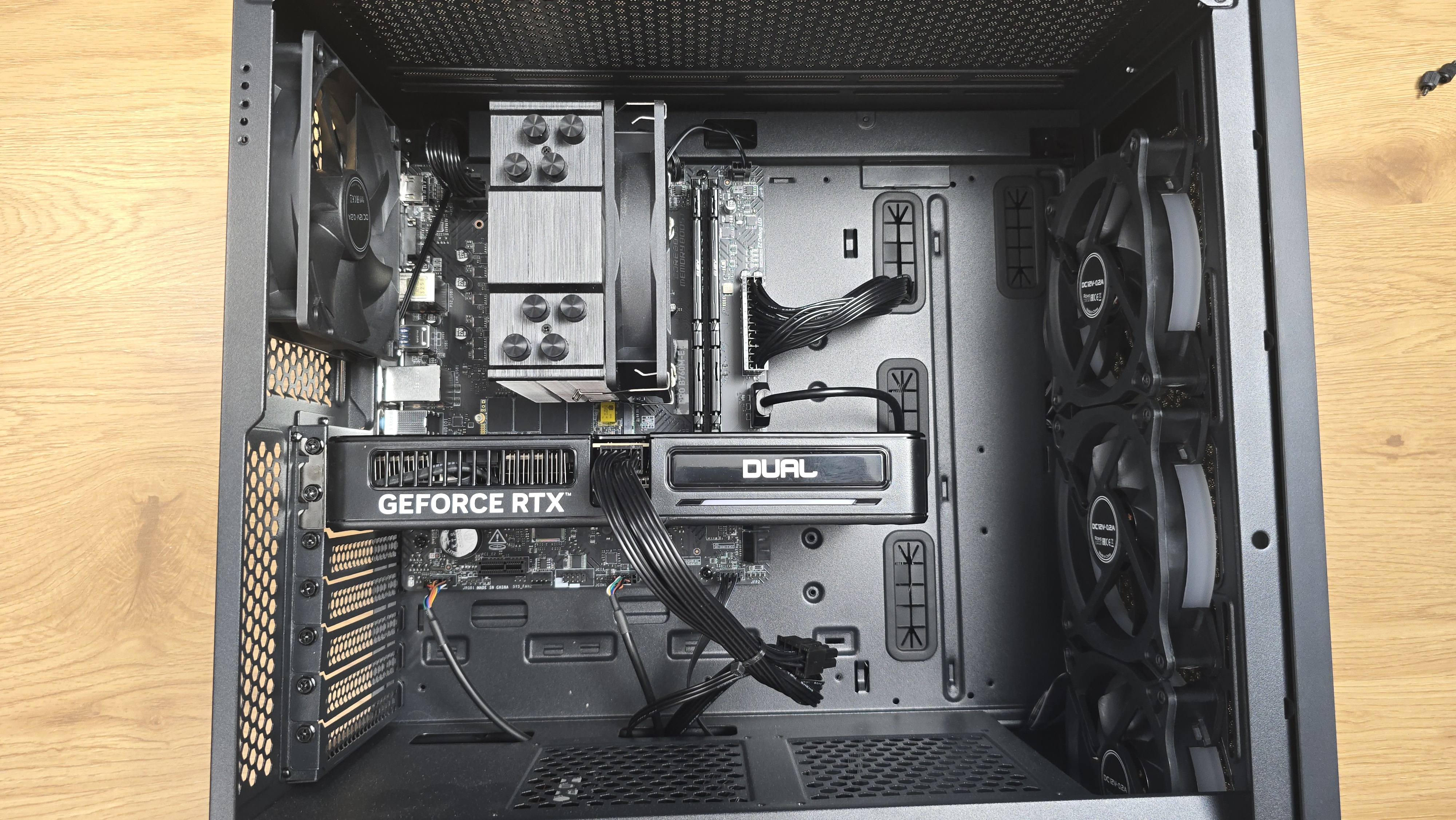 Над видеокартой также остается достаточно свободного объема. Башенный кулер установлен ближе к задней панели и занимает только область вокруг процессорного сокета. Центральная часть корпуса остается открытой, поэтому между кулером, видеокартой и верхней частью корпуса сохраняется свободная зона.