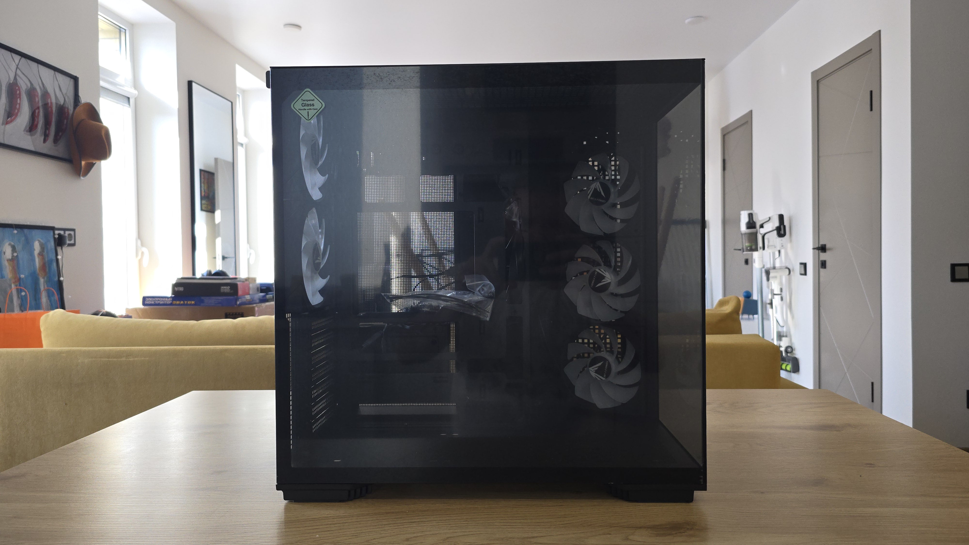 Стеклянные панели позволяют хорошо рассмотреть установленное оборудование и работу подсветки. При этом корпус не выглядит хрупким — металлическое шасси ощущается достаточно жестким, панели подогнаны аккуратно, а зазоры между стеклами минимальные.