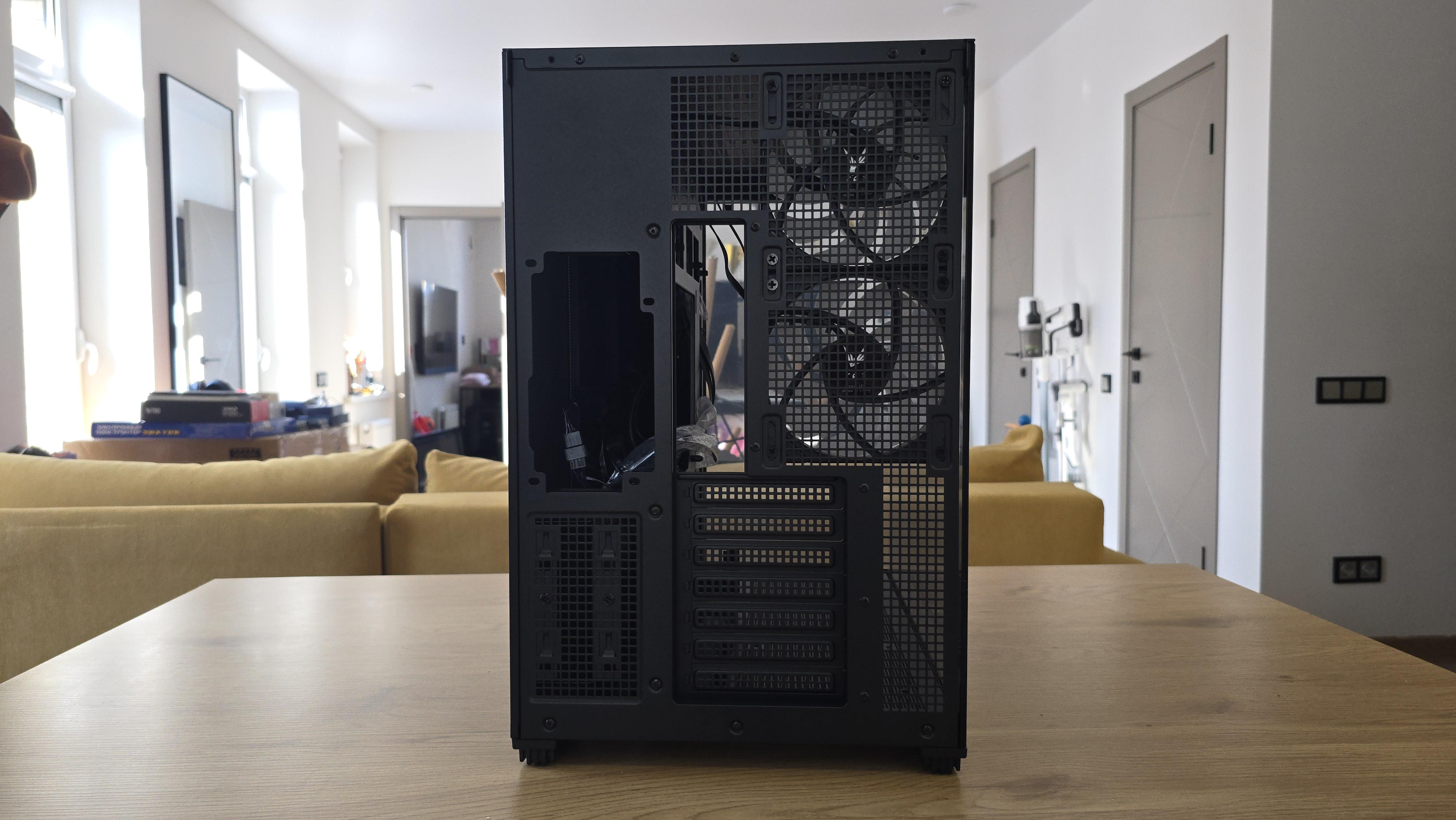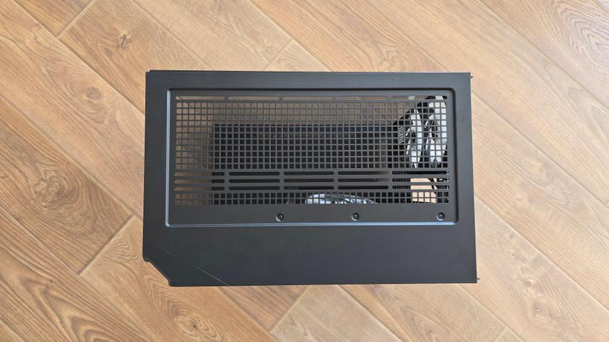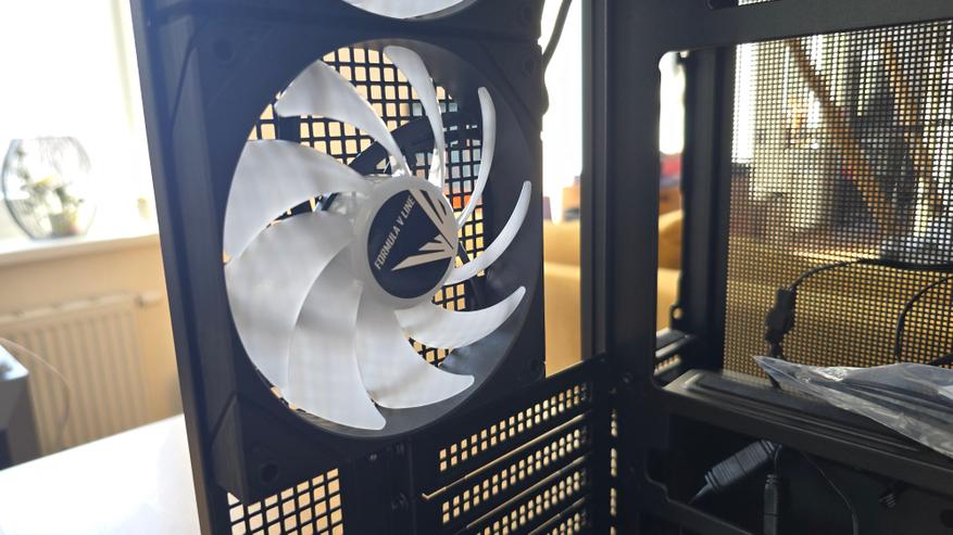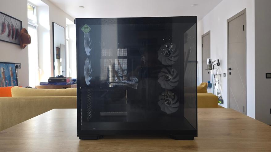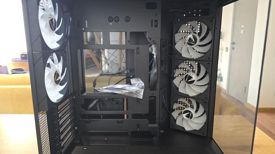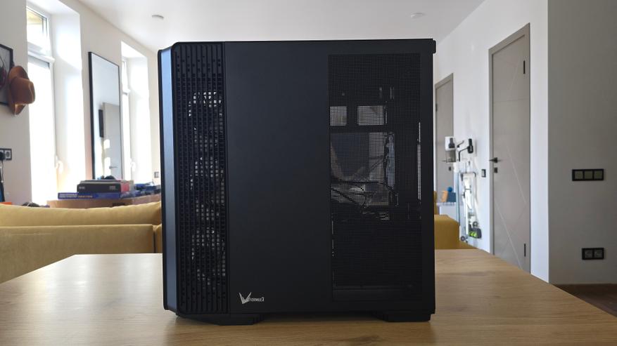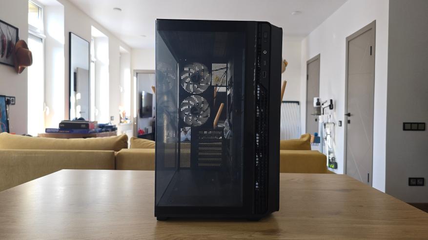 Конструкция корпуса выглядит продуманной. Основной приток воздуха формируется через боковой блок вентиляторов, после чего поток проходит через центральную часть системы и выходит через заднюю и верхнюю панели. Такая схема отличается от классической компоновки с фронтальными вентиляторами, но на практике работает вполне логично.