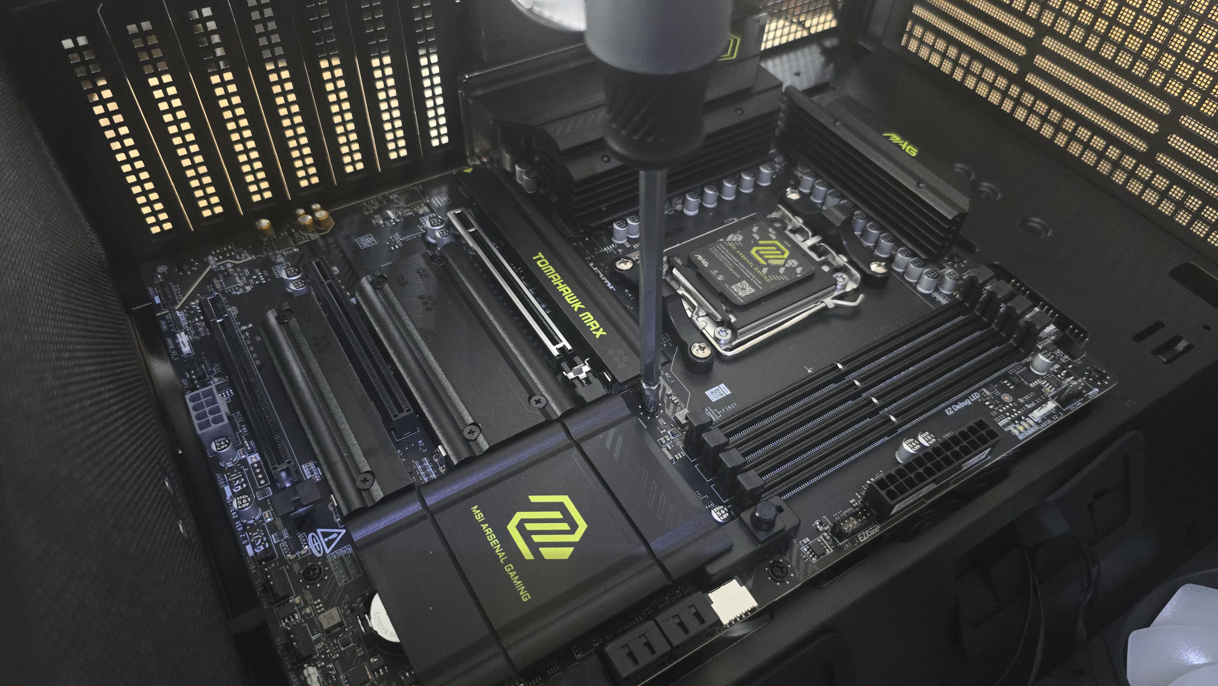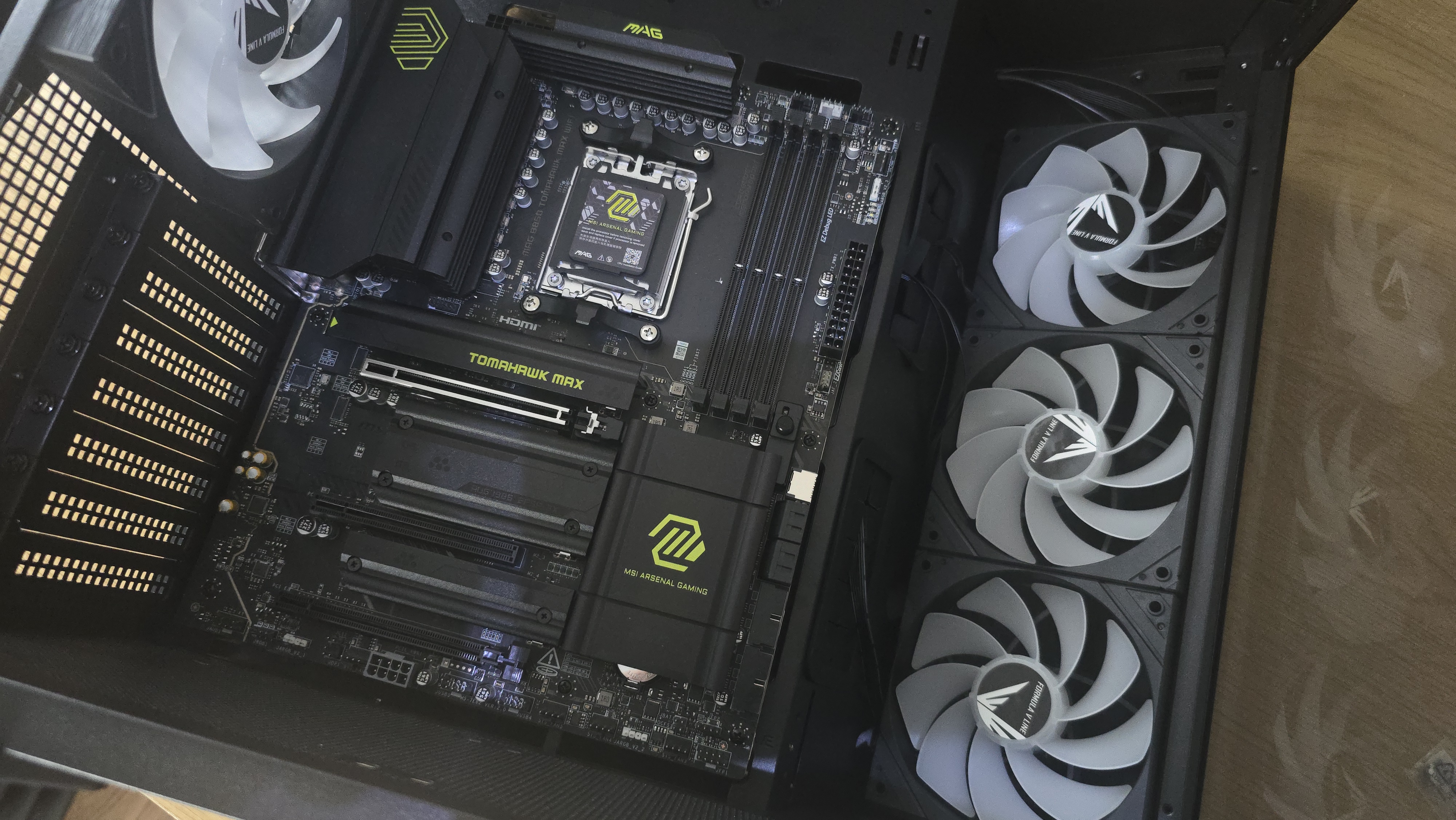 Моя конфигурация построена на современной платформой на базе AMD. В качестве материнской платы используется MSI Mag B850 Tomahawk MAX WiFi. Плата формата ATX хорошо вписывается в внутреннюю компоновку корпуса и оставляет достаточно свободного пространства вокруг основных компонентов. Это заметно в зоне кабельных выводов и рядом с системой охлаждения процессора.