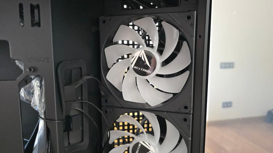 Воздух попадает внутрь корпуса через боковые воздухозаборные каналы в передней части шасси. За ними расположен пылевой фильтр, после которого поток сразу захватывается тремя вентиляторами диаметром 120 мм. Эти вентиляторы размещены вертикально на правой стенке основной камеры и развернуты примерно под углом 45 градусов относительно фронтальной панели. Такая компоновка формирует направленный поток воздуха внутрь корпуса. Часть воздуха проходит через центральную область системы, где расположены видеокарта и материнская плата, а часть идет мимо, в сторону боковой стеклянной панели и затем распределяется по внутреннему объему корпуса. В результате внутри формируется достаточно равномерная циркуляция.