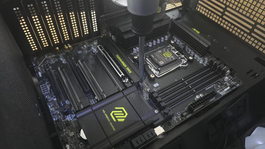 Видеокарта установлена в основной слот PCIe и занимает центральное положение в корпусе. Благодаря достаточно большому внутреннему пространству между видеокартой и боковым блоком вентиляторов остается заметный зазор. Это позволяет воздуху свободно проходить через радиатор видеокарты и не создавать лишних препятствий для циркуляции потока.