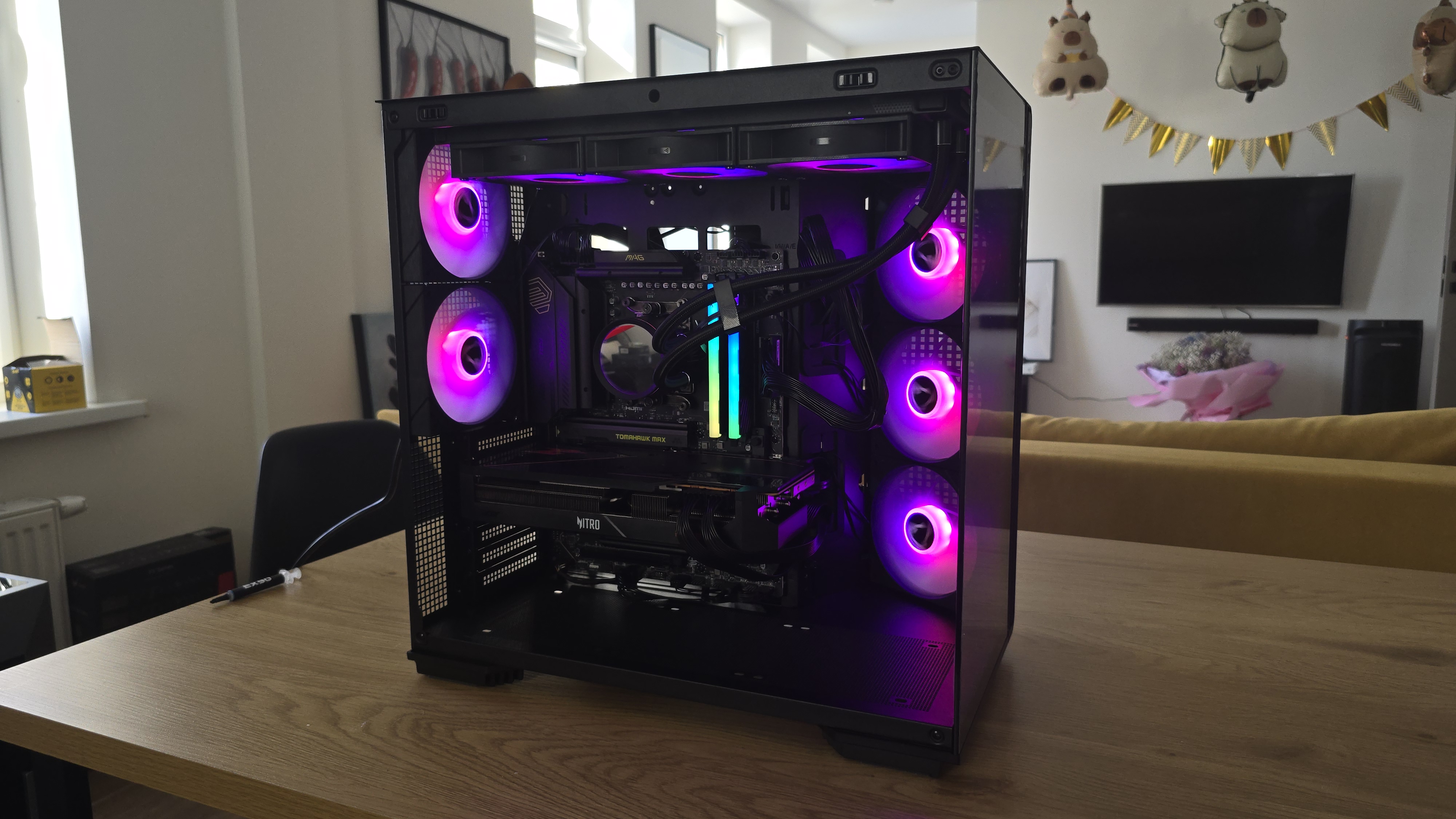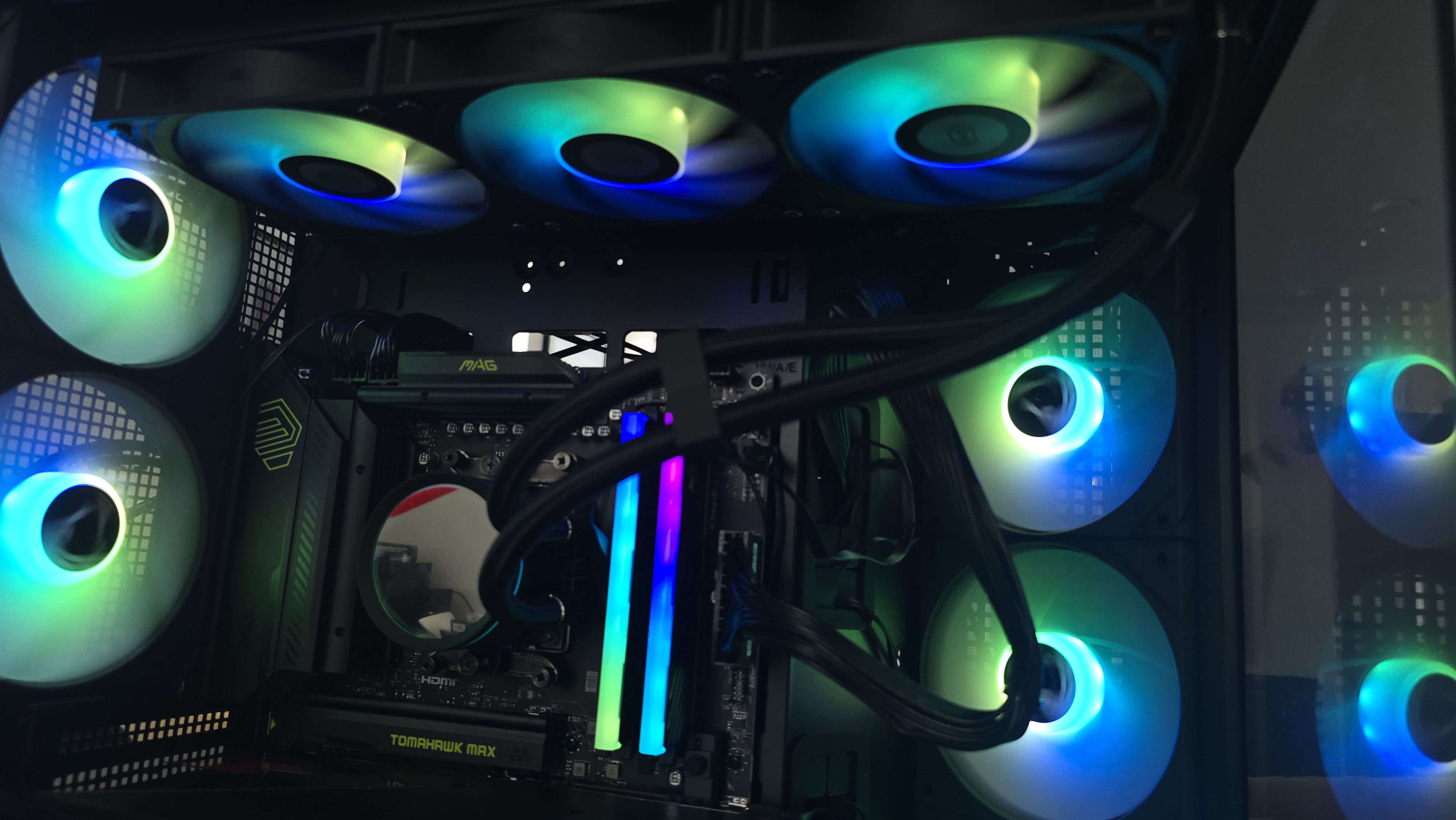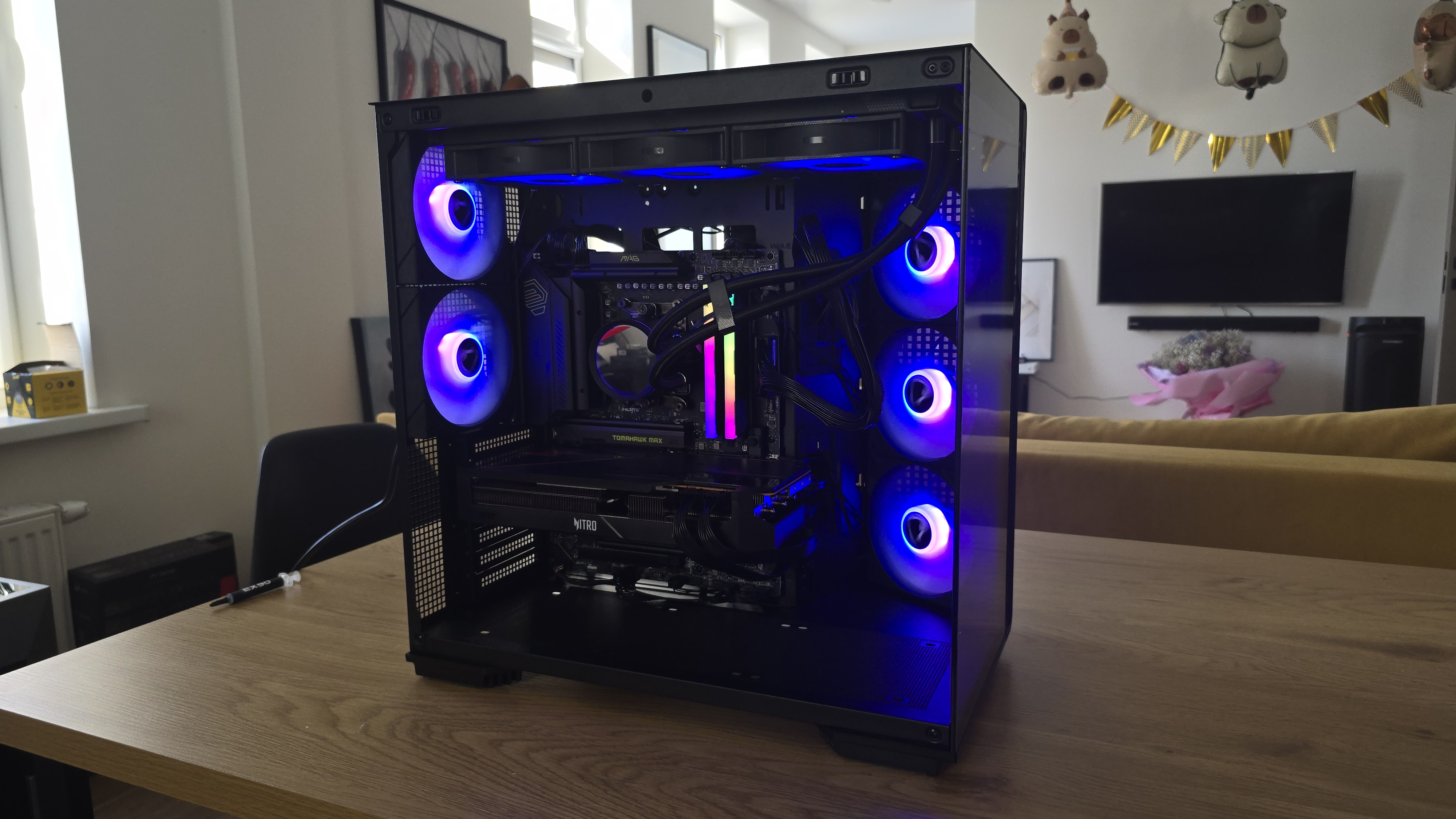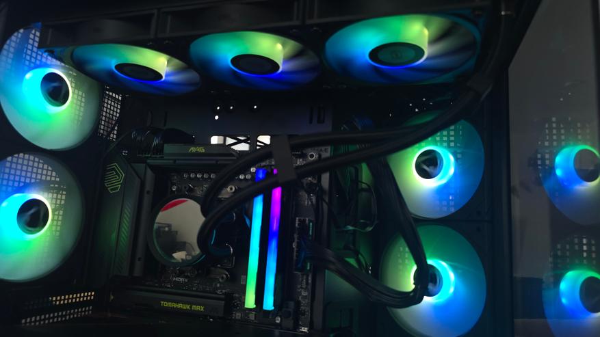 Через стеклянные панели хорошо видно внутреннюю компоновку системы. При включенной подсветке вентиляторы формируют равномерную световую заливку, которая подсвечивает как материнскую плату, так и видеокарту.