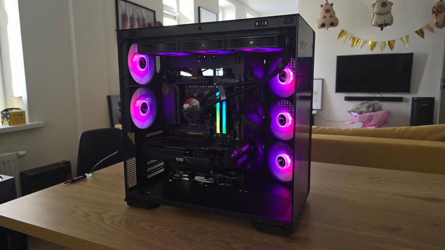 Во время сборки никаких сложностей не возникло. Материнская плата устанавливается без проблем, вокруг нее остается достаточно пространства, поэтому подключать питание и фронтальные разъемы удобно. Радиатор системы жидкостного охлаждения спокойно размещается в верхней части корпуса, при этом доступ к винтам и кабелям не перекрывается. С установкой видеокарты тоже не возникает трудностей — внутри корпуса достаточно свободного места, поэтому карта устанавливается без ощущения тесноты. Отдельно отмечу комплектные провода для подключения подсветки вентиляторов. Они достаточно длинные, поэтому их можно аккуратно проложить и спокойно подключить к разъему ARGB на материнской плате без использования удлинителей.