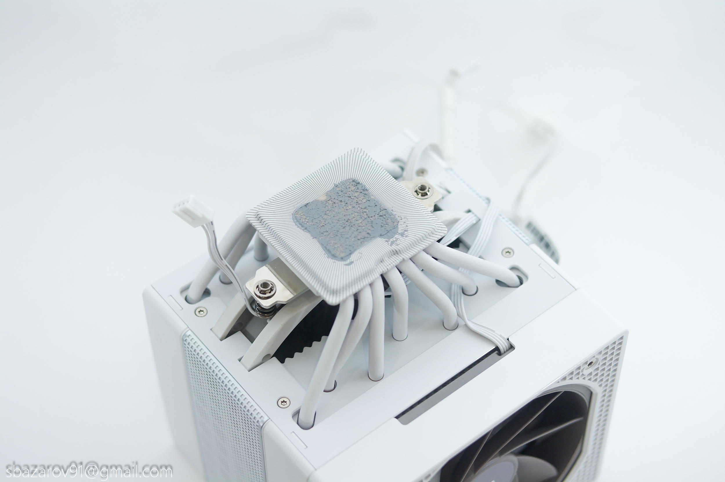 С завода на подошву теплосъемника нанесена наклейка, под ней — пятно контакта, напоминающее шлифованную поверхность. Однако, на ощупь она гладкая, а её размеры едва превышают 32x32 миллиметра. Это немногим меньше, чем поверхности большинства процессоров. Например, мой AMD Ryzen 7 5700X3D имеет стандартные размеры для сокета AM4: примерно 37.5x37.5 мм, а значит часть верхней крышки процессора не будет касаться теплосъемника.
