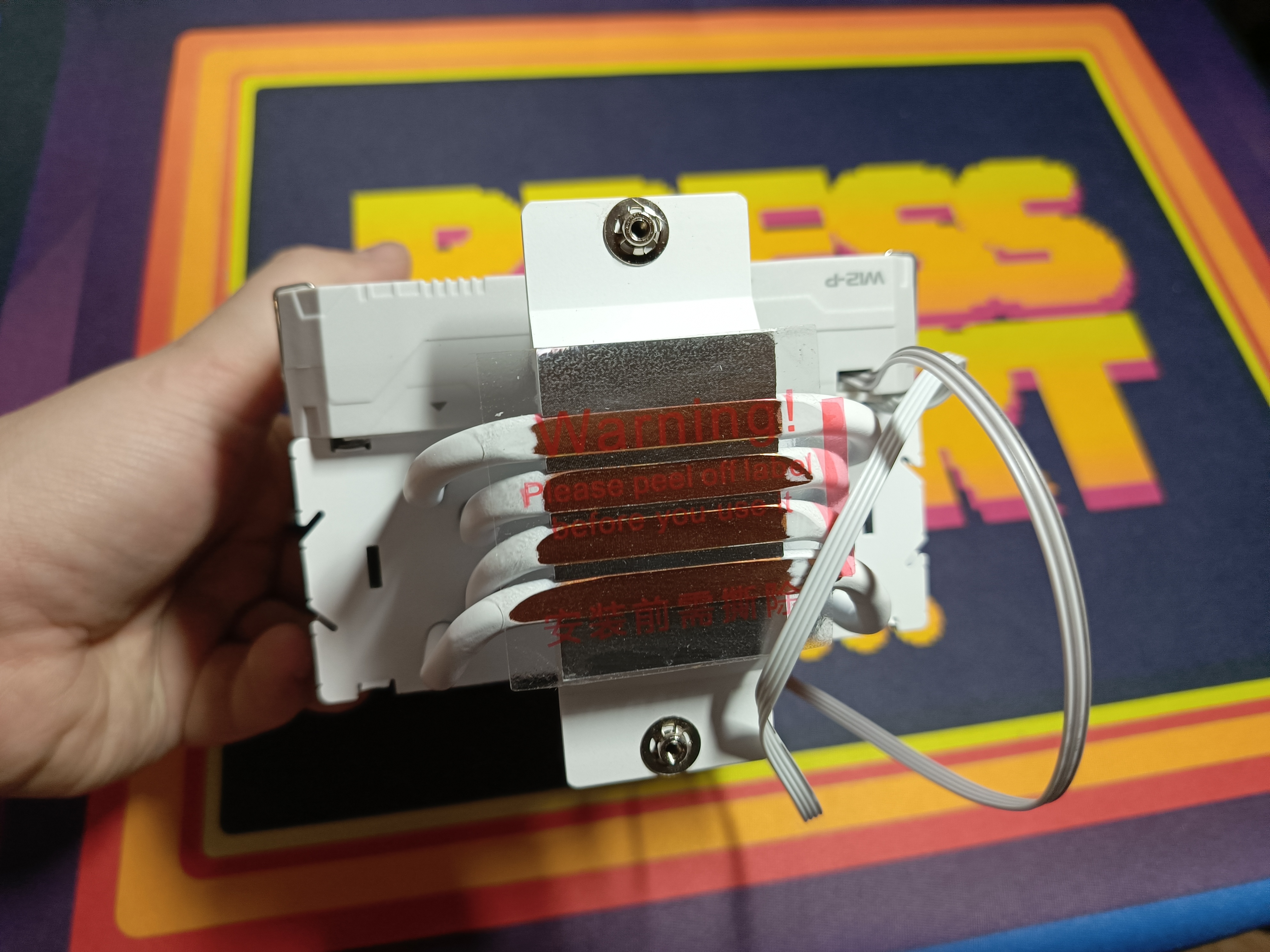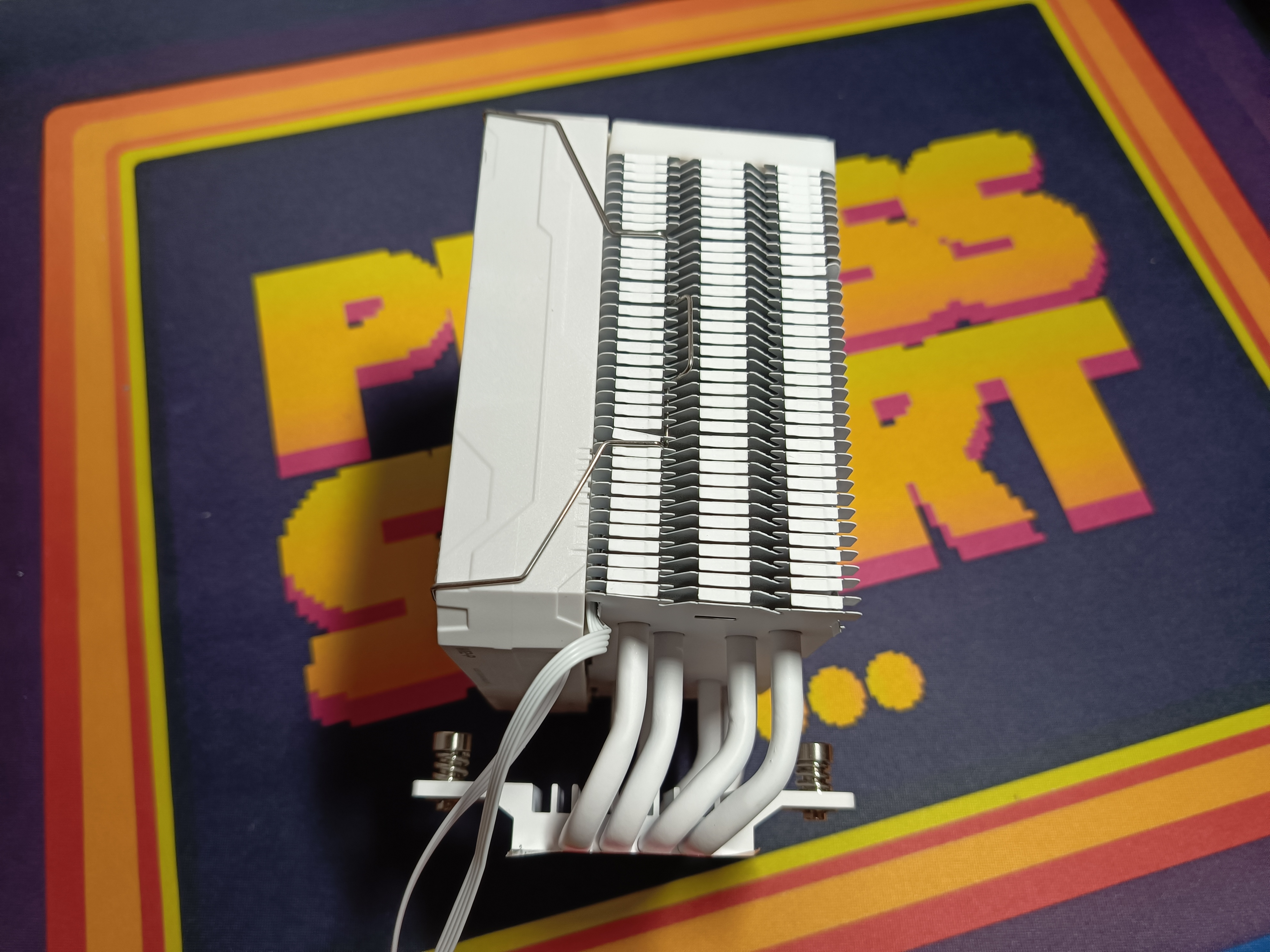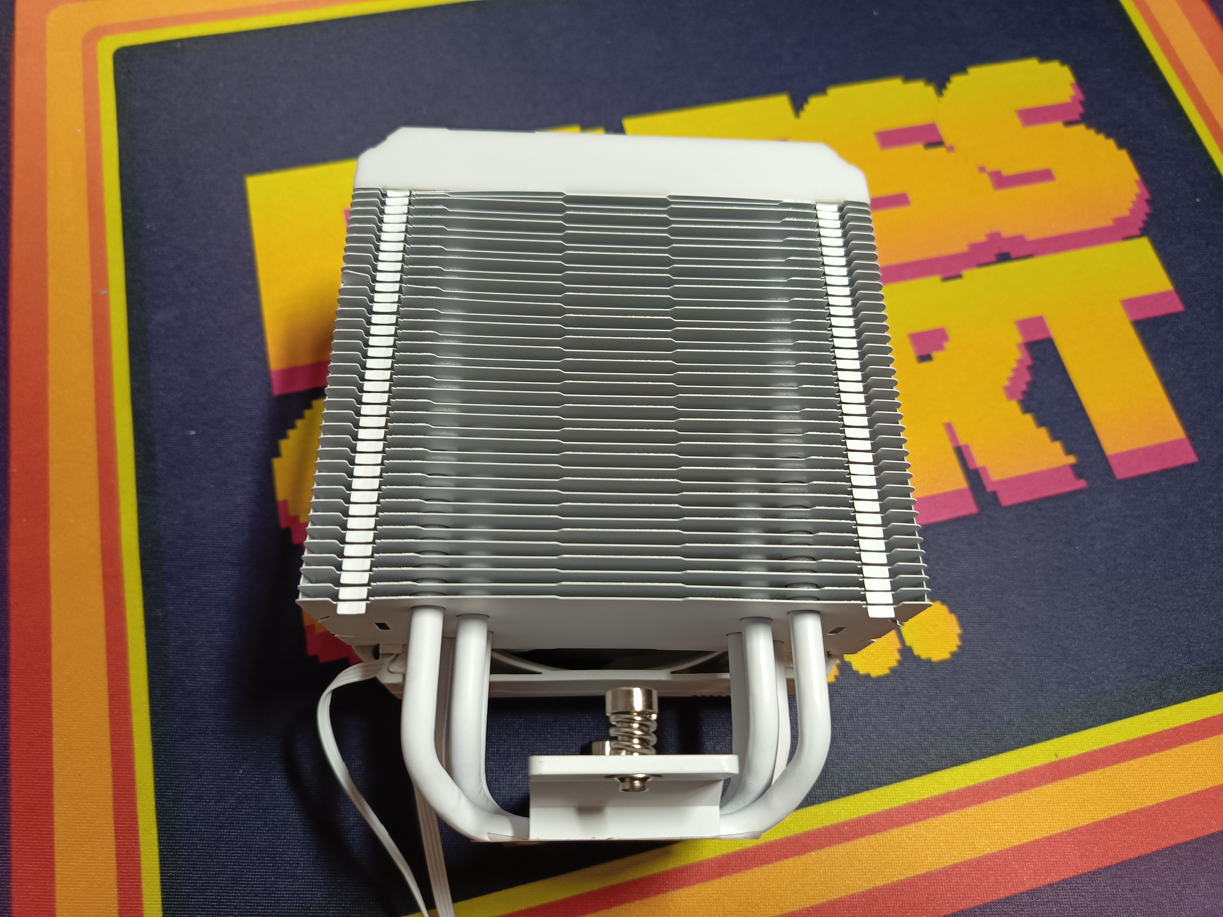 Радиатор покрыт белой краской, включая медные трубки. Их четыре, каждая диаметром шесть миллиметров. Трубки впрессованы в алюминиевую основу, которая плотно прилегает к процессору. В целом все обычно, кроме того что на верхней части встроен дисплей, о котором я расскажу позже.