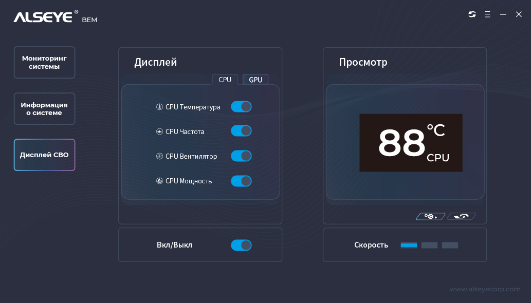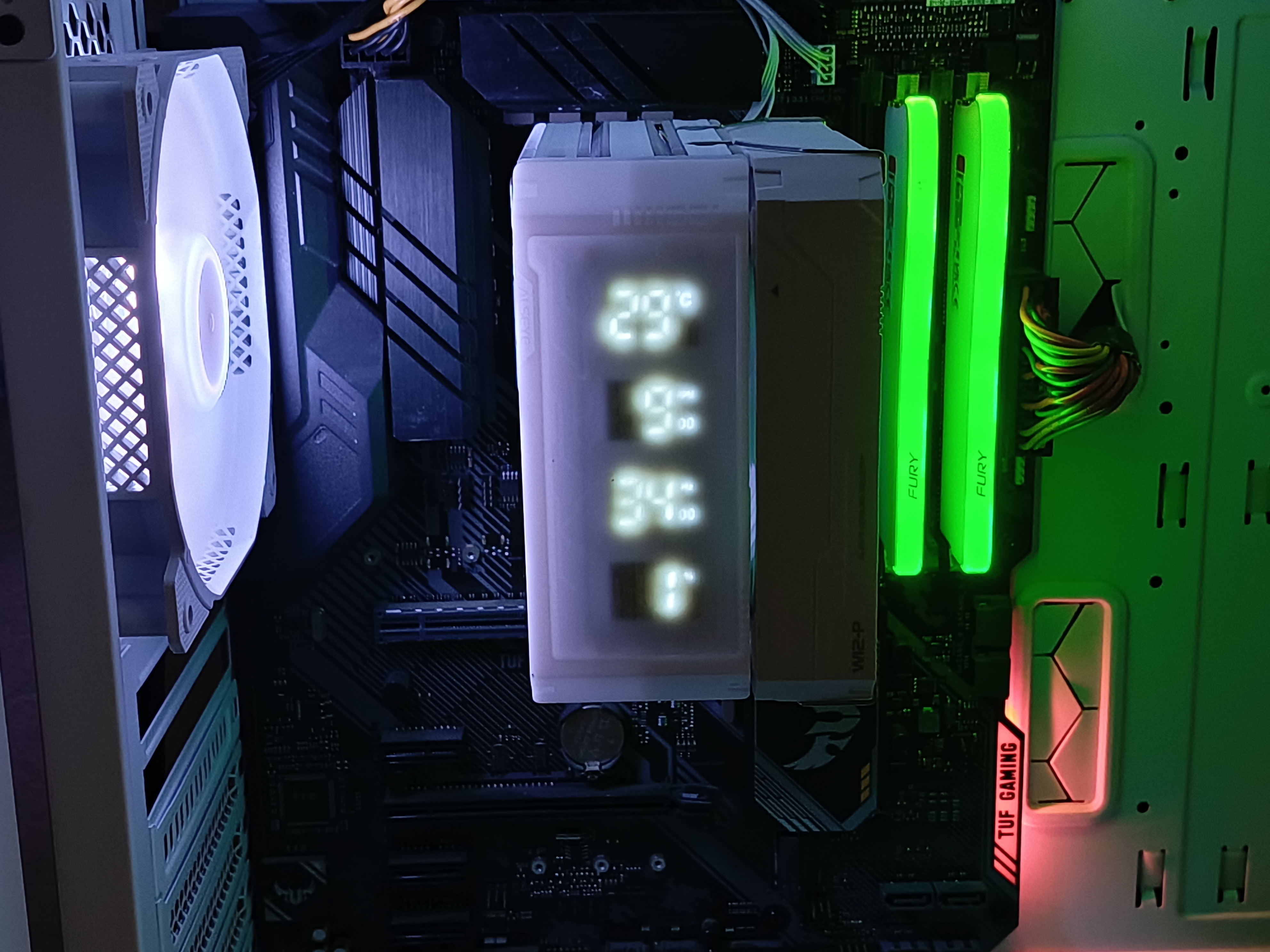Дисплей подключается к материнской плате через 9-контактный разъем. Для его работы нужно скачать фирменное программное обеспечение Alseye Bem. На экране отображается информация о температуре процессора, его загрузке и потребляемой мощности. Обратите внимание, что фотография башни сделана не в фокусе. Это действительно так, поэтому цифры размыты и могут понравиться не всем. RGB-подсветки у радиатора или вентилятора нет.