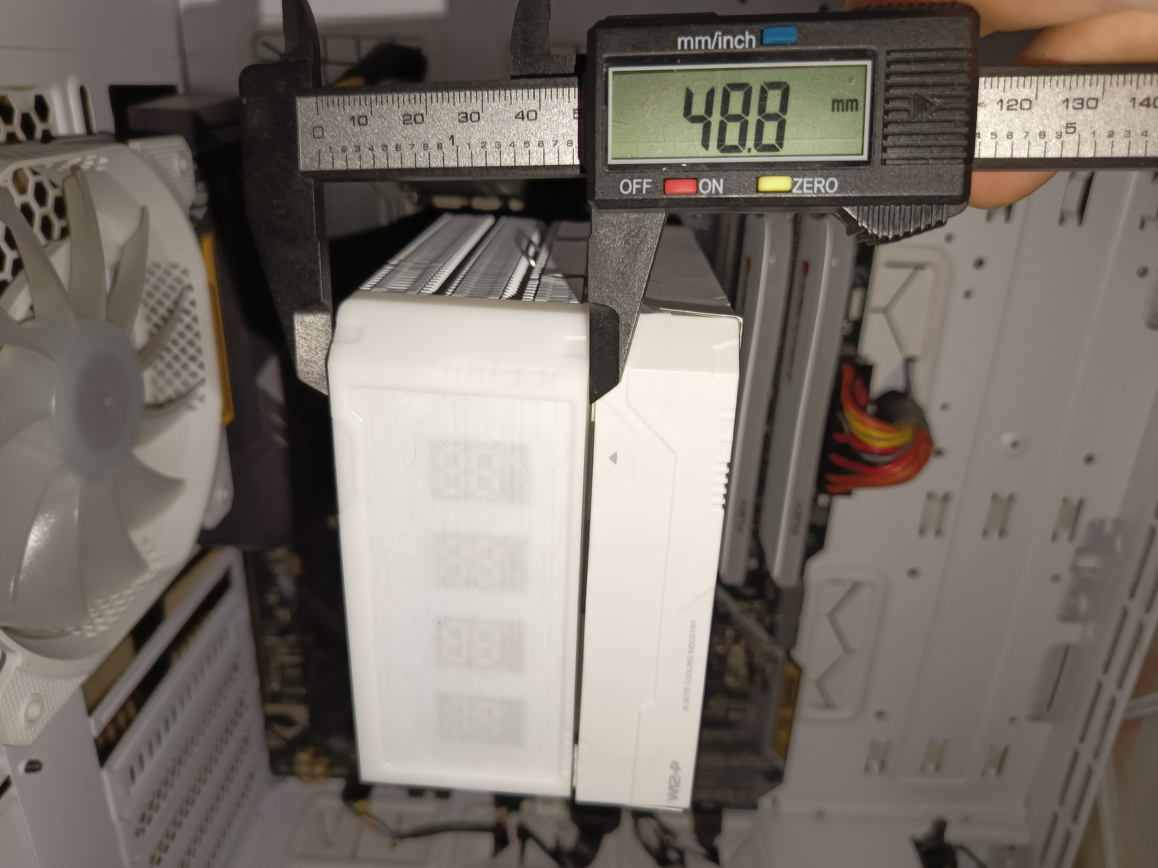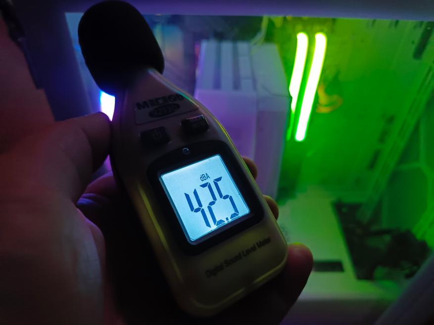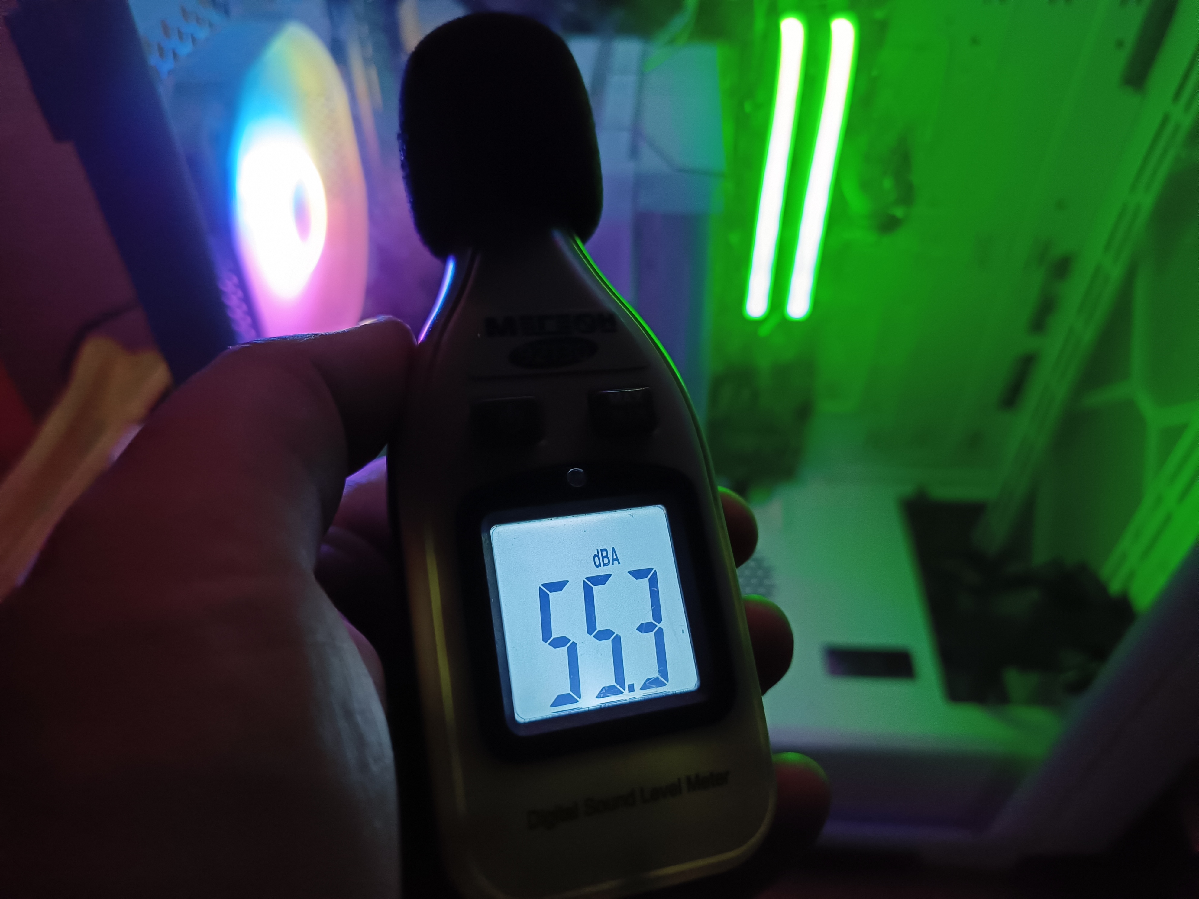 Вентилятор в комплекте работает тихо и гармонично вписывается в общую сборку. Но тишина сохраняется только до 1500 оборотов в минуту. При максимальной скорости 2824 об/мин из заявленных 3000 уровень шума достигает 55 dBA. На минимальных оборотах 900 об/мин шум составляет 42 dBA.