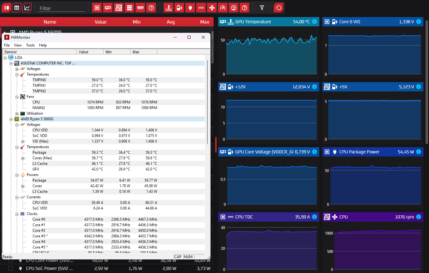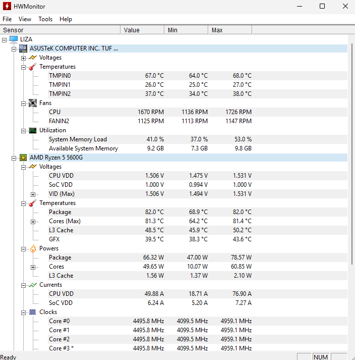 Протестировал разные игры — от World of Tanks до GTA 5 и онлайн-шутеров по типу CS и Warzone. Температура варьируется от 48 до 56 градусов, в среднем — 52 градуса. Это хороший показатель.