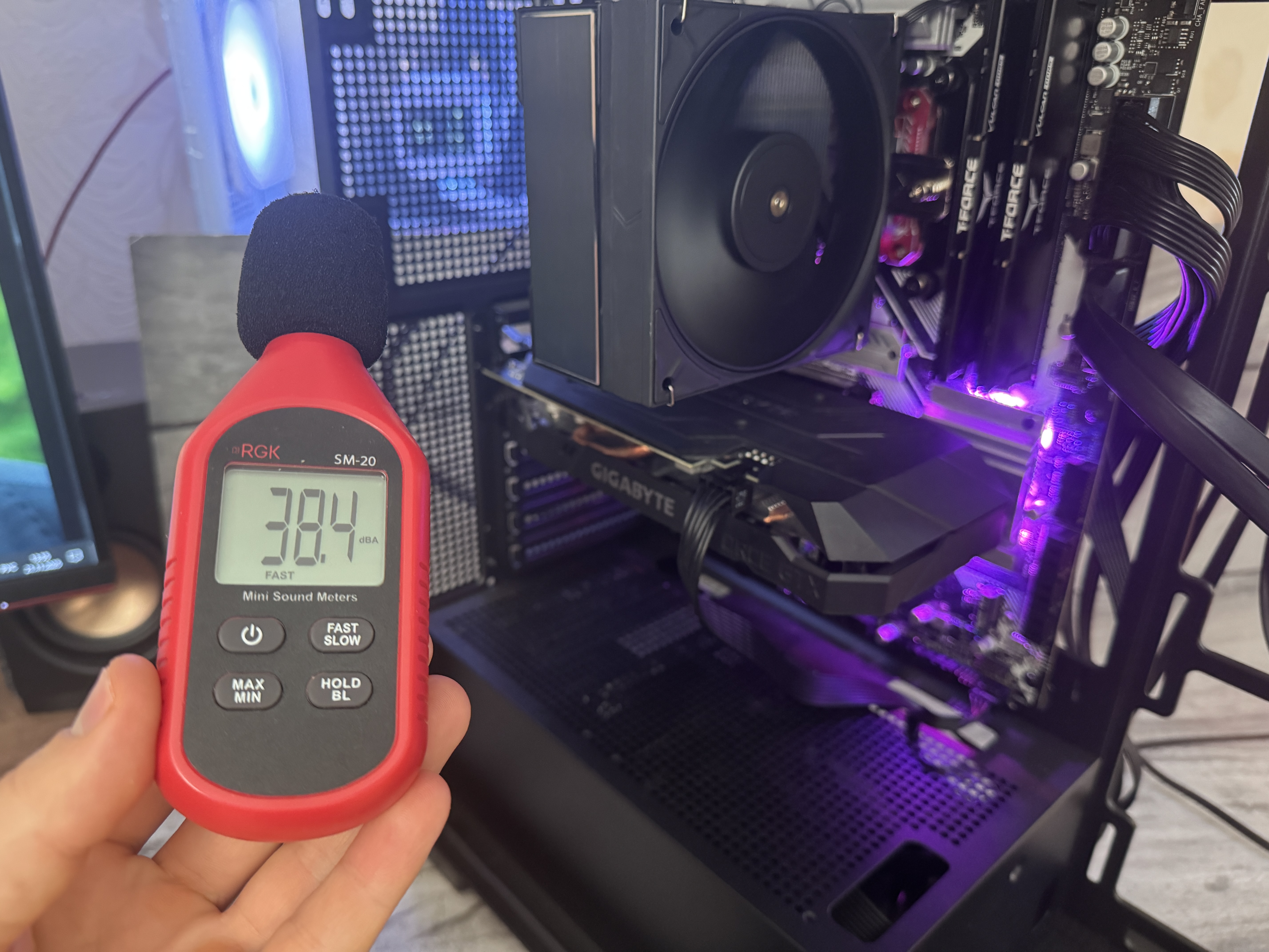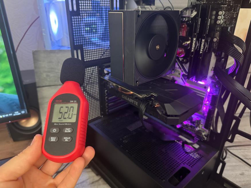 При минимальных оборотах вентиляторы мы получаем 38 dB, а при MAX уровень шума увеличивается до 52 dB.