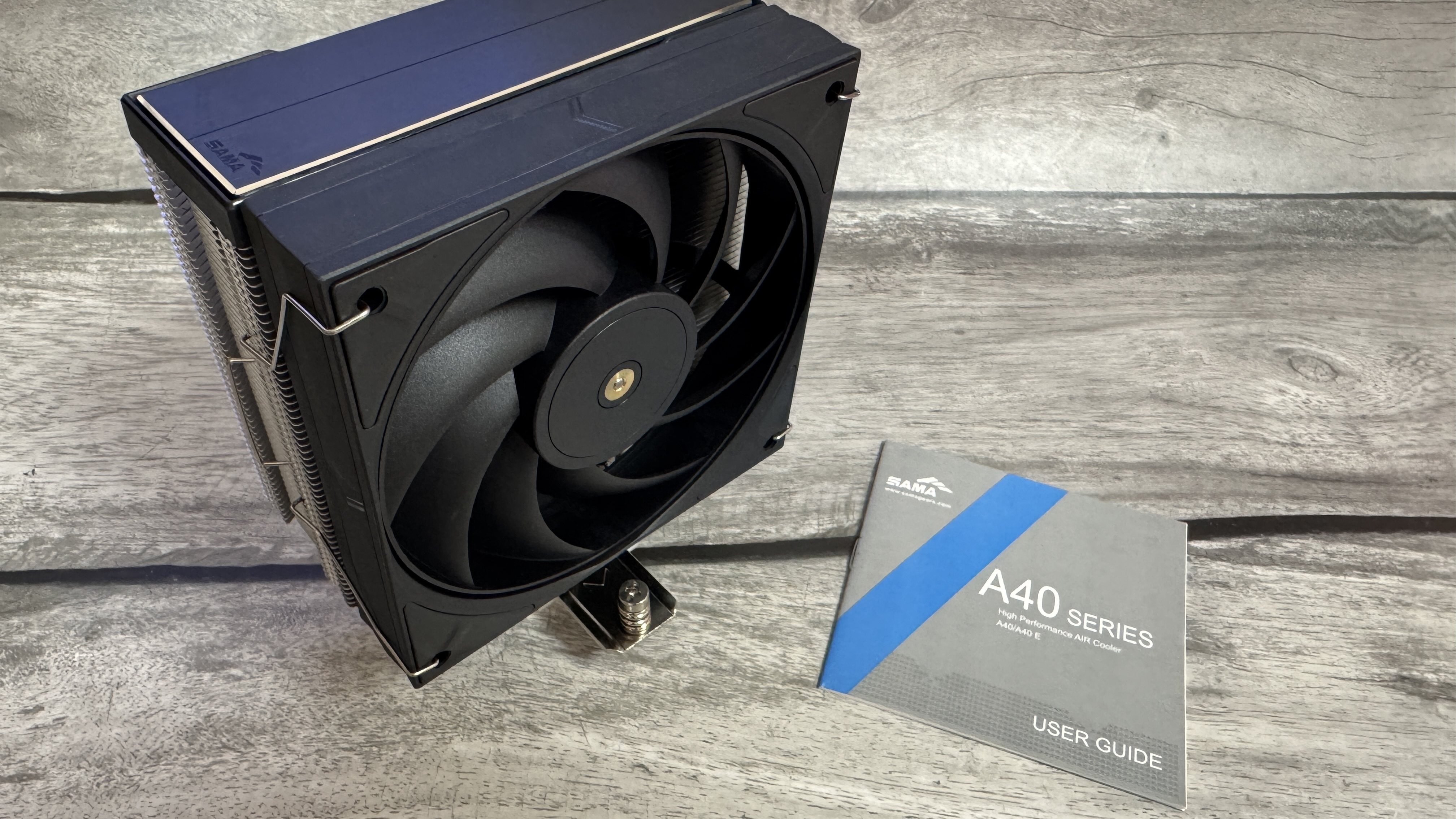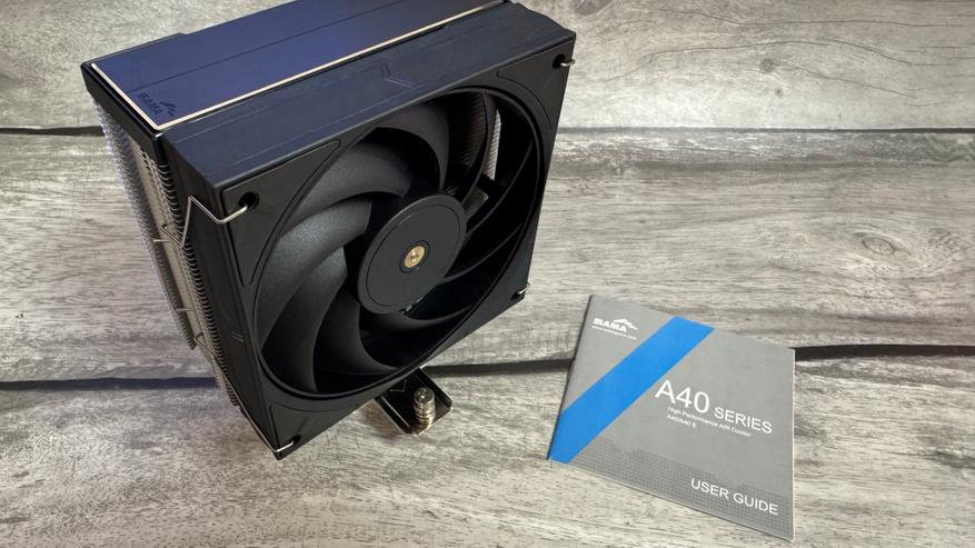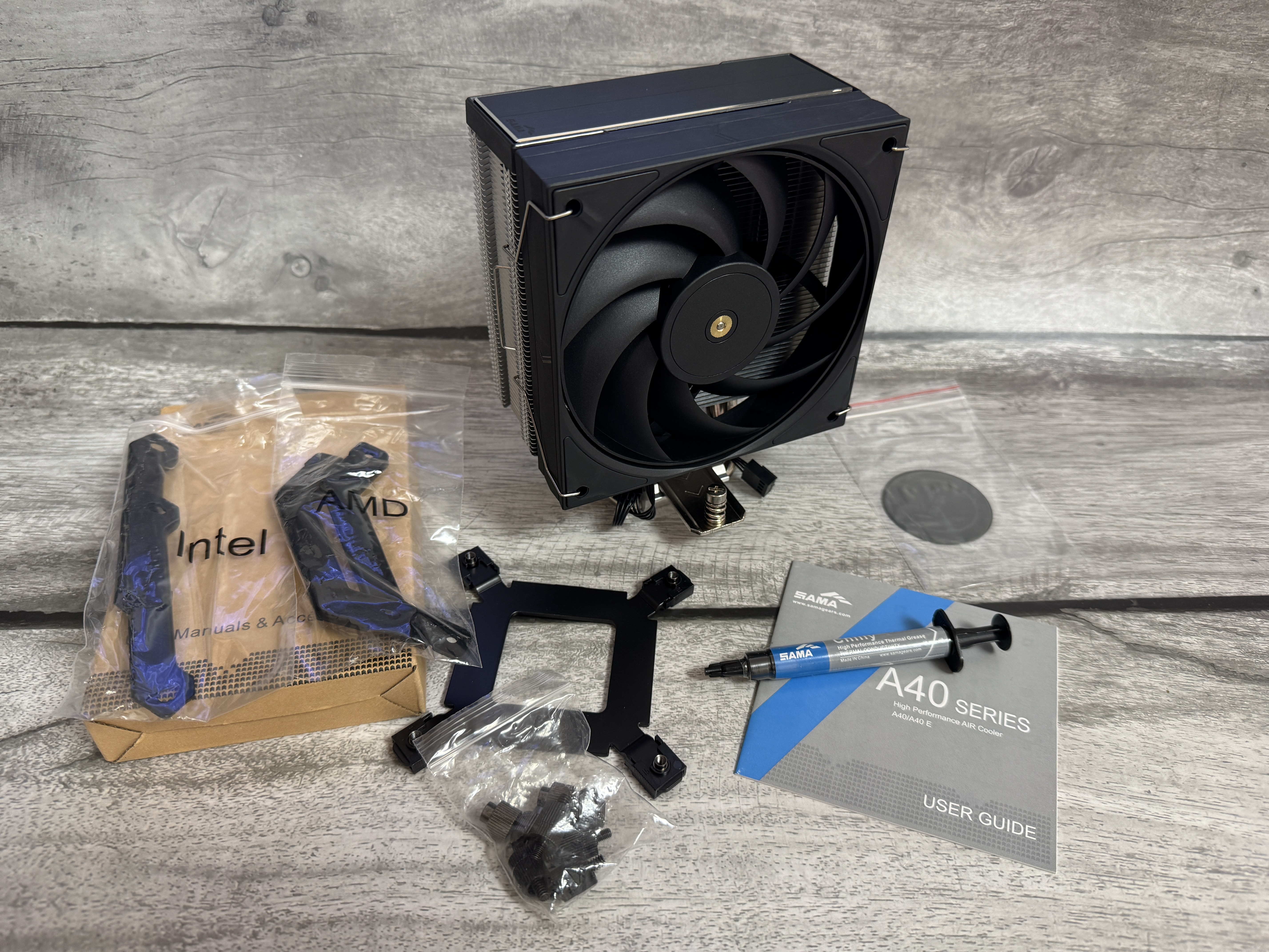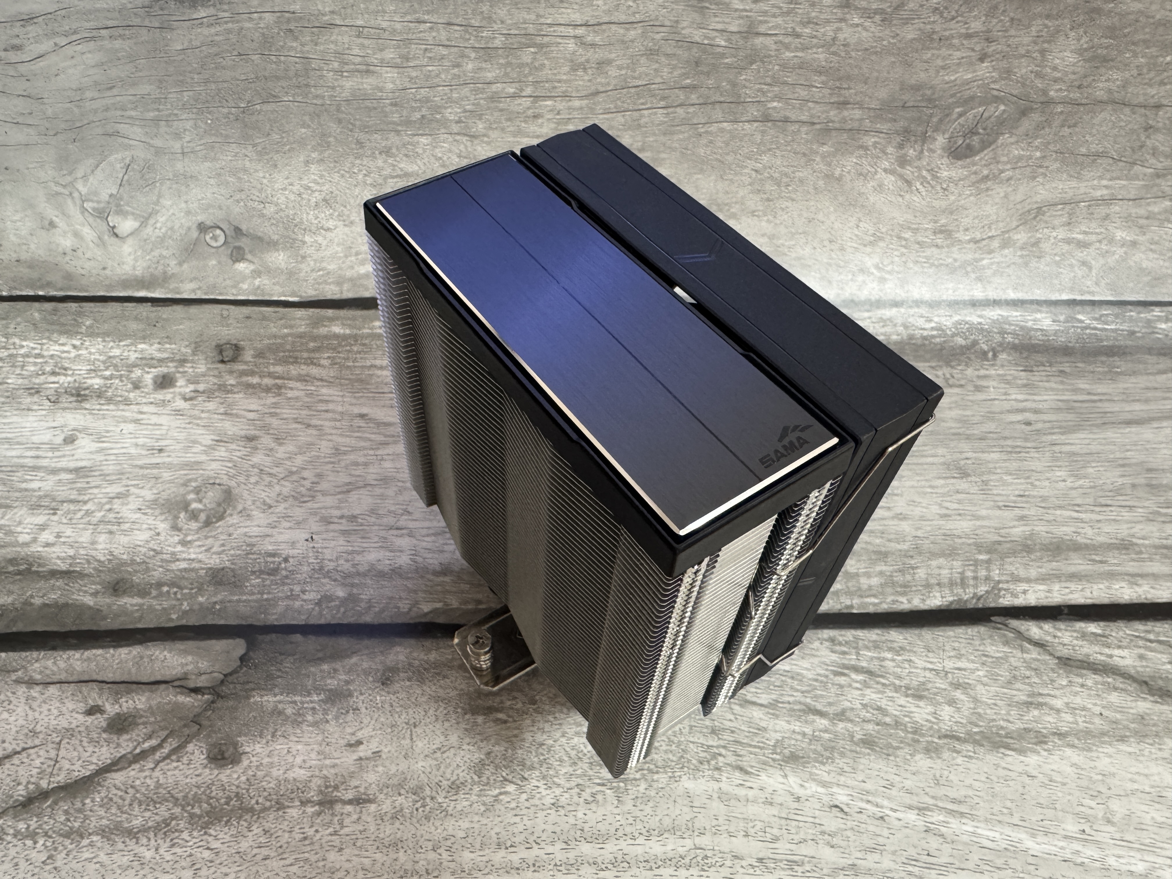 Поставляется кулер Sama A40E только в одном цвете (черном), но сам радиатор не имеет окраску и выглядит довольно стандартно и без изысков. Процессорный кулер имеет поддержку всех современных сокетов и конечно новые сокеты АМ5 и LGA 1851 — 1700. Состоит радиатор из алюминиевых пластин, которые в свою очередь насажены на медные тепловые трубки. На верхней части имеется декоративная пластиковая крышка с логотипом компании, которая закрывает концы трубок. Передается тепло от теплосъемника по четырем медным трубкам, которые запрессованы в основание по технологии прямого контакта. Тепловые трубки имеют диаметр 6 мм.