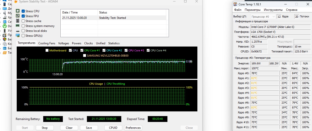 Утилита AIDA 64 после 20 минутного тестирования (нагрузки) выдает 169 Вт и температуру в районе 81 градуса.