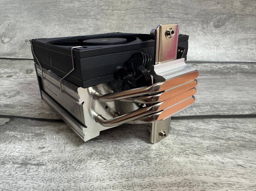 С завода на основной пластине нет термоинтерфейса, но производитель любезно дополнил комплектацию термопастой в шприце. На краях радиатора имеется углубление, которое используется для фиксации вентилятора при помощи металлических скоб. В комплекте имеется только один вентилятор охлаждения с размером 120 x 120 мм, но конечно пользователь может дополнить радиатор и вторым вентилятором, который придётся докупать отдельно. Вентилятор представлен в черном цвете, по краям корпуса имеются прорезиненные вставки, которые используются для предотвращения передачи вибрации от вентилятора на радиатор.