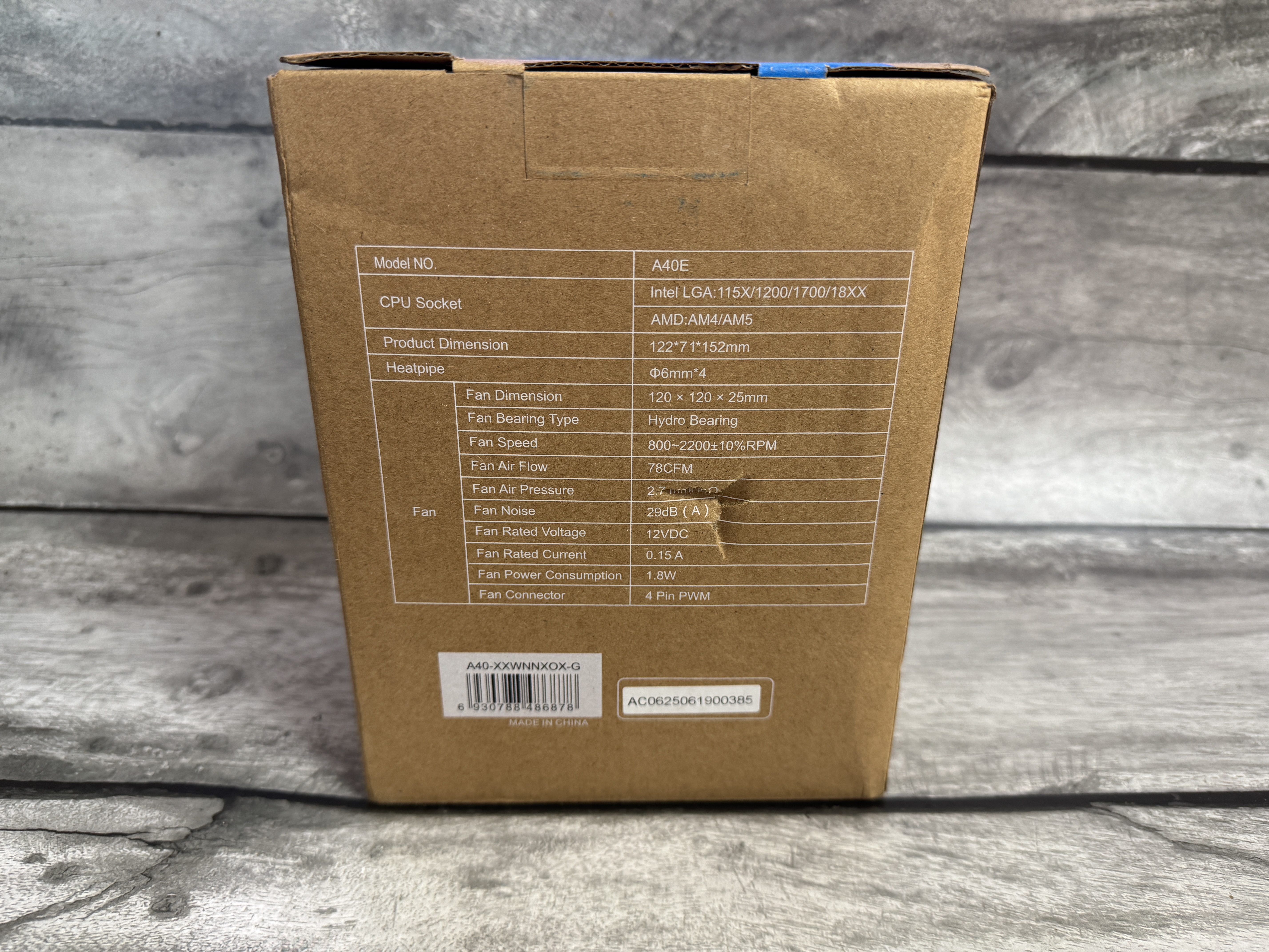 Новый процессорный кулер Sama A40E упакован в тонкую картонную коробку на которой мы можем наблюдать сплошную линию синего цвета, фирму производителя, название модели и конечно полноценное изображение поставляемого кулера. На оборотной части имеются подробные технические характеристики данной модели. Комплект поставки имеет: радиатор, вентилятор 120 мм, шприц с термопастой, бумажное руководство по установке, направляющие пластины для Intel и AMD, металлический бэкплейт, винты крепления и металлические втулки.