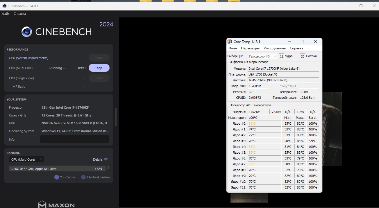 Cinebench показывает хорошую эффективность охлаждения при 175 Вт с температурой 82 градуса.