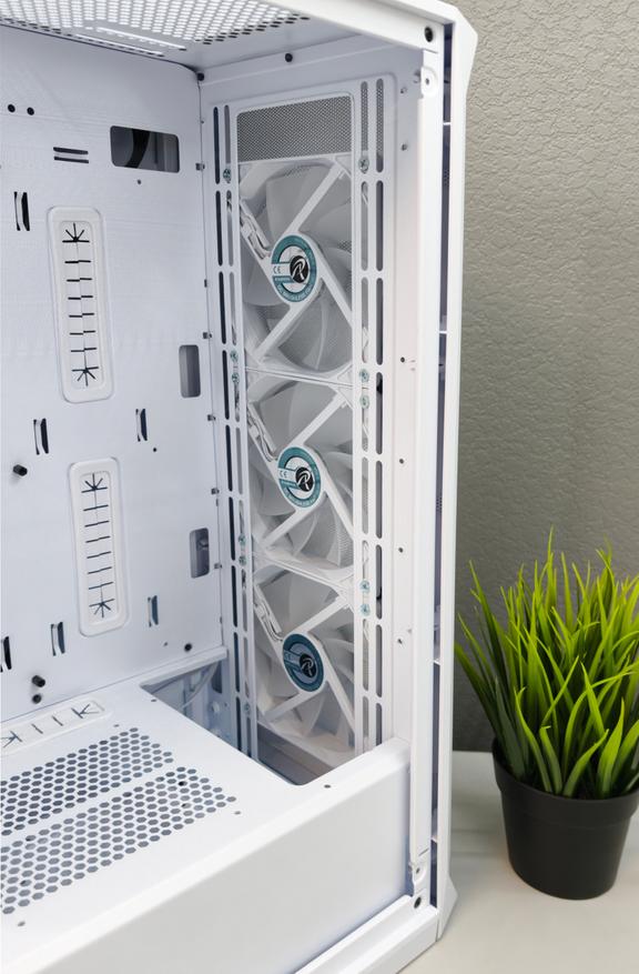 В корпусе Raijintek Arcadia 41-MS4 установлено четыре полноценных вентилятора 120 мм с подключением 4-pin PWM + ARGB, вращающиеся со скоростью 800-1500 об/мин. Подсветка регулируется с кнопки на передней панели. Общая формула стандарта и предлагает в данной версии 3 вентилятора на вдув и 1 на выдув. В младшей модели Raijintek Arcadia 41 (без приставки MS4) только одна вертушка на выдув.