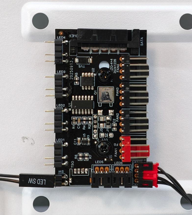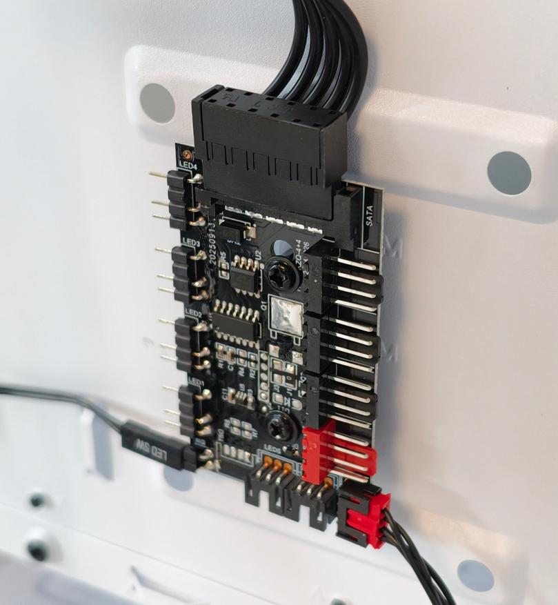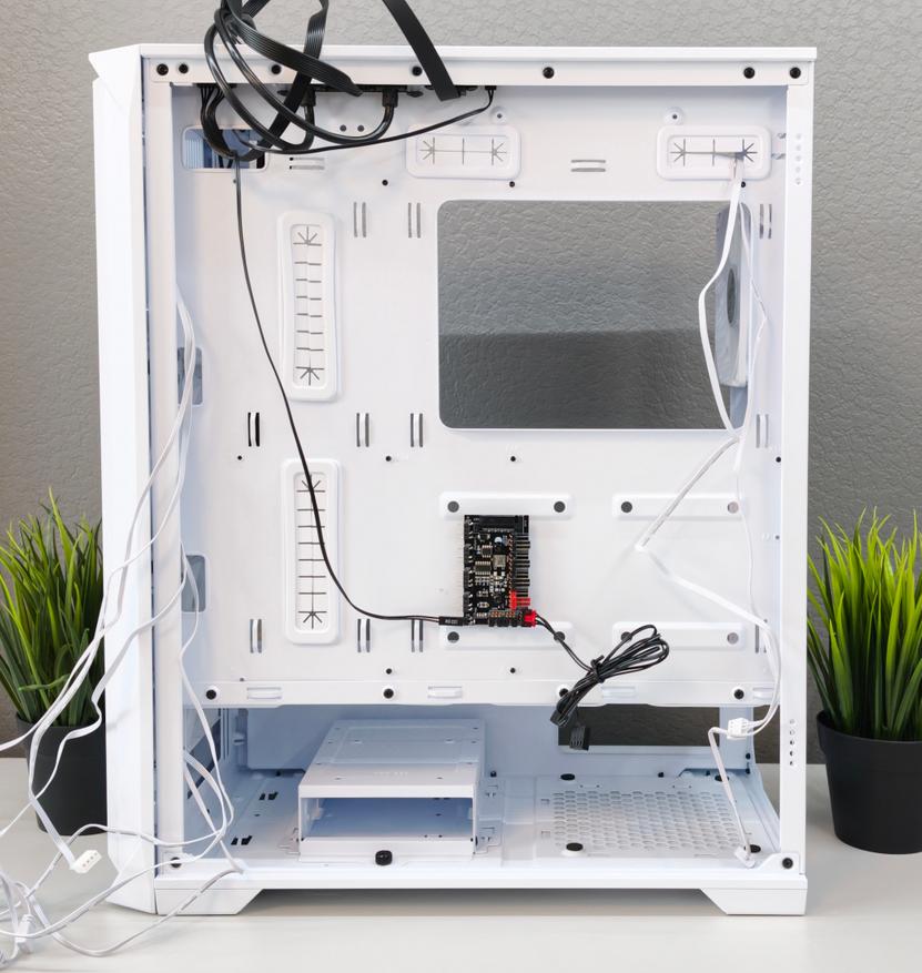 Штатный хаб на четыре вентилятора умело управляет установленными вертушками. Питание организовано через SATA, а управление подсветкой — через кнопку на передней панели. Но можно подключить провода к материнской плате, и тогда будет осуществляться полноценное управление.