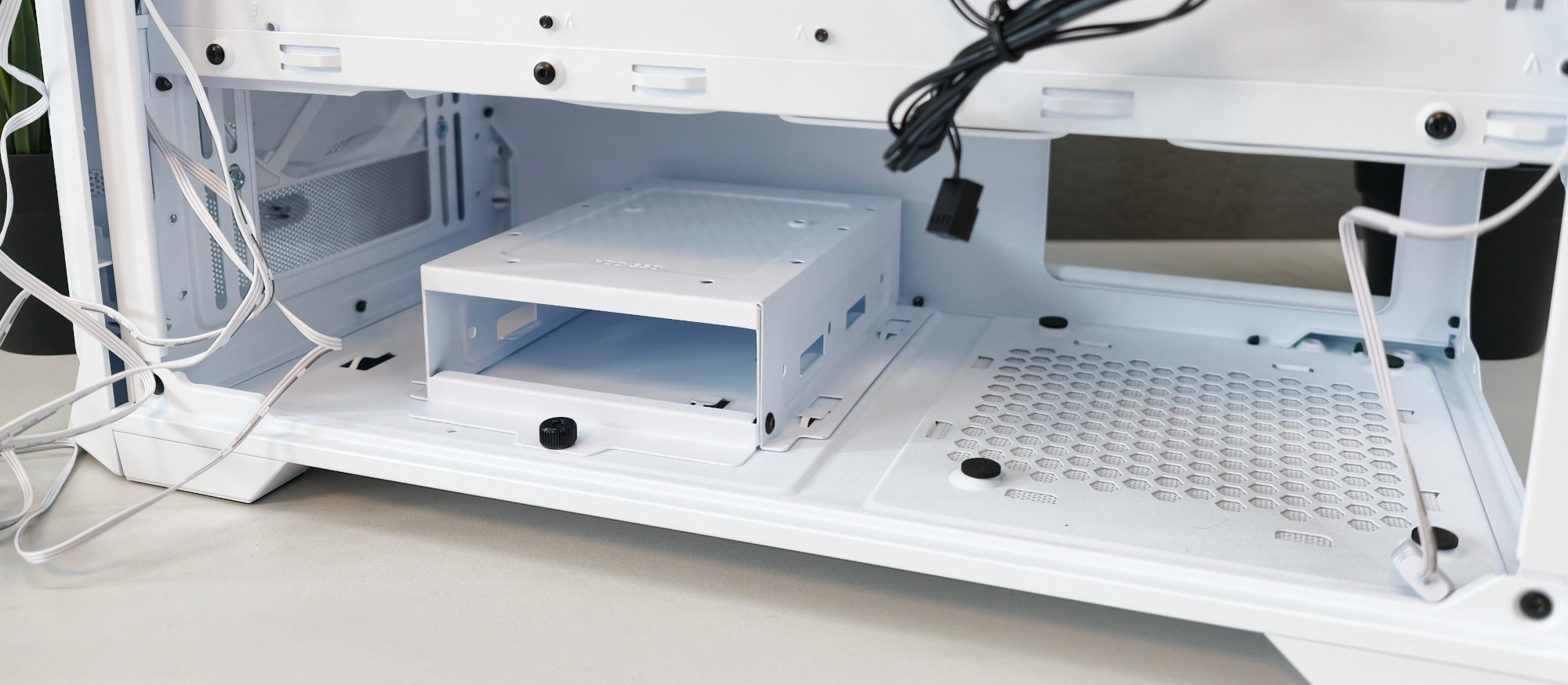 Нижний отсек блока питания вмещает корзину HDD на два устройства, а всего Raijintek Arcadia 41-MS4 поддерживает до пяти устройств хранения данных.