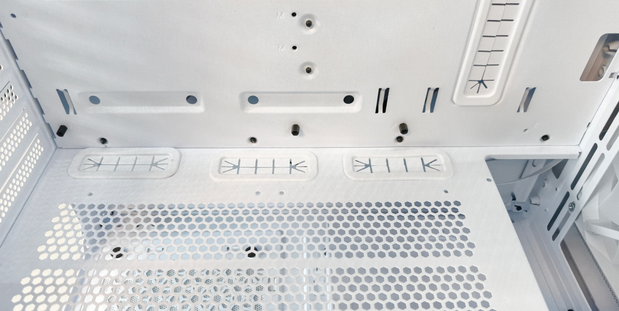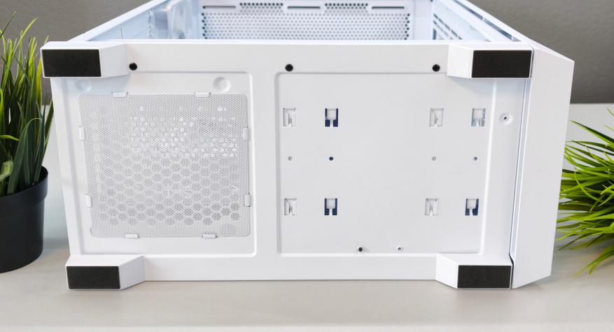А вот что приятно видеть — прорезиненные заглушки в каждом месте для кабелей. Редкий, но приятный факт. Также снизу можно установить два вентилятора 120 мм для обдува видеокарты.