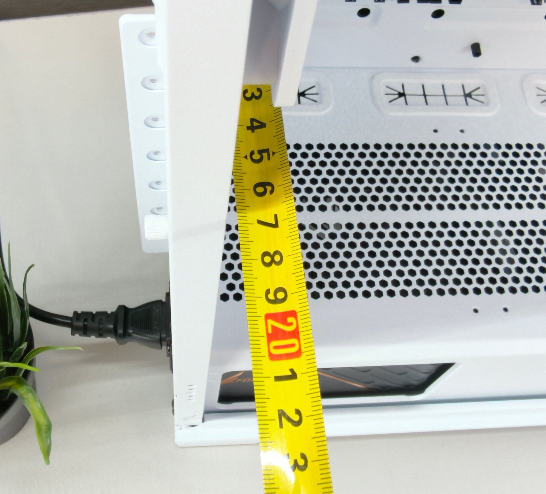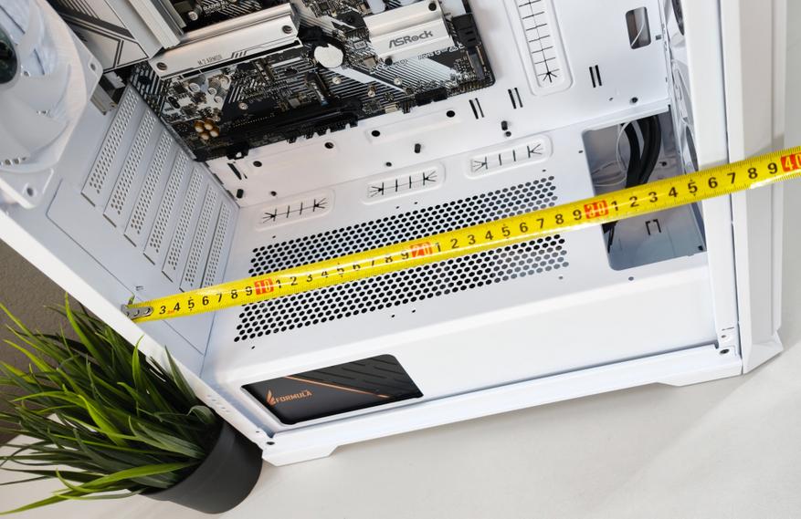 За задней глухой стенкой скрывается внутренняя часть корпуса. Достоинством модели Raijintek Arcadia 41-MS4 является полноценный контроллер вентиляторов и подсветки на 4 вертушки. Также можно измерить толщину металла, и официально она заявлена на отметке 0,5 мм, я же намерил от 0,5 мм до 0,7 мм в зависимости от части шасси (с учетом покраски). Для кабель-менеджмента до задней стенки расстояние составляет от 15 мм до 19 мм.