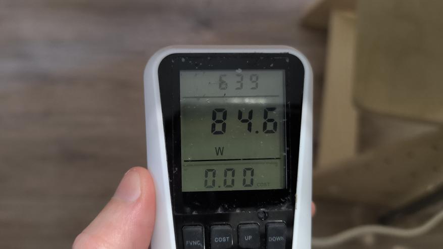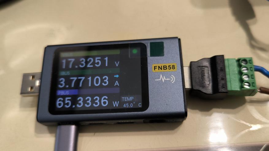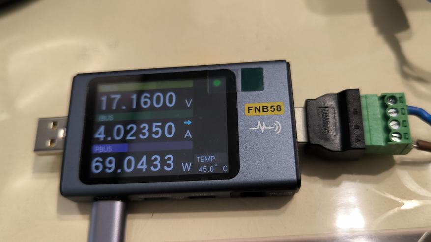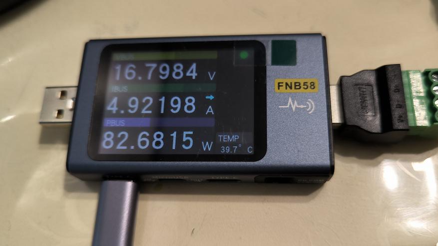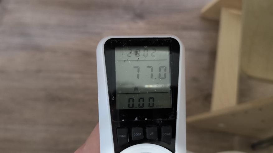 В этом тесте я применил именно ваттметр, так как моя самодельная конструкция, сделанная для подключения в разрыв выхода БП тестера FNB58, уже не могла нормально пропускать мощность около 80Вт, и сильно грелась (с соответствующим запахом пластика), занижая напряжение приходящее на мини-компьютер, да и сам компьютер отключался спустя некоторое время запуска теста. Если условно взять КПД БП за 90%, то 77Вт по ваттметру, будут соответствовать 69.3Вт потребления мини-компьютера.