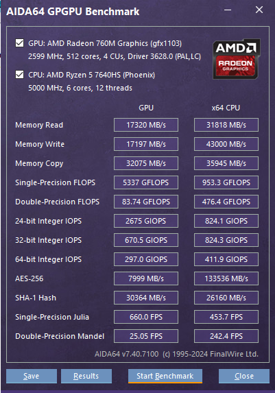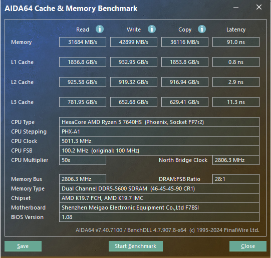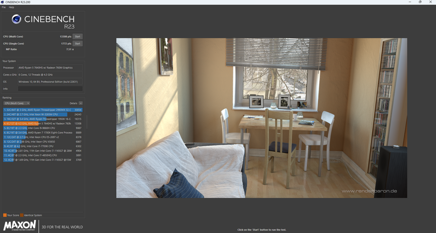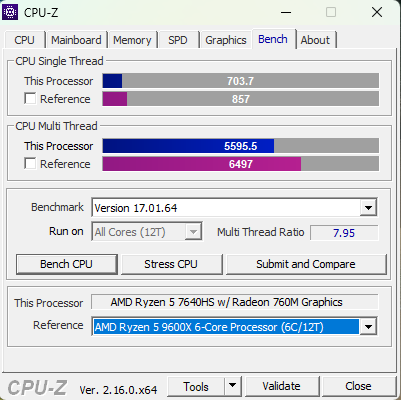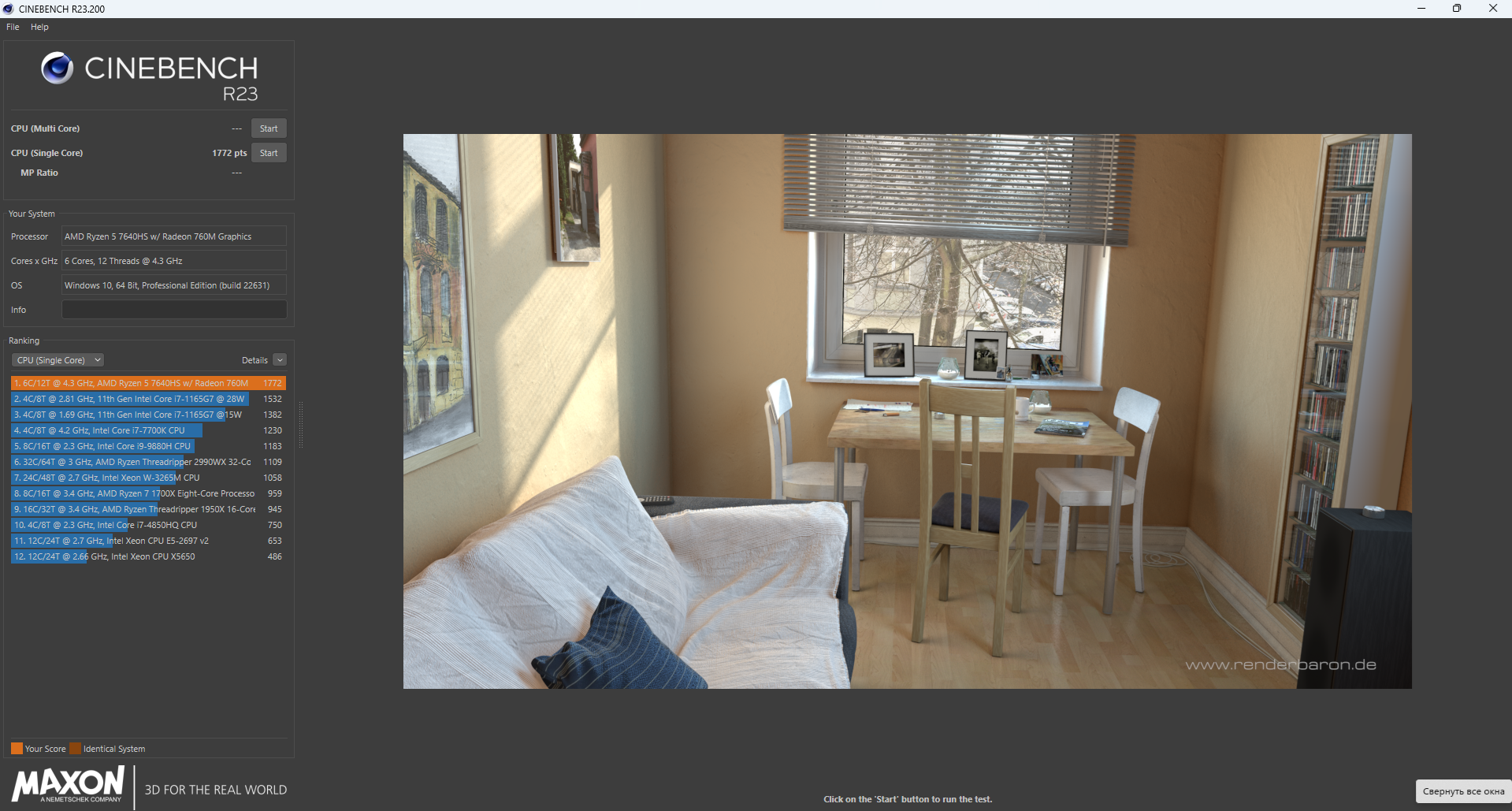 Во встроенном тесте, Ryzen 5 7640HS держится очень достойно, относительно результатов более свежего процессора Ryzen 5 9600X (Zen5), имеющего те же 6 ядер, но предназначенного уже для настольных компьютеров,