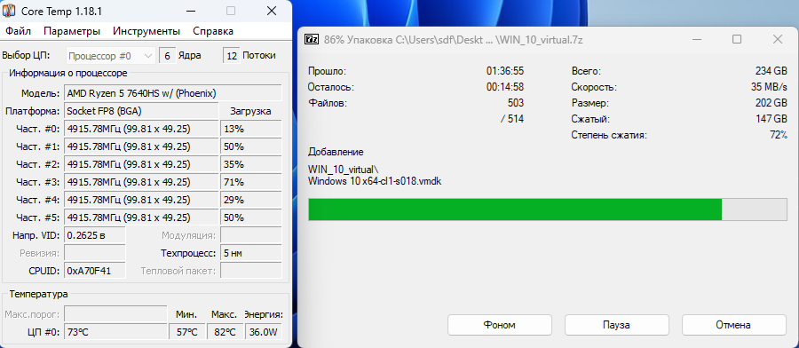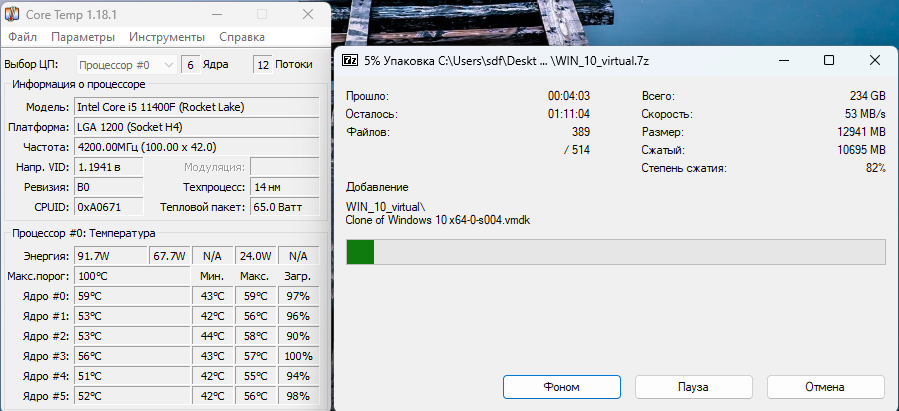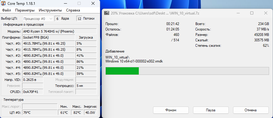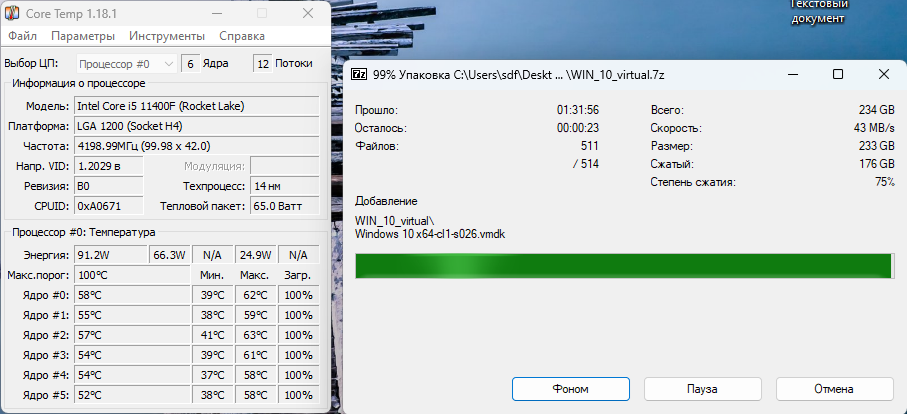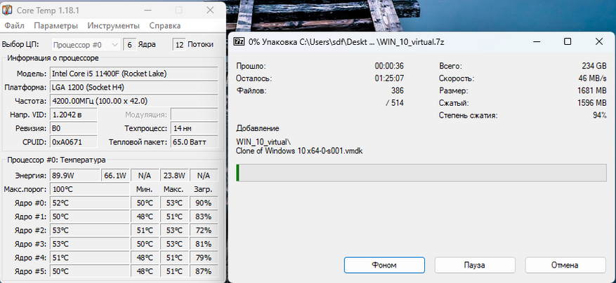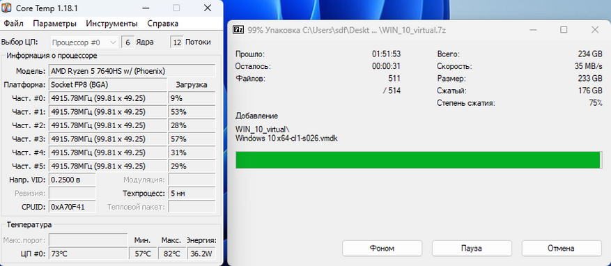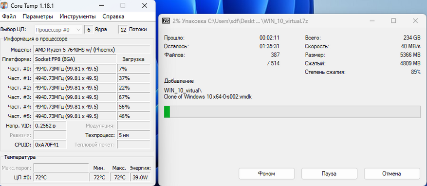 Возьмём объёмную папку с образом виртуальной машины (234ГБ), и посмотрим за какое время процессор испытуемого компьютера справится с её сжатием, и сравним этот результат с другим процессором. В качестве оппонента, будет снова использован более прожорливый Intel I5-11400F, работающий с снятым лимитом по TDP, но с небольшим андервольтом, что не так важно, как параметры оперативной памяти, которые в данном случае такие: 2*8ГБ DDR4 3600МГц.