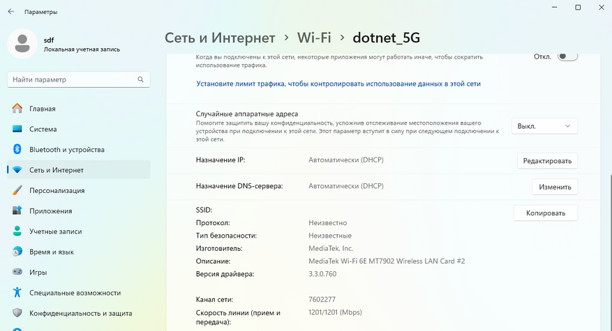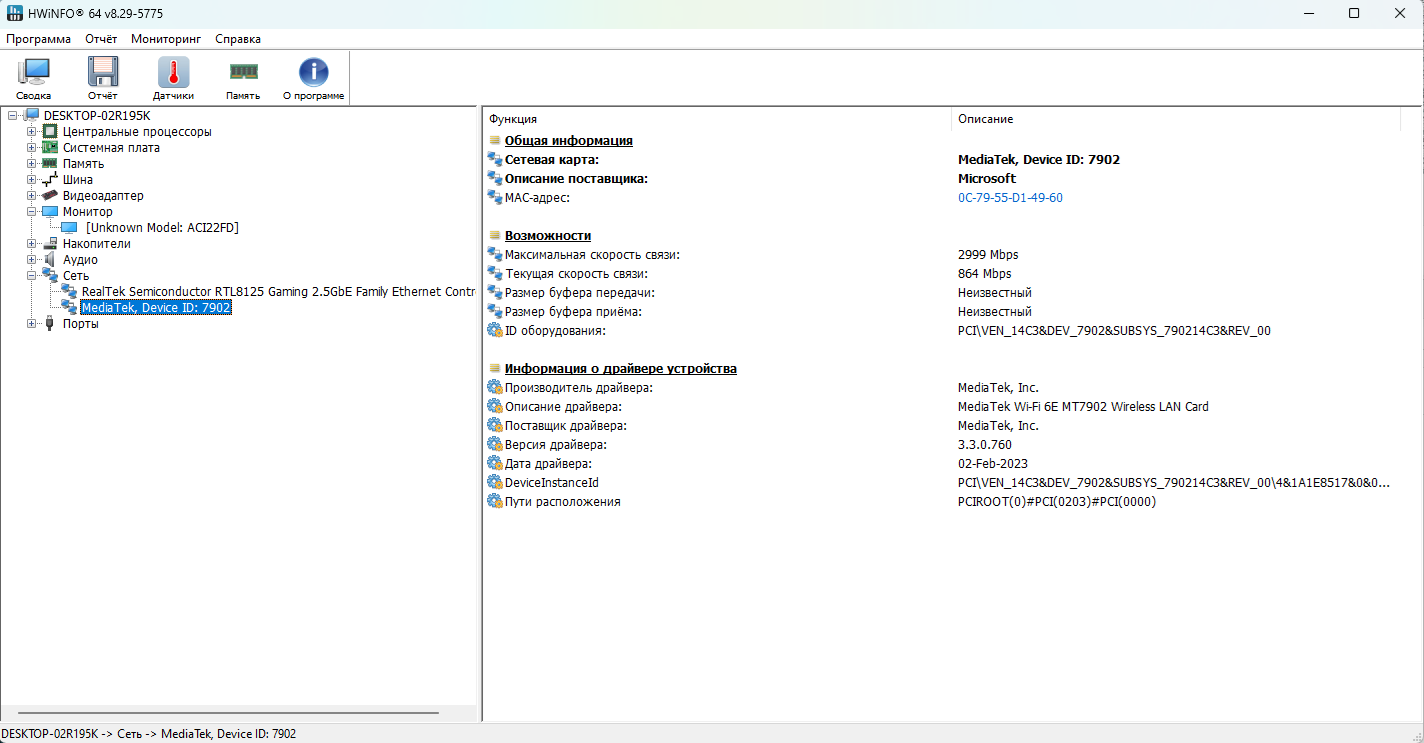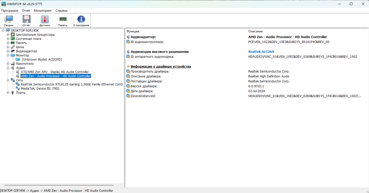 В качестве контроллеров ответственных за вывод звука, определяются Display HD Audio Controller, от встроенного видеоядра, и контроллер Realtek ALC269. В качестве контроллера Ethernet использован Realtek RTL8125, а в качестве контроллера WI-FI6E — MT7902 (MTK).