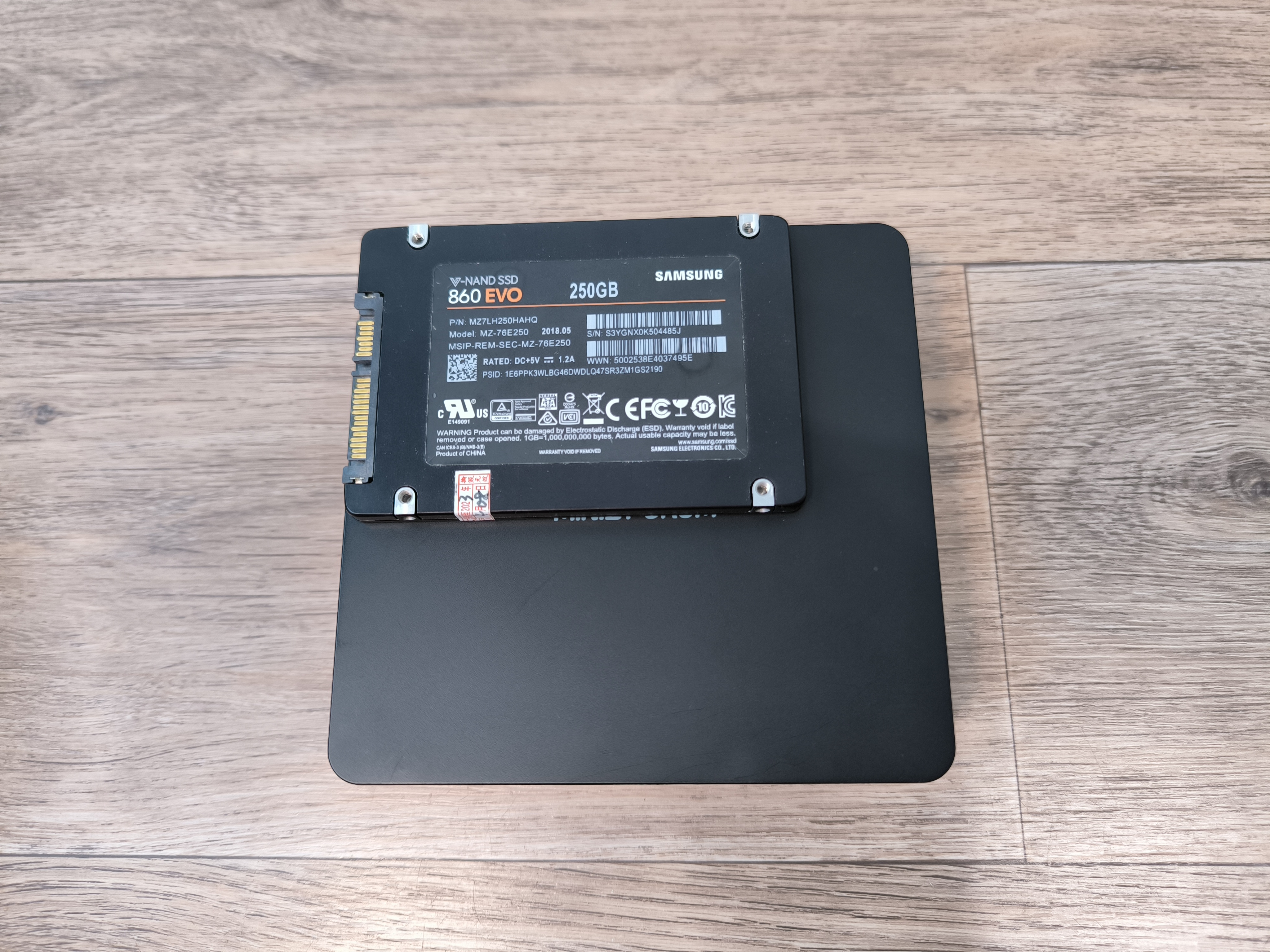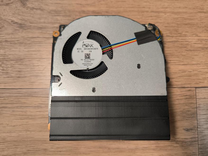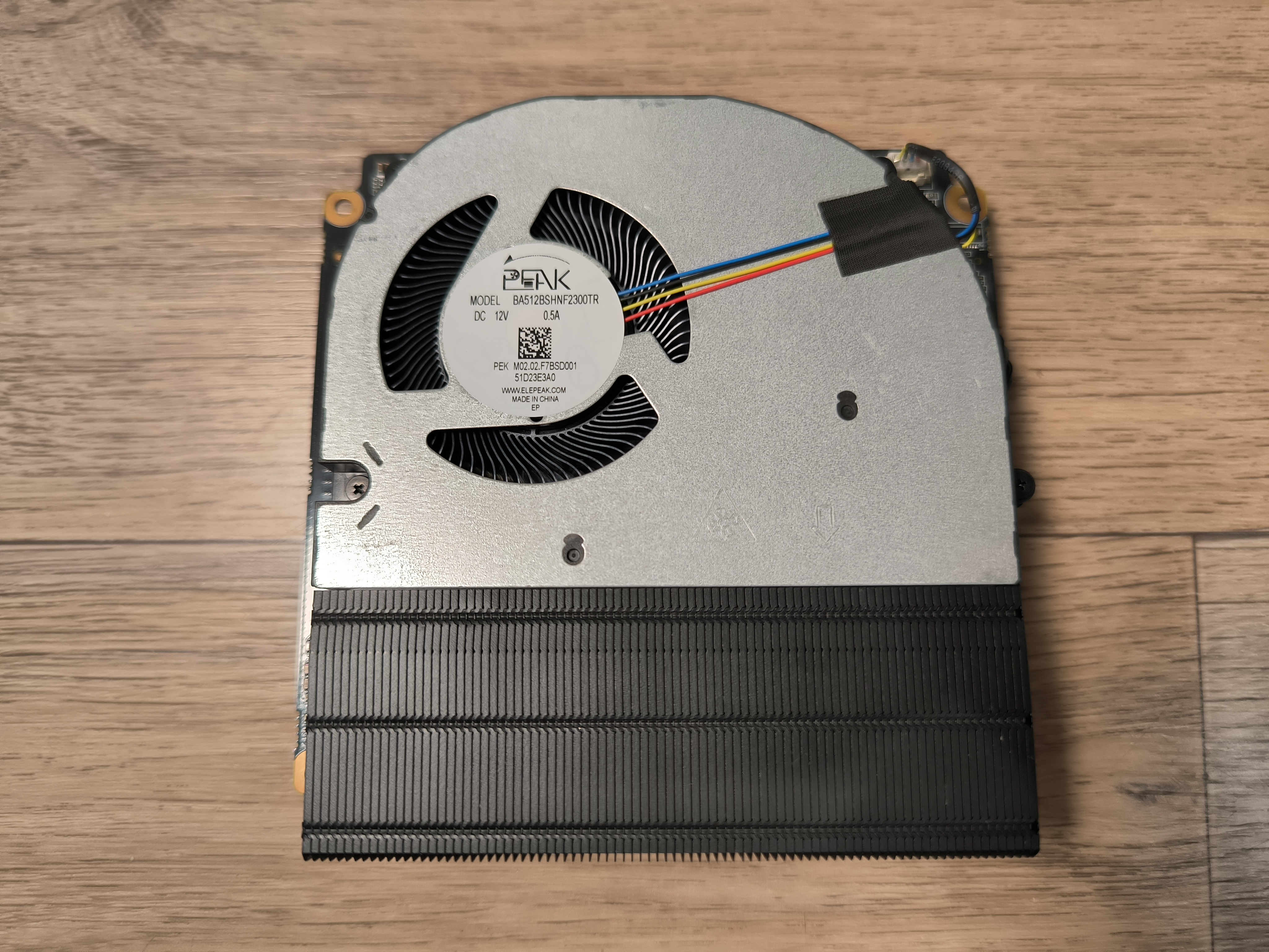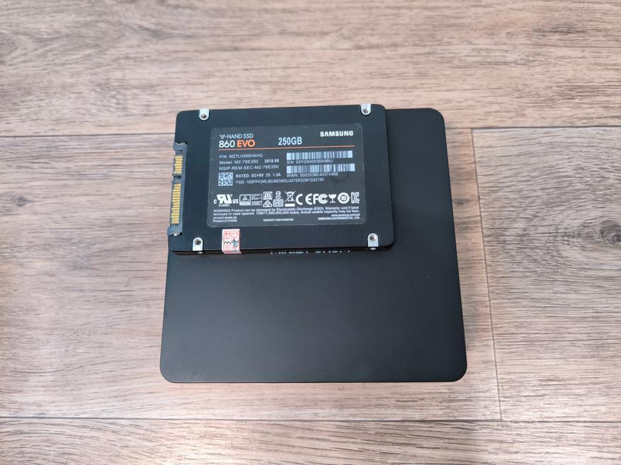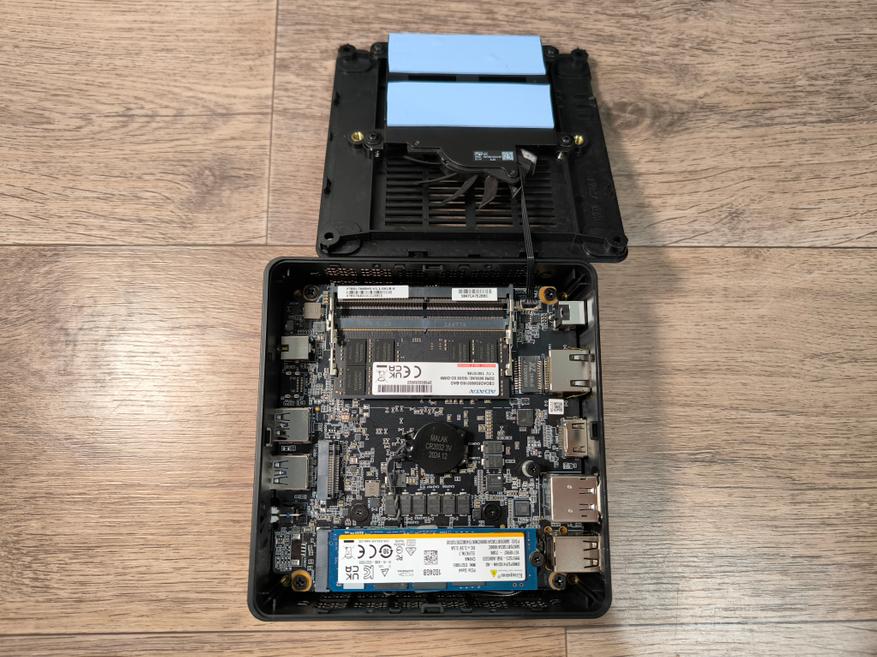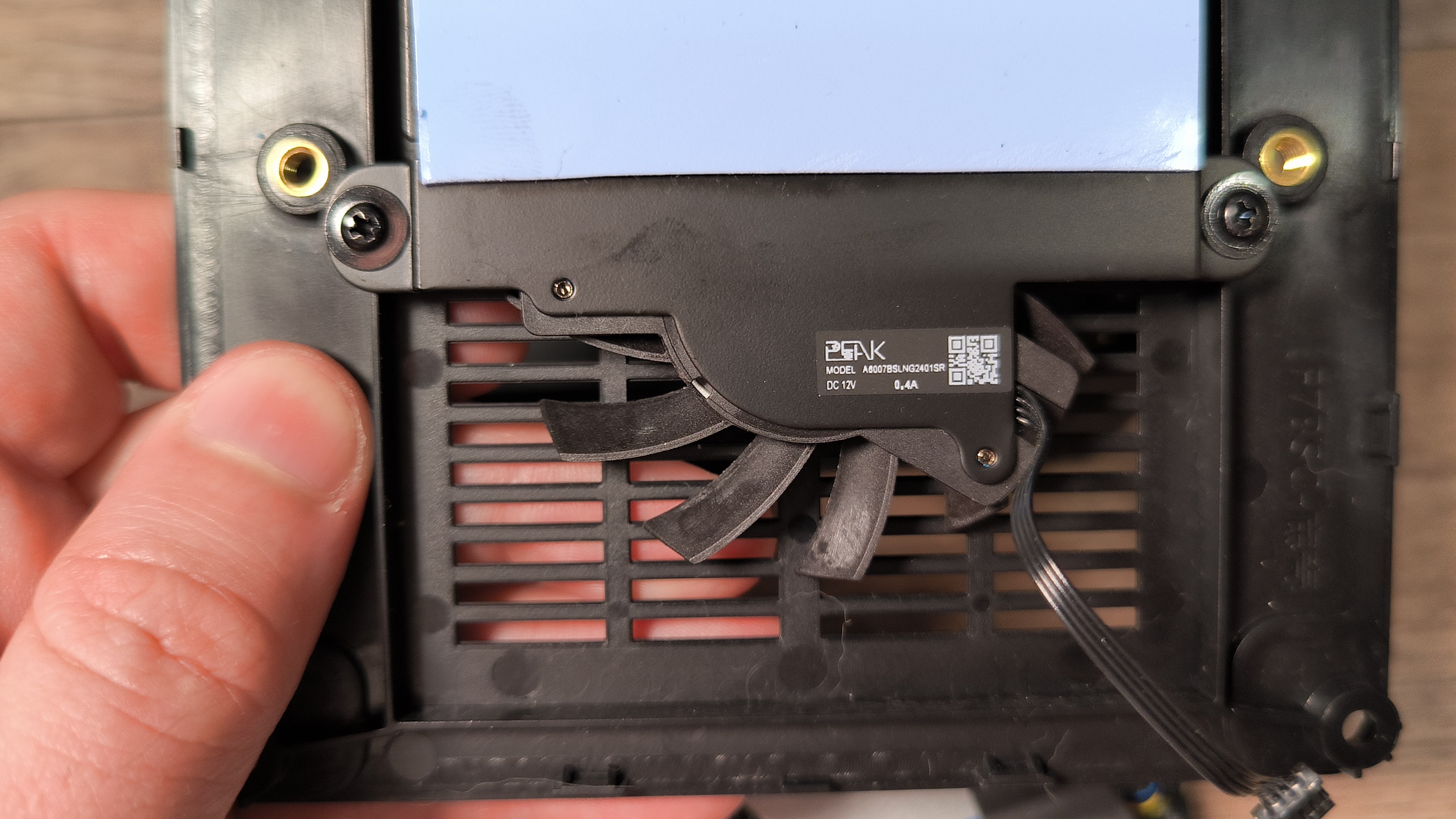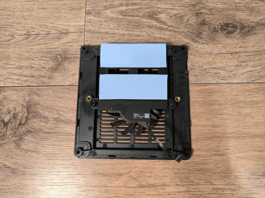 В нижнюю крышку встроен небольшой вентилятор (ШИМ управление), а также, вмонтирована металлическая пластина, выступающая в роли радиатора для SSD. На пластину наклеены сразу две термопрокладки, где одна отводит тепло с предустановленного NVMe SSD, а вторая предназначена для второго М.2 NVMe SSD, который не устанавливается с завода.