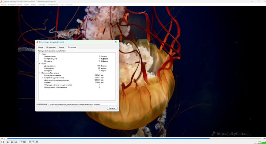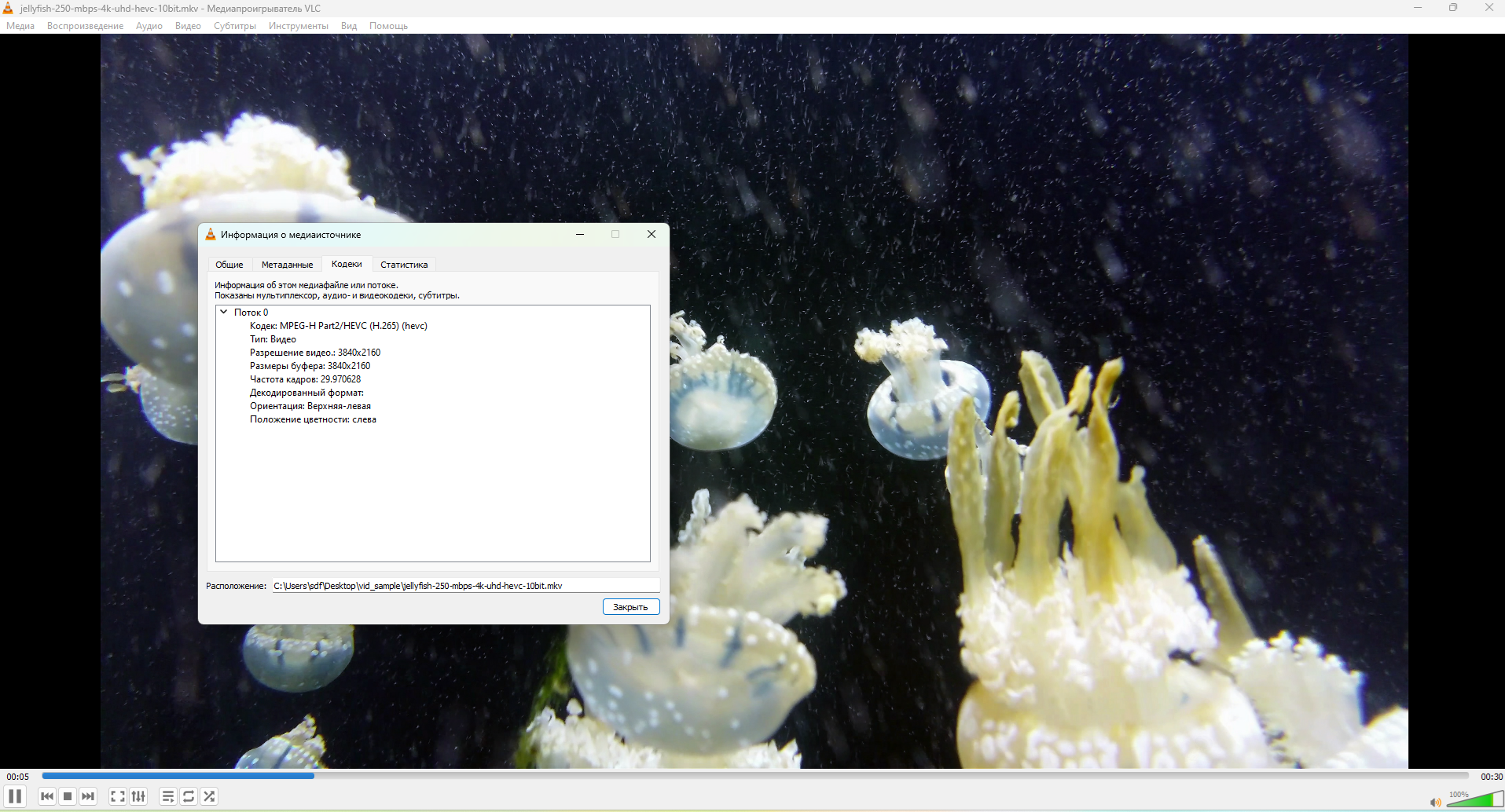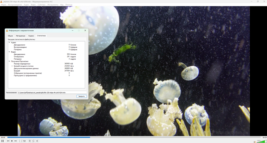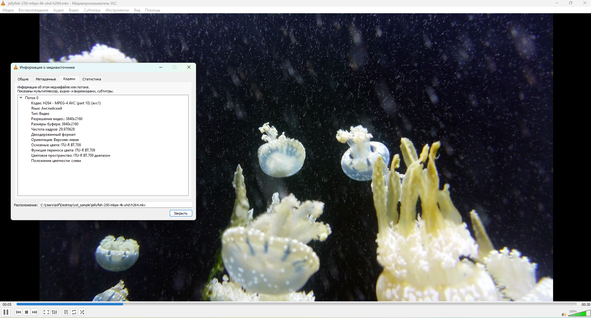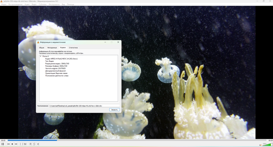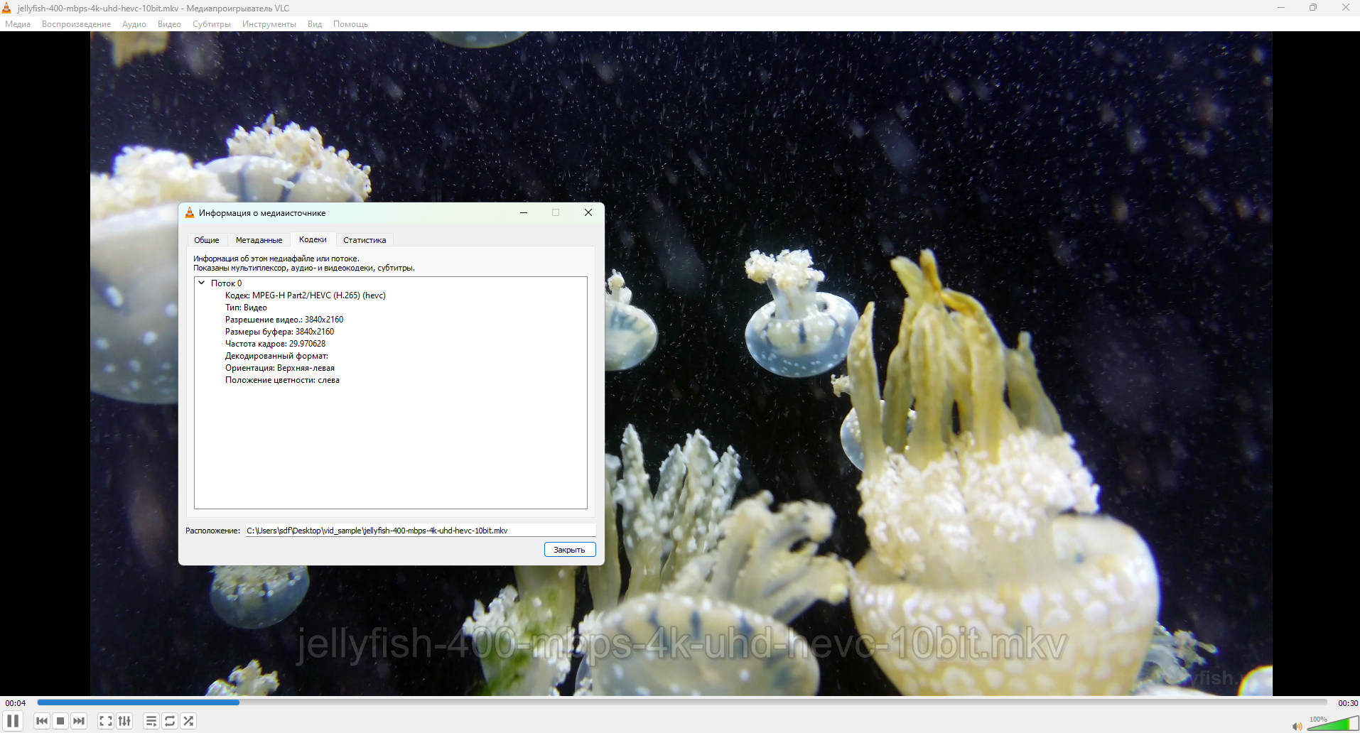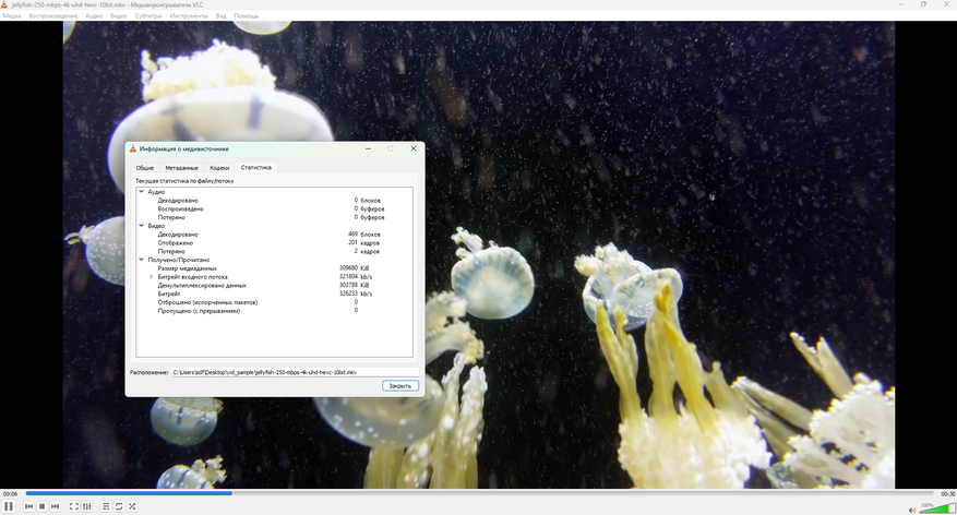 При битрейте 400Мбит/c, кодеке H265, и глубине цвета 10 бит, в VLC плеере уже наблюдаются пропуски кадров, и подёргивания картинки. При этом, в встроенном в ОС медиаплеере, я не заметил каких-то явных дерганий картинки «на глаз», но в то же время, чувствуется что возможности декодирования уже на пределе (жаль там нет статистики). В любом случае, публичного контента с такими параметрами сейчас очень мало, и по поводу возможных проблем при проигрывании видео с высоким битрейтом, и одновременно высокой глубиной цвета, можно не переживать.