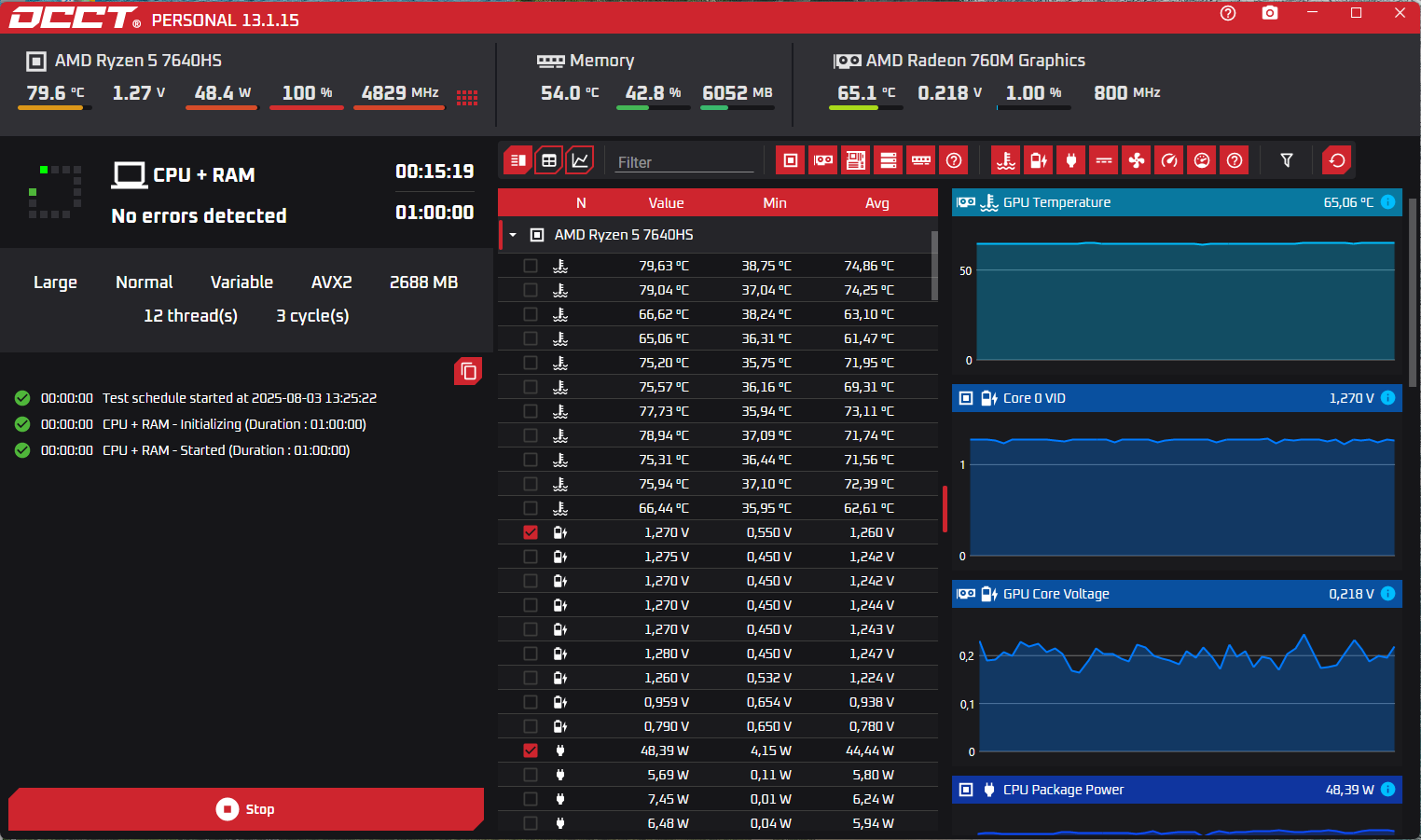 В тесте OCCT, который был запущен на 15 минут, температура процессора не поднималась выше 81 градуса (C), при температуре в помещении около 28 градусов (C). Компьютер потреблял при этом 65Вт-69Вт, где непосредственно сам процессор потреблял от 45Вт до 49Вт, согласно показаний программы OCCT (видимо, была зависимость от этапа теста). Спустя 15 минут после начала теста, процессор работал на частоте около 4.8ГГц, при том что изначально стартовал с отметки в районе 4.9ГГц.