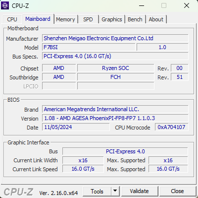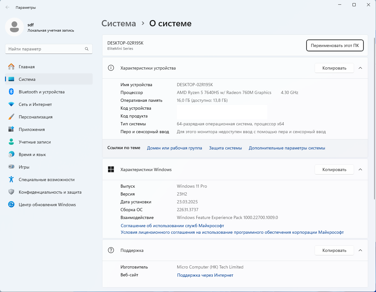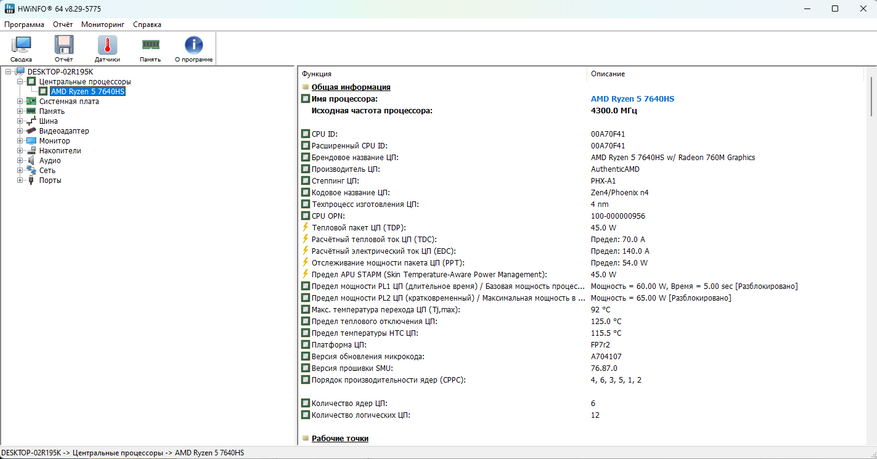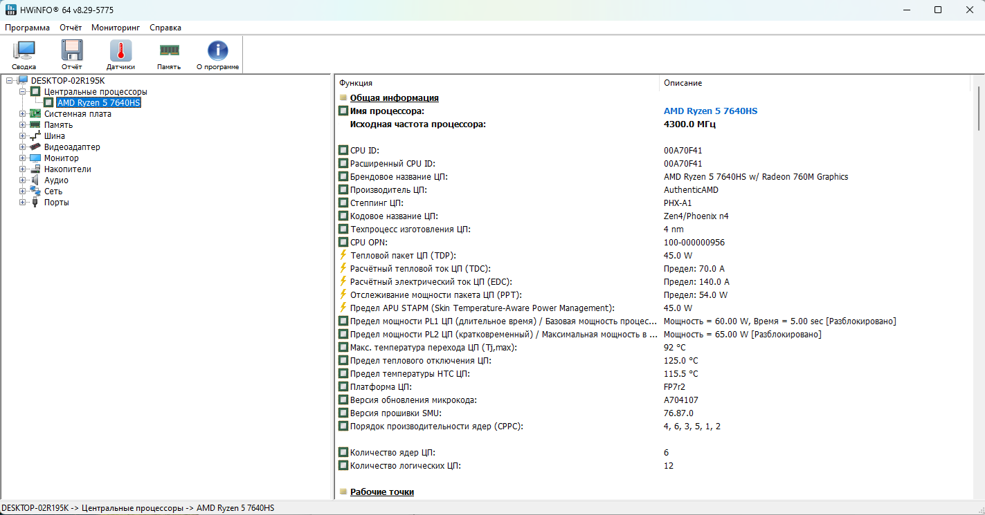 Процессор определяется как Ryzen 5 7640HS (4 нм, Zen4, «встройка» Radeon 760M), с базовой частотой 4300МГц, рассчитанный на TDP 45Вт, с возможным кратковременным увеличением TDP до 65/60Вт. Память DDR5 5600МГц, с объёмом 16ГБ, от ADATA. Память работает в одноканальном режиме. Производитель чипов памяти — Micron.