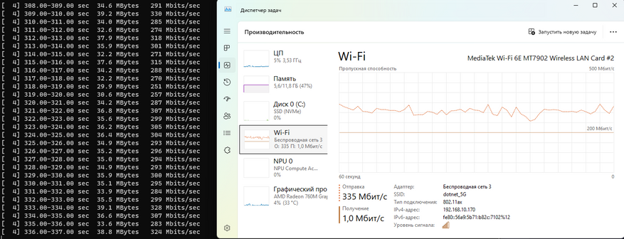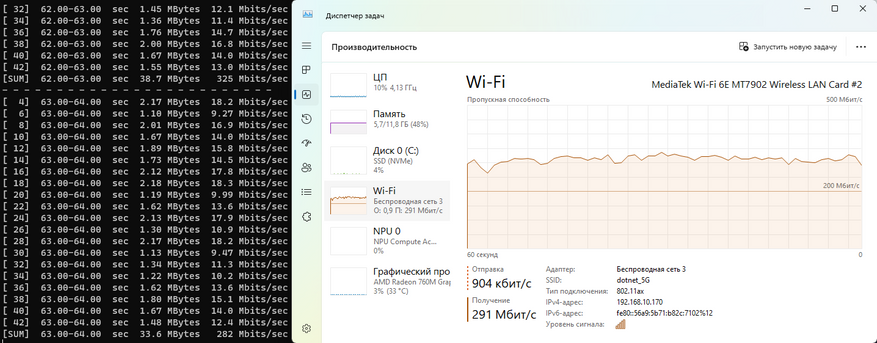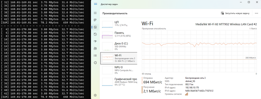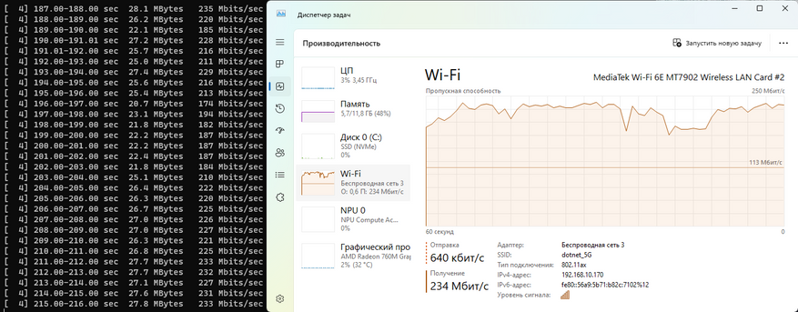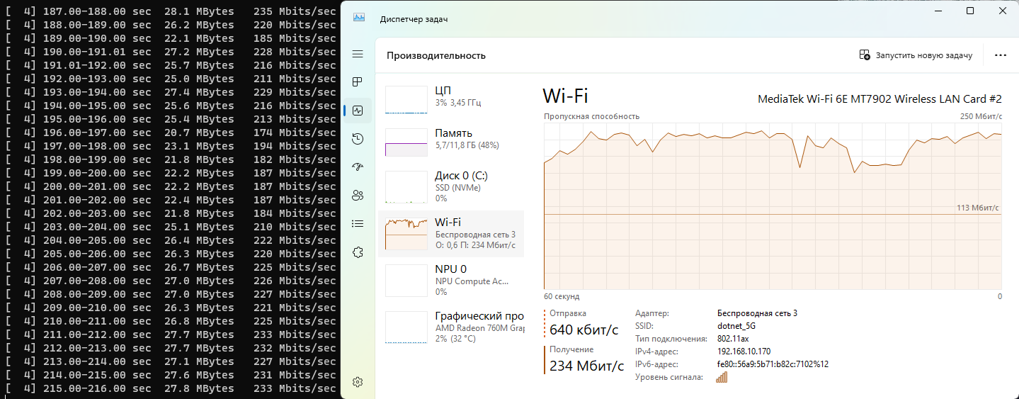 Мини-компьютер находился на удаление от роутера Honor Router 3 (XD20), сигнал от которого проходил через пару тонких стен, и был не самым сильным, но зато это приближено к реальным сценариям использования внутри жилых помещений. Роутер по гигабитному Ethernet был связан с стационарным компьютером, где был запущен сервер iperf. Что касается беспроводных возможностей роутера, то по 5ГГц сети, там был выставлен не занятый канал, при максимально возможной полосе 160МГц, и соответственно использовался WI-FI6 (802.11ax). При таких параметрах, максимальная скорость подключения может составлять 2402 Мбит/с, при том, что WI-FI модуль MT7902BEN поддерживает максимальную скорость подключения пол 5ГГц, до 1201Мбит/c, и такую скорость удалось получить в реальности.