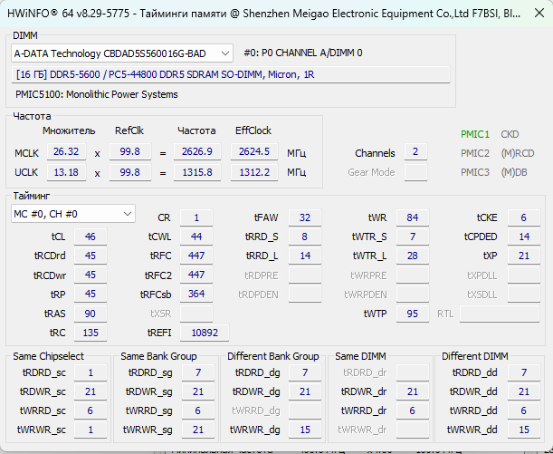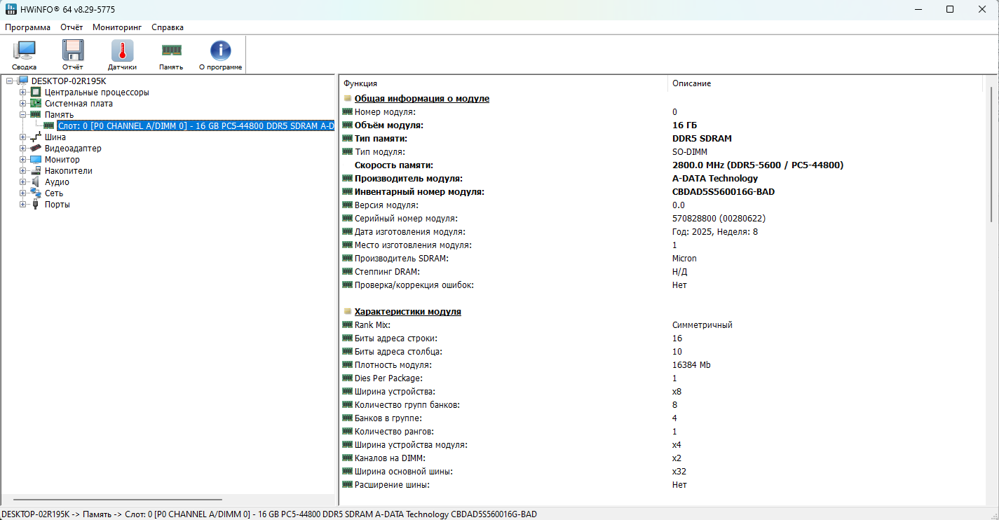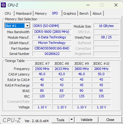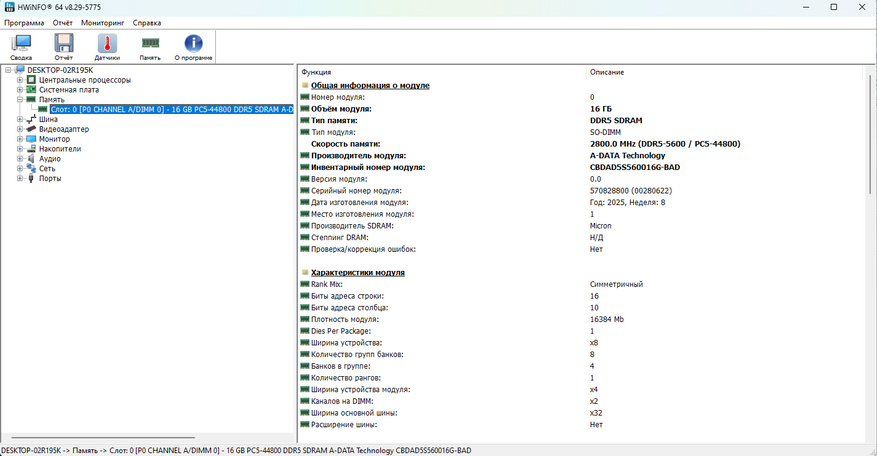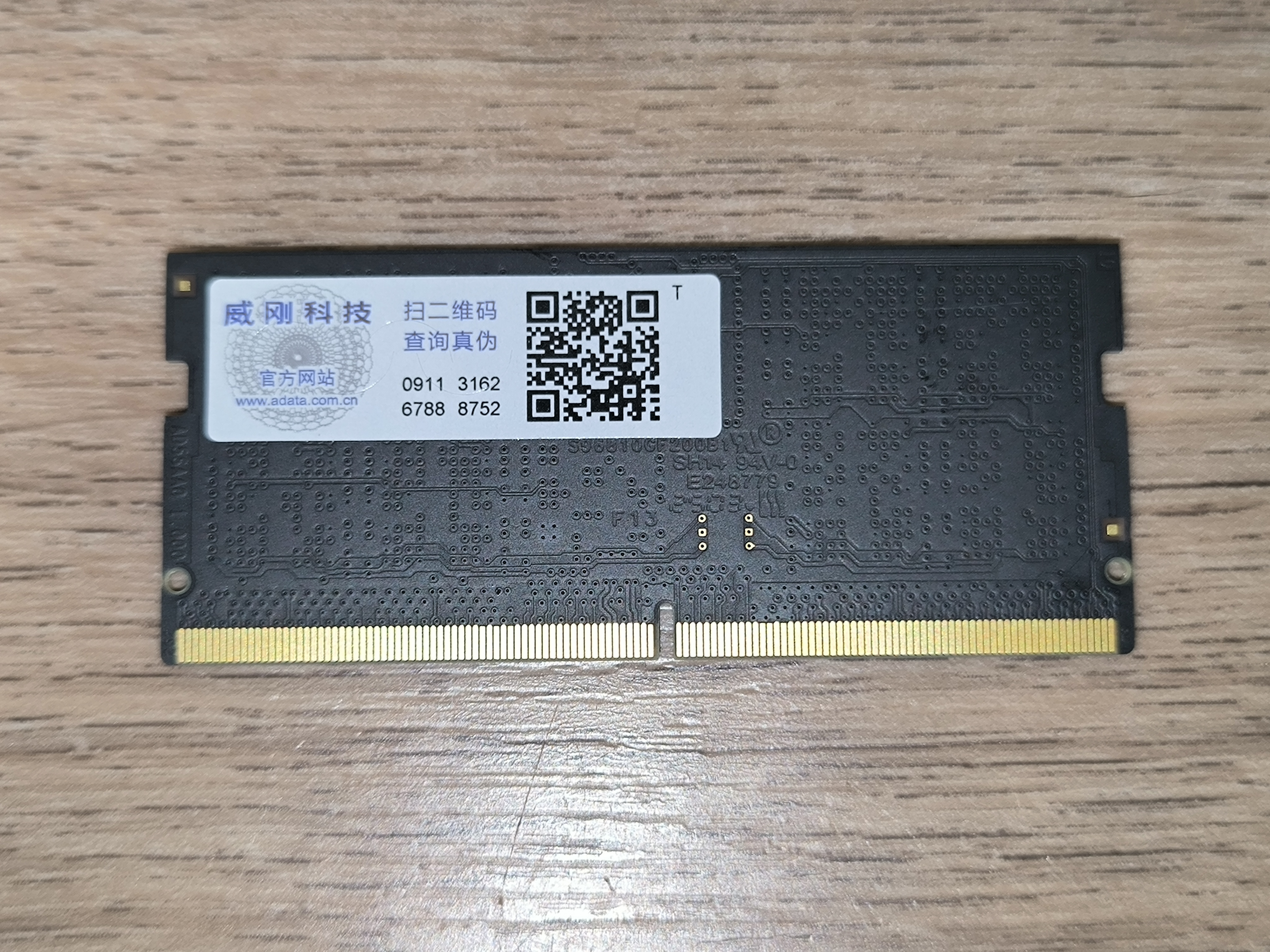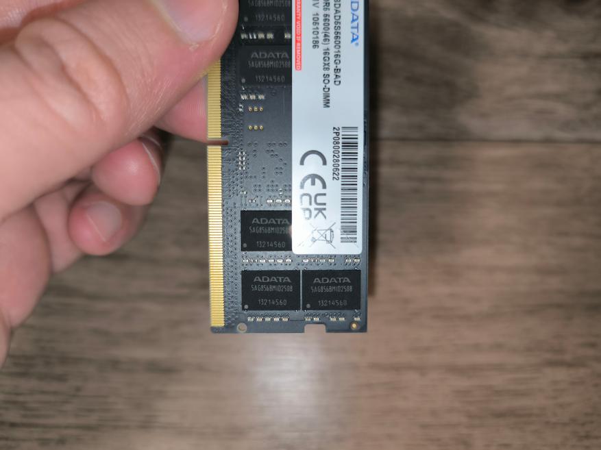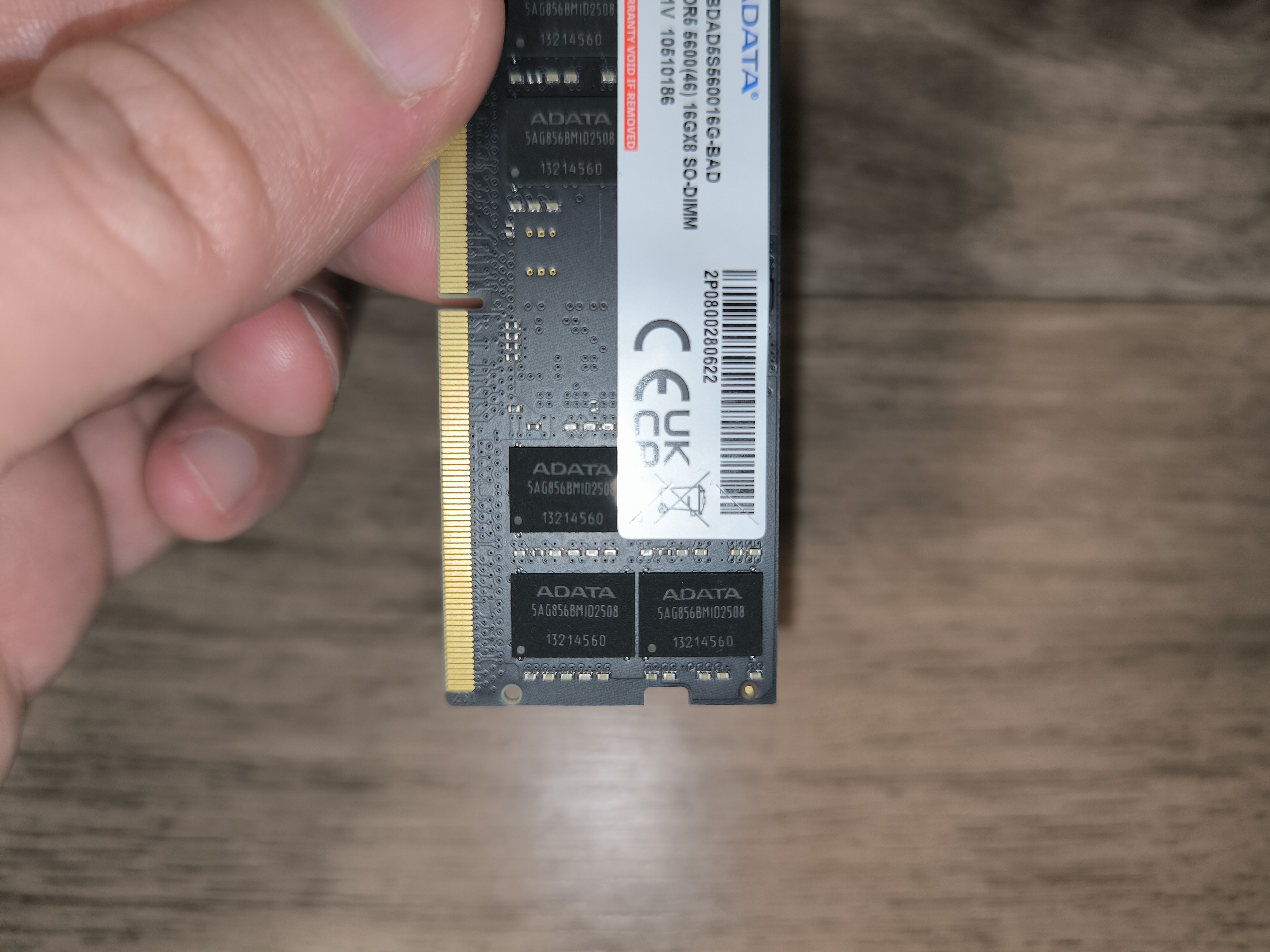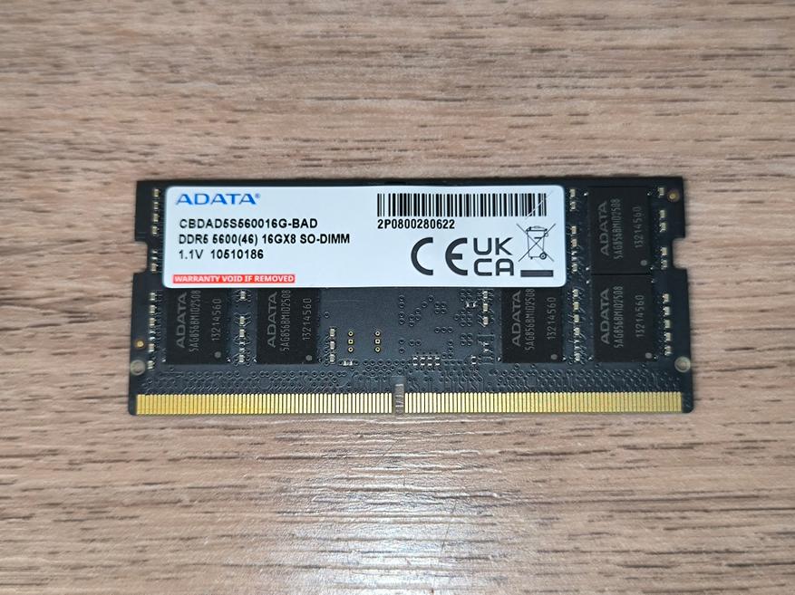 На противоположной от SSD стороне платы, видны два слота SO-DIMM, где предустановлен один модуль памяти DDR5 на 16ГБ, с эффективной частотой 5600МГц, от компании ADATA. Модуль односторонний, собран на 8 чипах с маркировкой ADATA (фактический производитель чипов памяти — Micron).