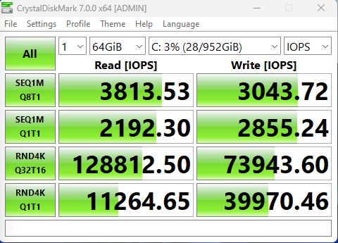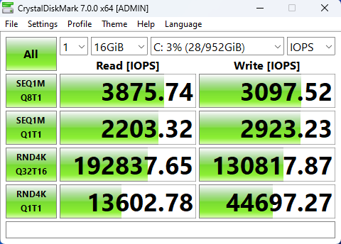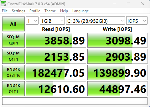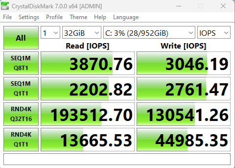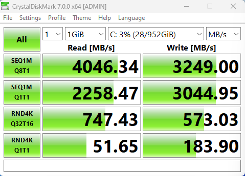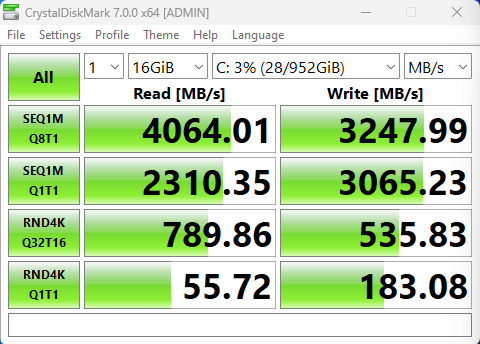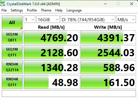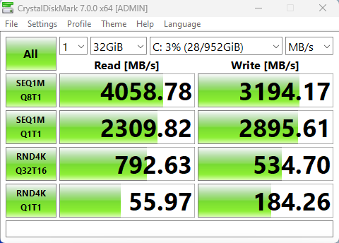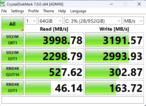Как можно видеть со скриншотов, максимальная скорость линейного чтения составила около 4000МБ/c, а максимальная скорость линейной записи, была в районе 3200МБ/c. По скорости случайного чтения блоками по 4КБ, тоже всё нормально, по меркам бюджетного NVMe SSD.