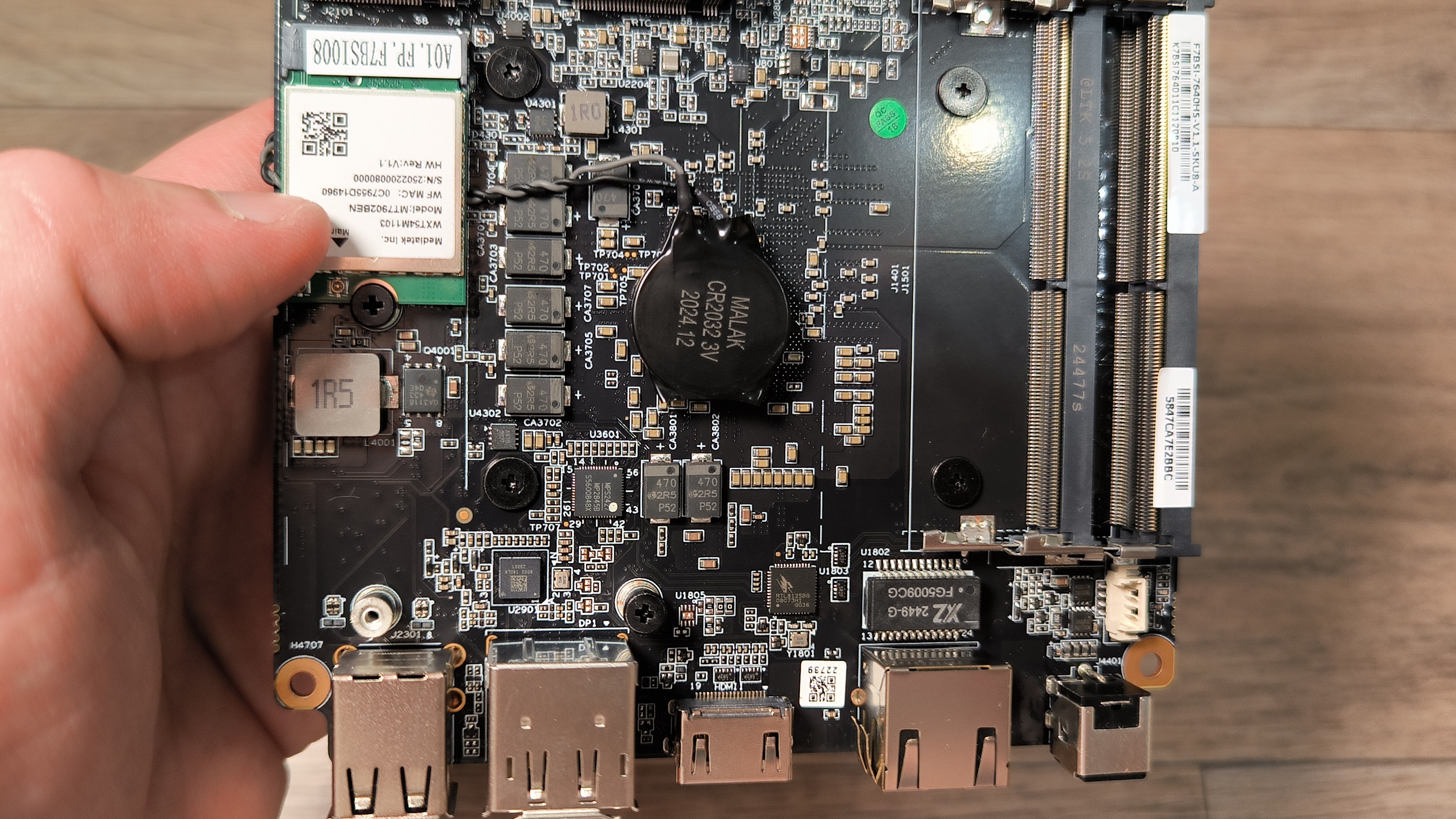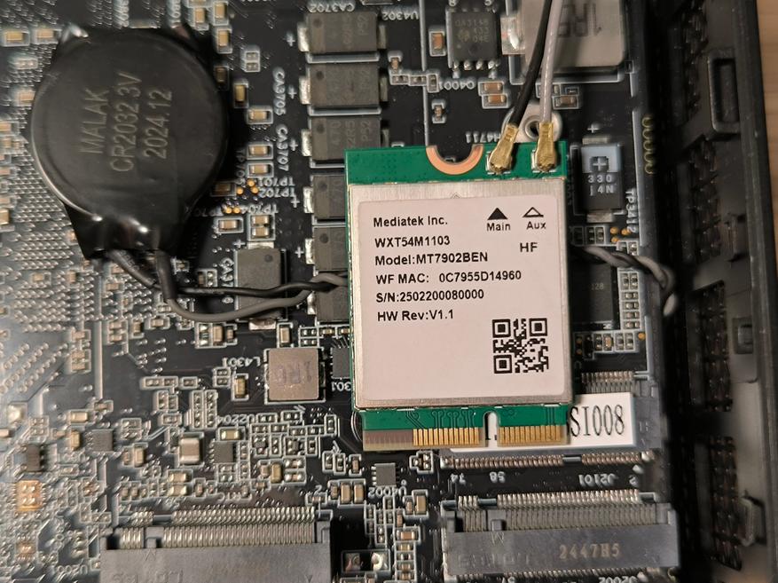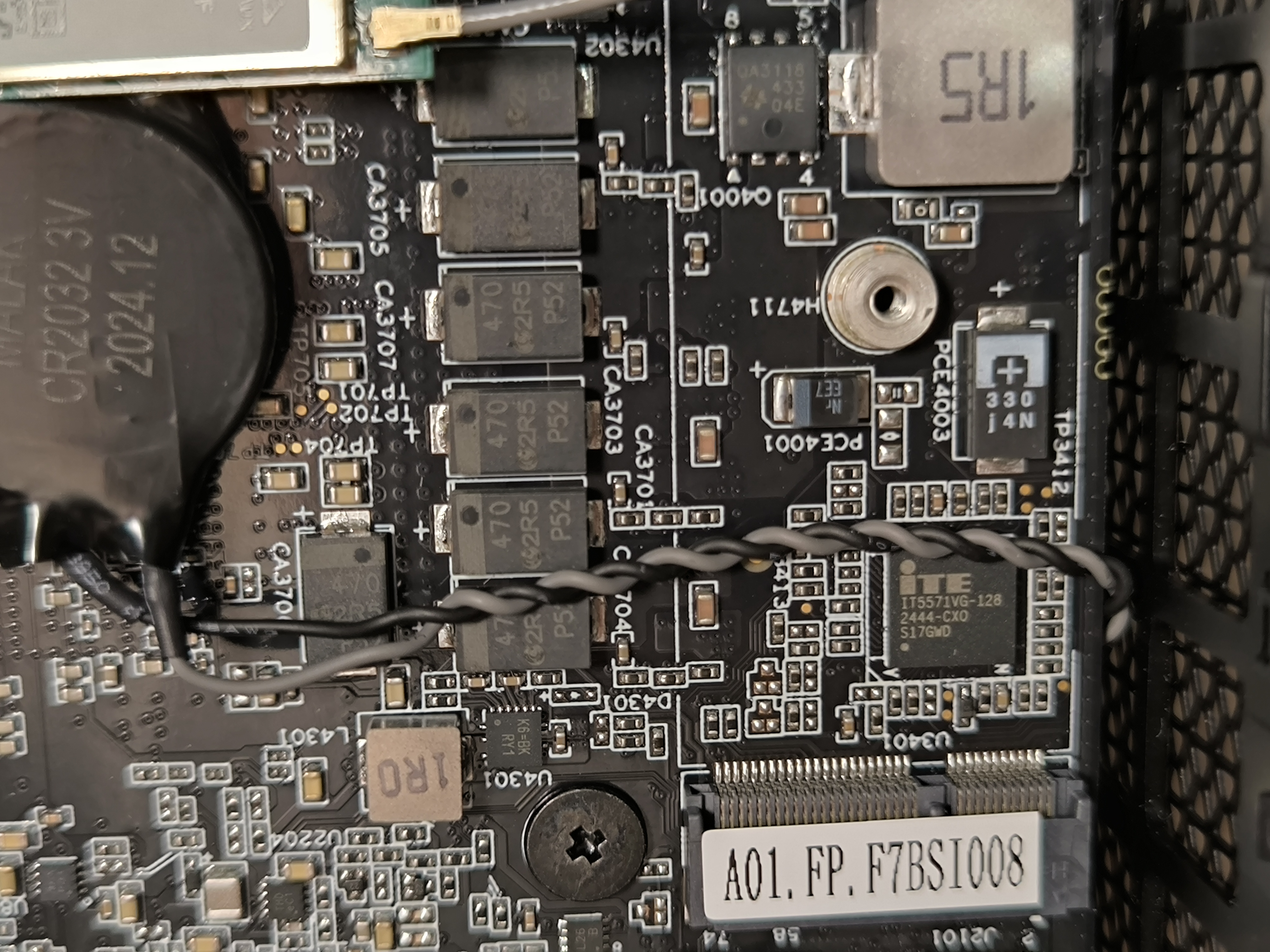 К платье приклеена батарейка CMOS формата CR2032, находящаяся в защитной оболочке. Под WI-FI6E модулем расположился мультиконтроллер IT5571VG-128. Так же, на плате распаян контроллер Ethernet RTL8125 (2.5Гигабит/c).