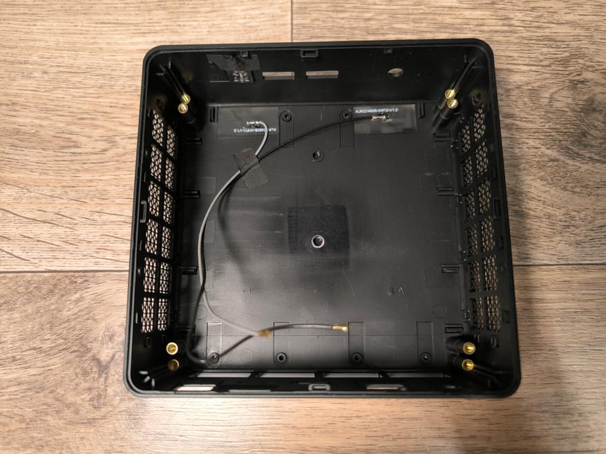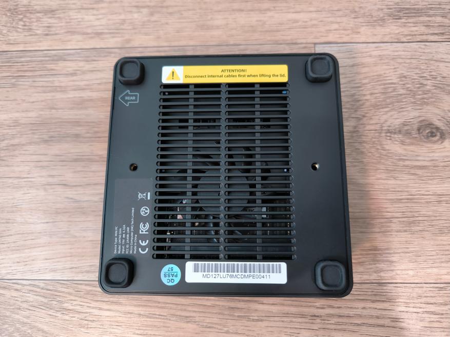 Снизу, компьютер имеет достаточно высокие ножки (с большой общей площадью), благодаря чему, воздух забирается внутрь корпуса более эффективно, и компьютер при этом устойчиво держится на поверхности того же стола. Единственное, ножки приклеены к корпусу, и при разборе компьютера (например, установка второго SSD или второго модуля памяти), их придётся отклеить, что бы добавиться до винтов нижней крышки. Ножки имеют многоразовую клеевую поверхность.