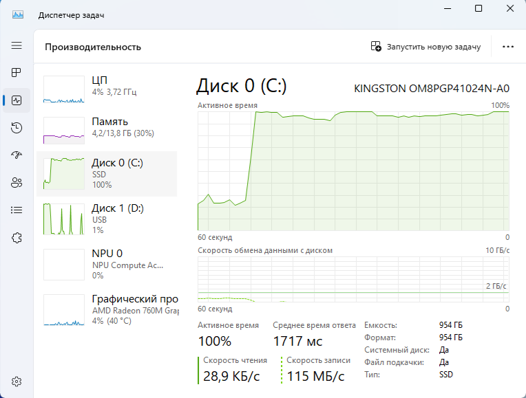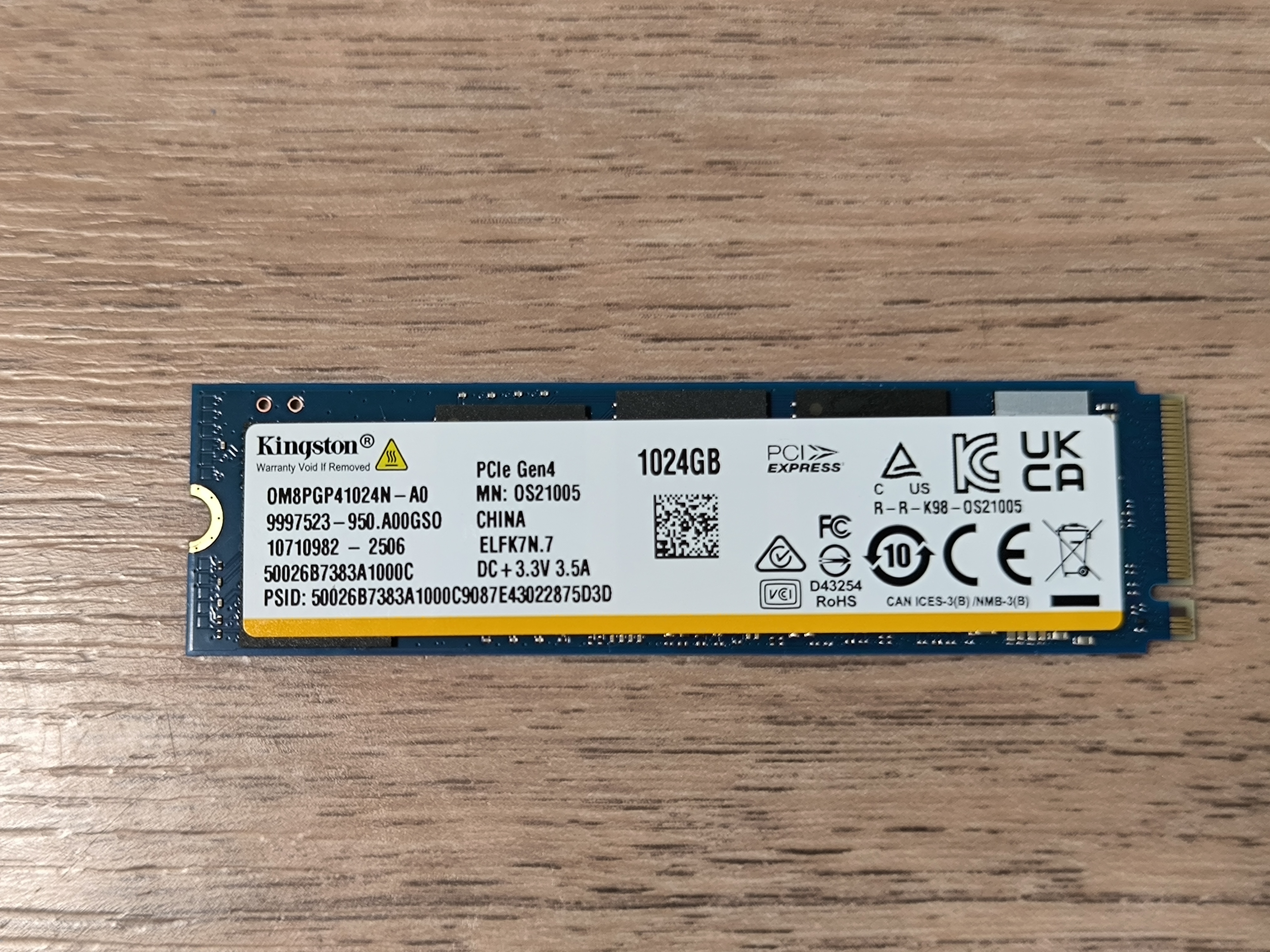 В качестве предустановленного SSD накопителя, используется Kingston OM8PGP41024N, с ёмкостью 1ТБ. Это OEM SSD от Kingston, поддерживающий PCI-E Gen4. Данный SSD построен на 4 чипах Flash памяти, и имеет небольшой контроллер. Судя по всему, это аналог Kingston NV2. Подробнее о SSD поговорим чуть позже.