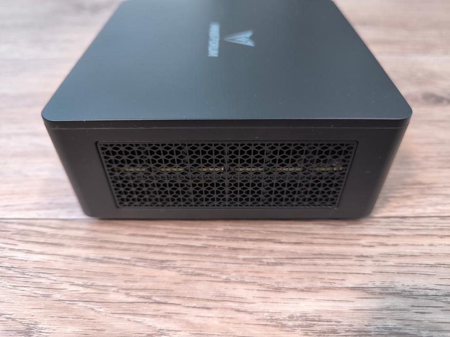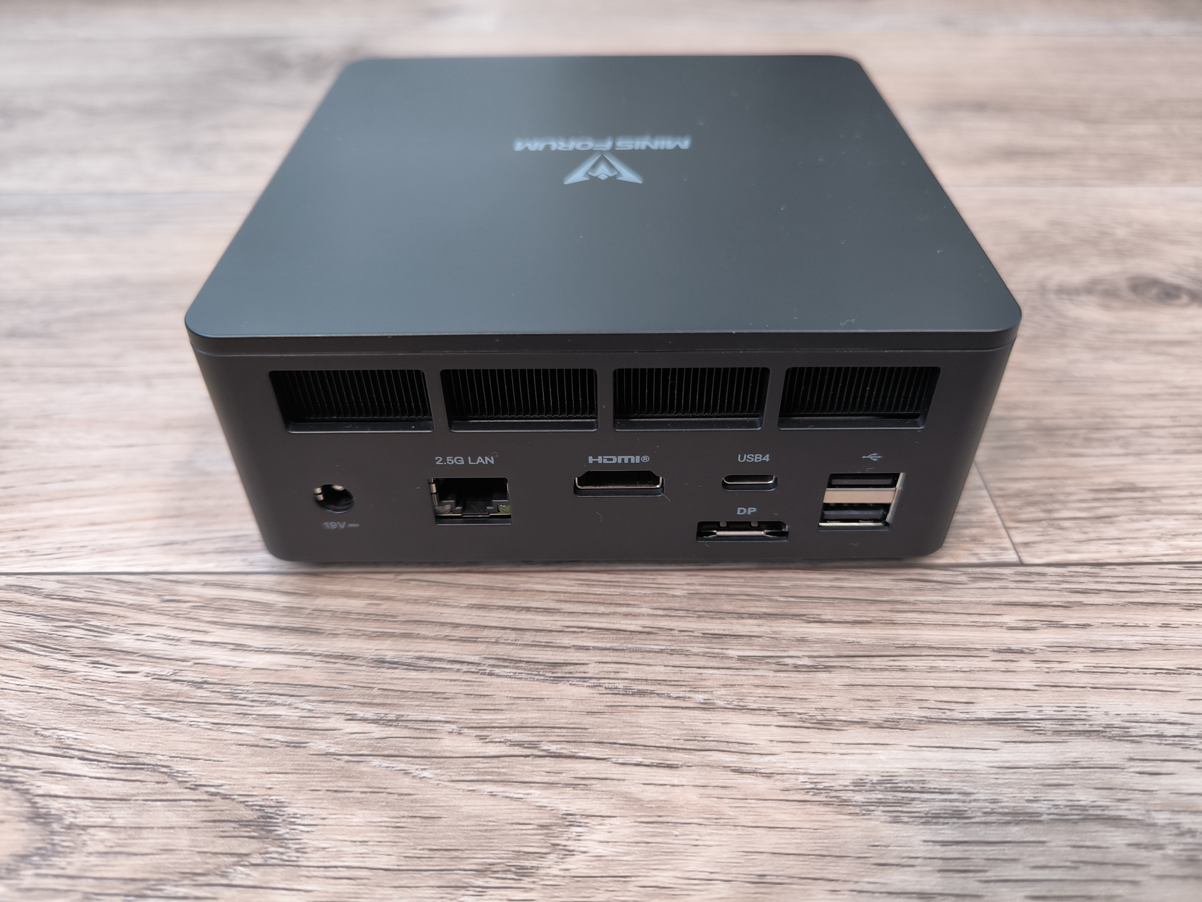 С задней стороны компьютера расположен разъём для подачи питания (19В), порт Ethernet (до 2.5Гбит/c), HDMI порт, Type-C порт (USB 4, PD), DP порт, и два медленных USB 2.0 порта (например, для использования с приёмниками беспроводной мыши и клавиатуры).