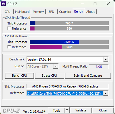 Так же, я сравнил Ryzen 5 7640HS с гораздо более старым шестиядерником от intel, в лице I7-8700K, где процессор от AMD выйграл с ощутимым отрывом (на 28% быстрее в однопотоке, и 50% быстрее в многопотоке).