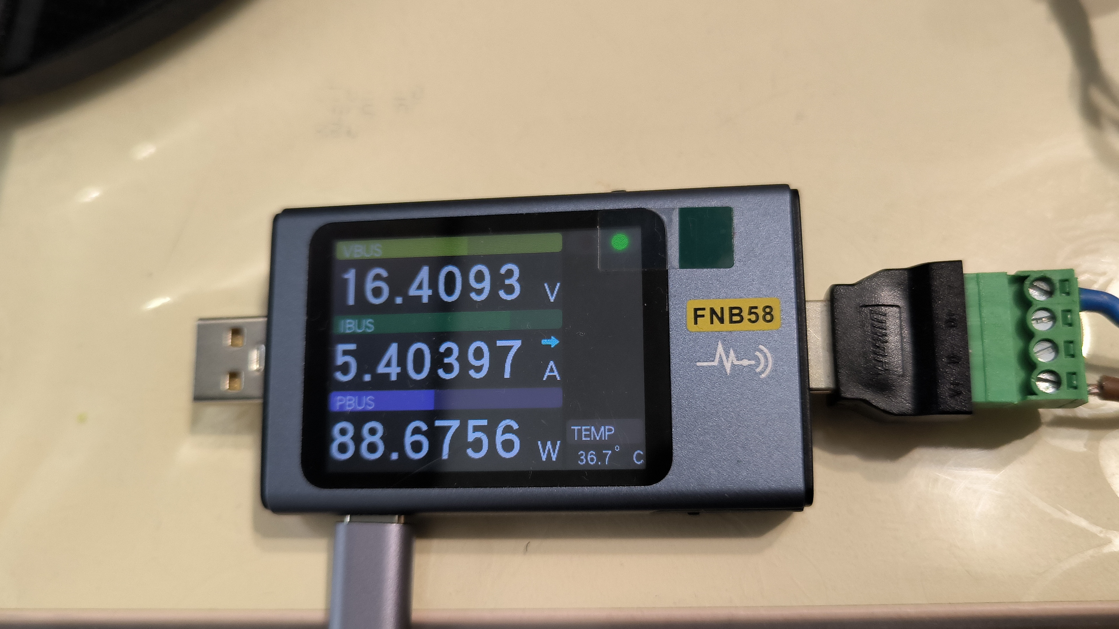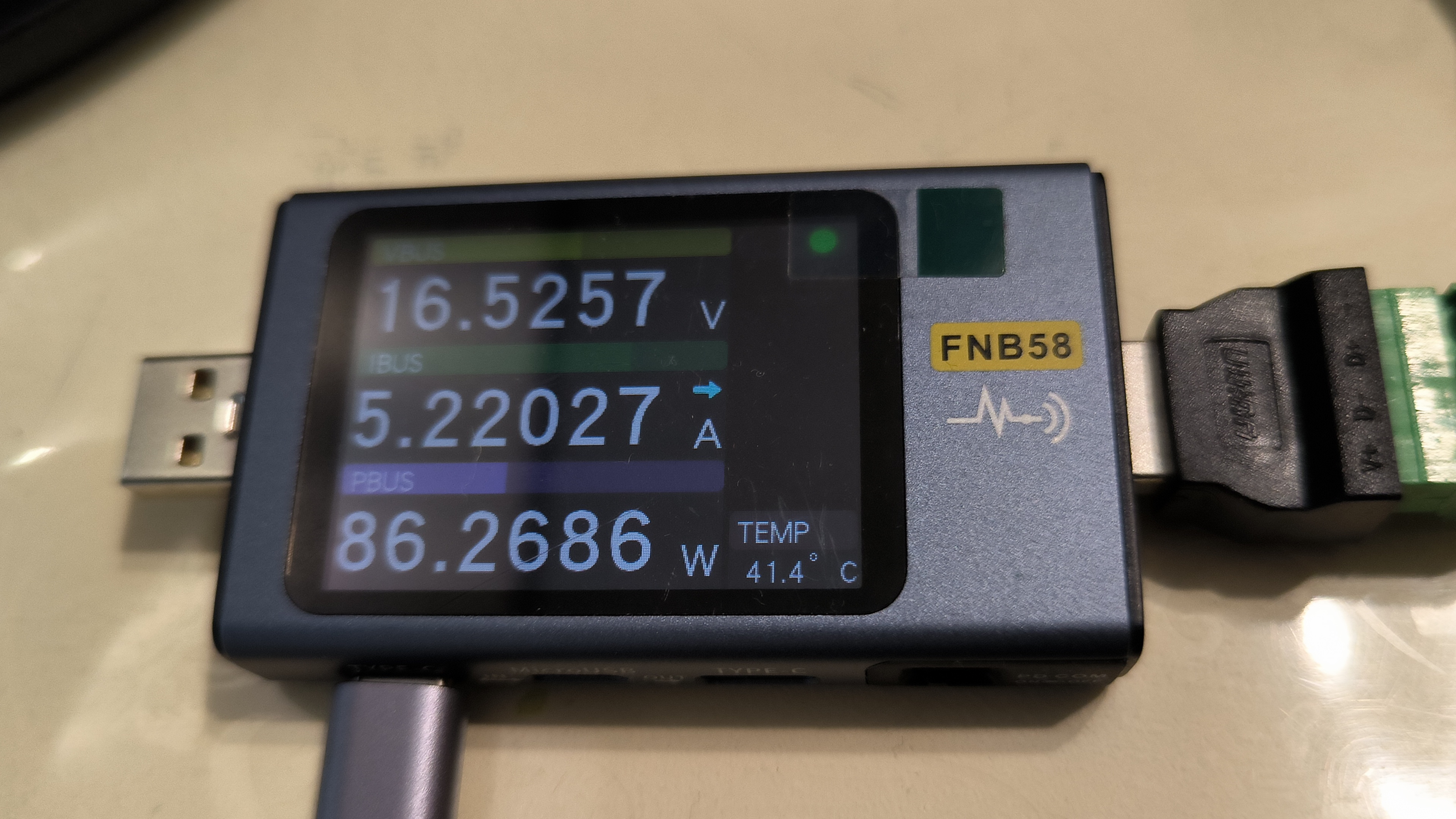 В тесте с более короткими итерациями (в программе выделено 1024МБ памяти), мне удалось измерить потребление по FNB58 (с сильной просадкой входного напряжения относительно 19В), и в итоге, оно колебалось в диапазоне между 80-90Вт, с периодическим падением во время завершения очередной итерации.