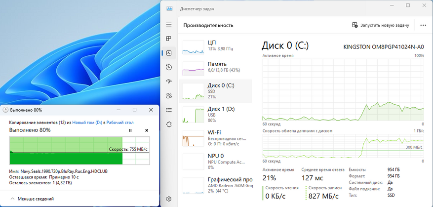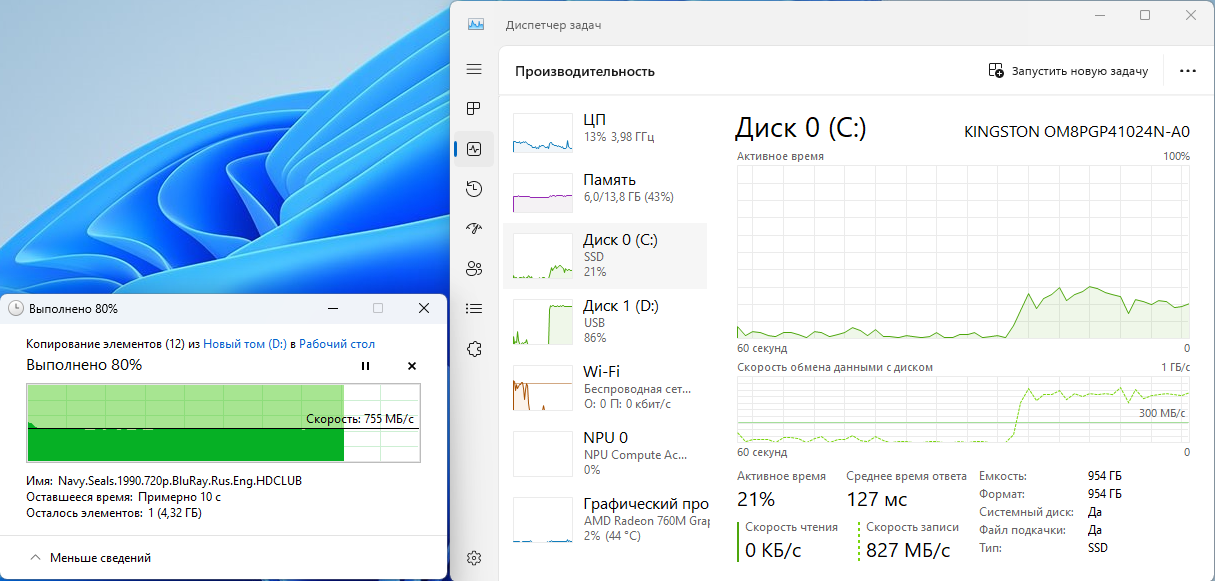 Что бы проверить какая реальная скорость записи будет у предустановленного SSD Kingston OM8PGP41024N, после заполнения SLC кэша, я решил записать на него папку с образом виртуальной машины (размер около 320ГБ), используя внешний SSD как источник данных. Перед началом записи, на тестируемом SSD было свободно 816ГБ.